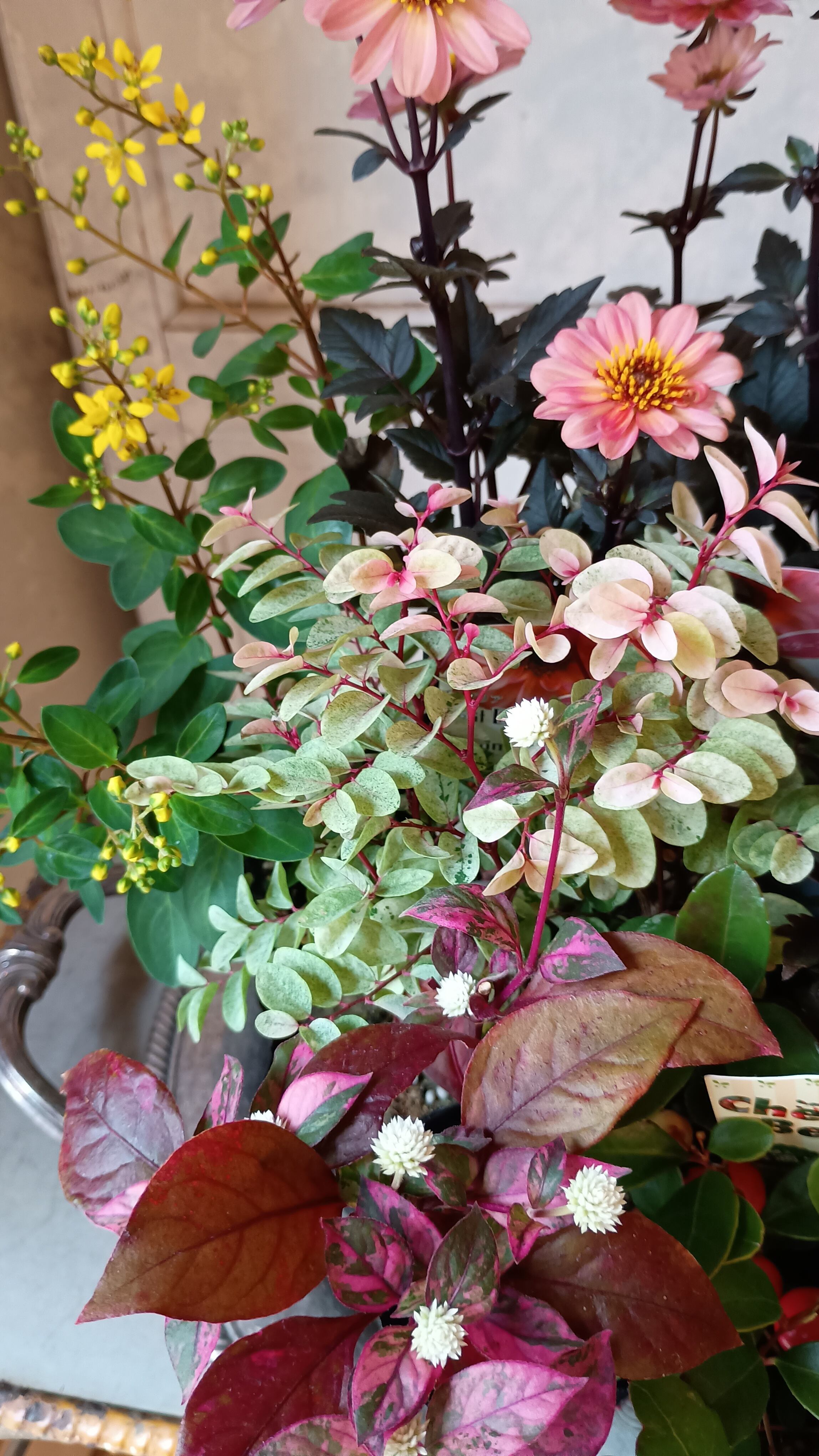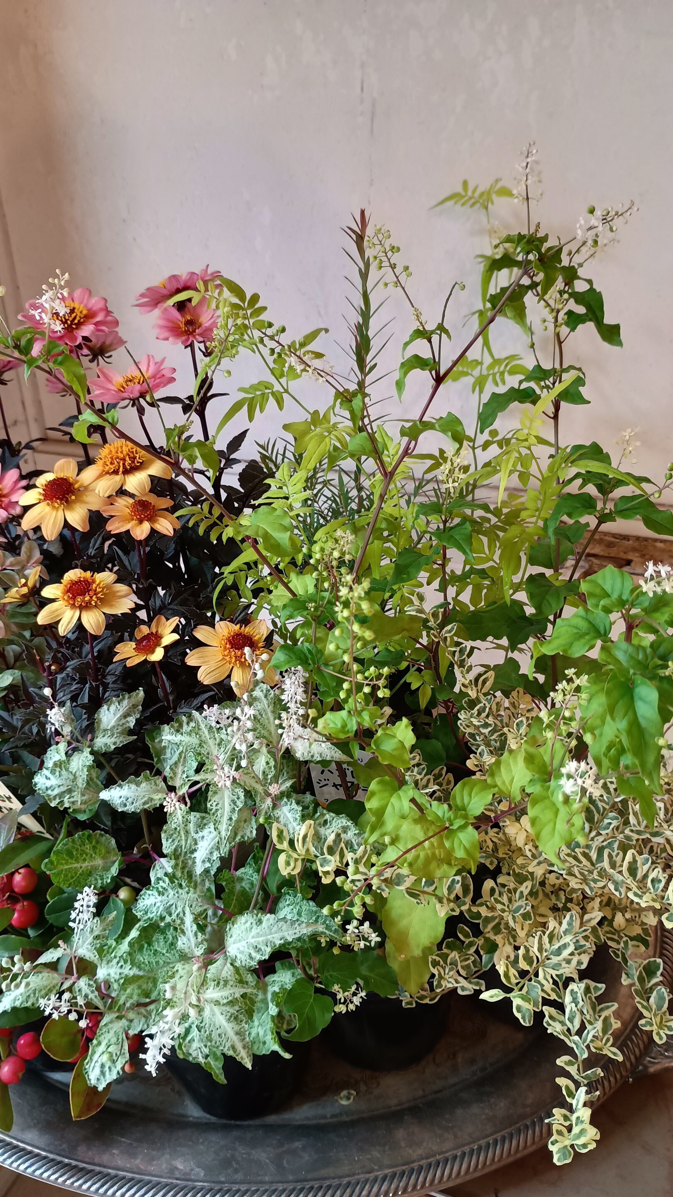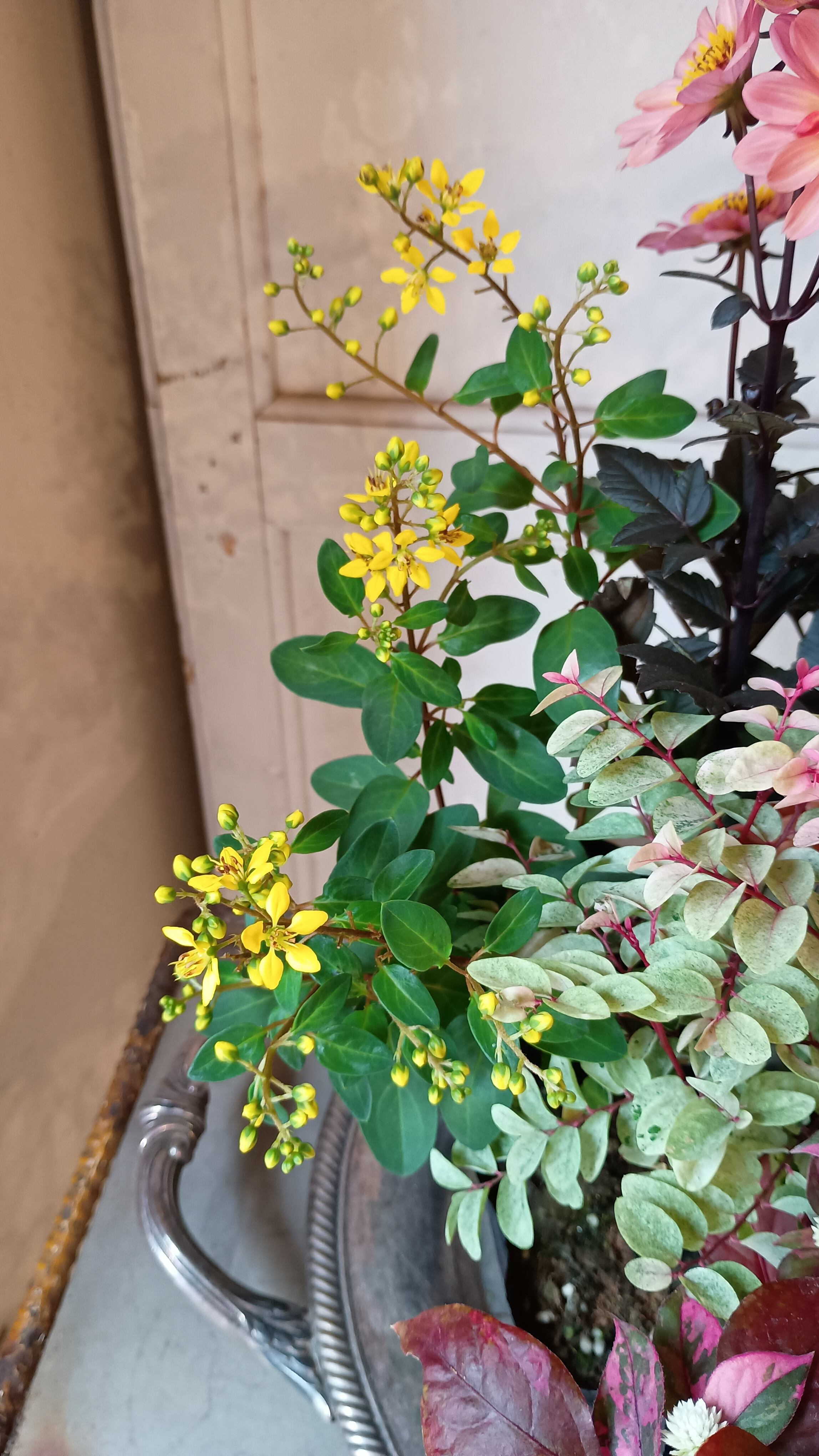 花材 プチダリアハミングブロンズ3,ジュズサンゴ2,斑入りジュズサンゴ絣1,洋種コバンノキ2、アルテルナンテラ、コウシュンカズラ、バーベナテネラ、ハゴロモジャスミン、プリペッドカスタードリップル、メラレウカ、チェッカーベリー