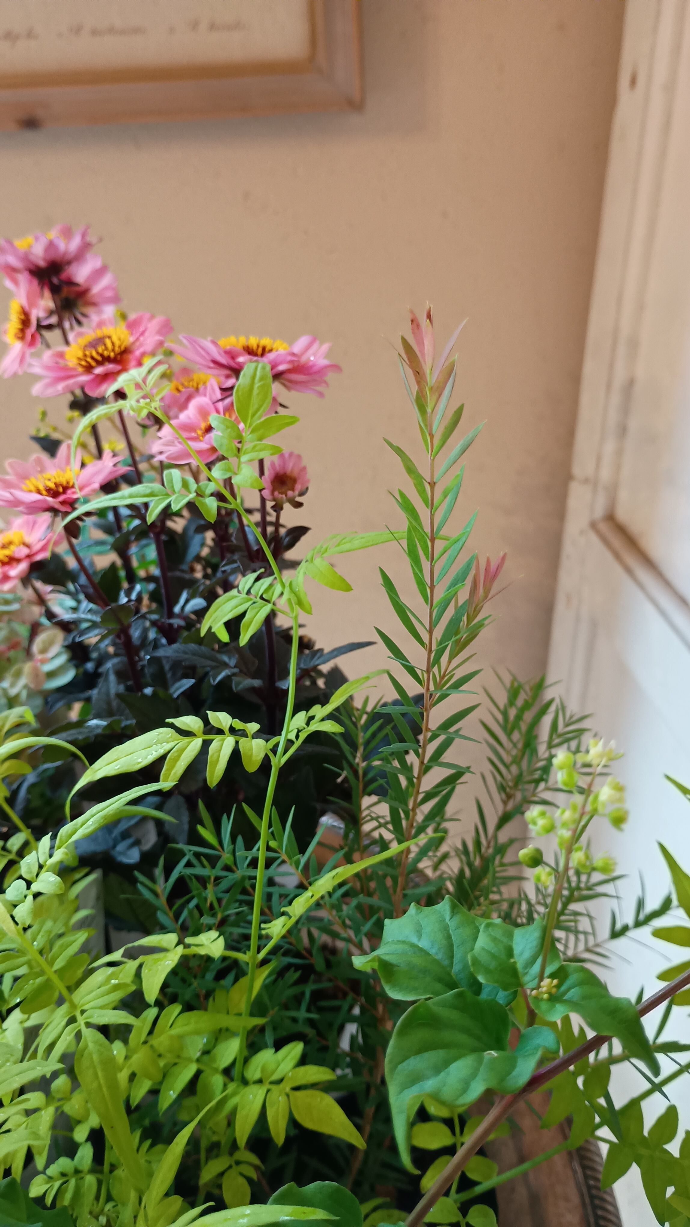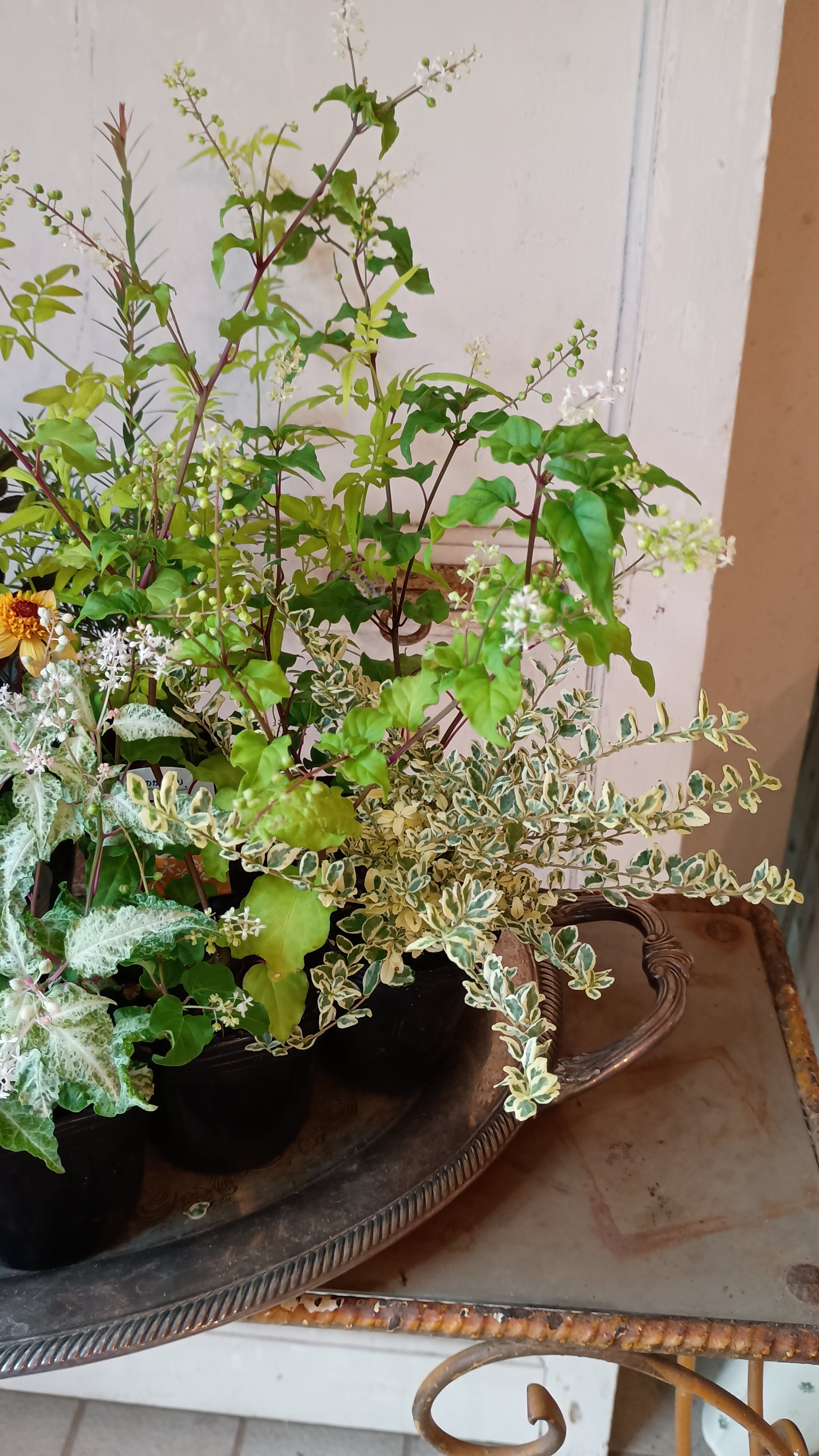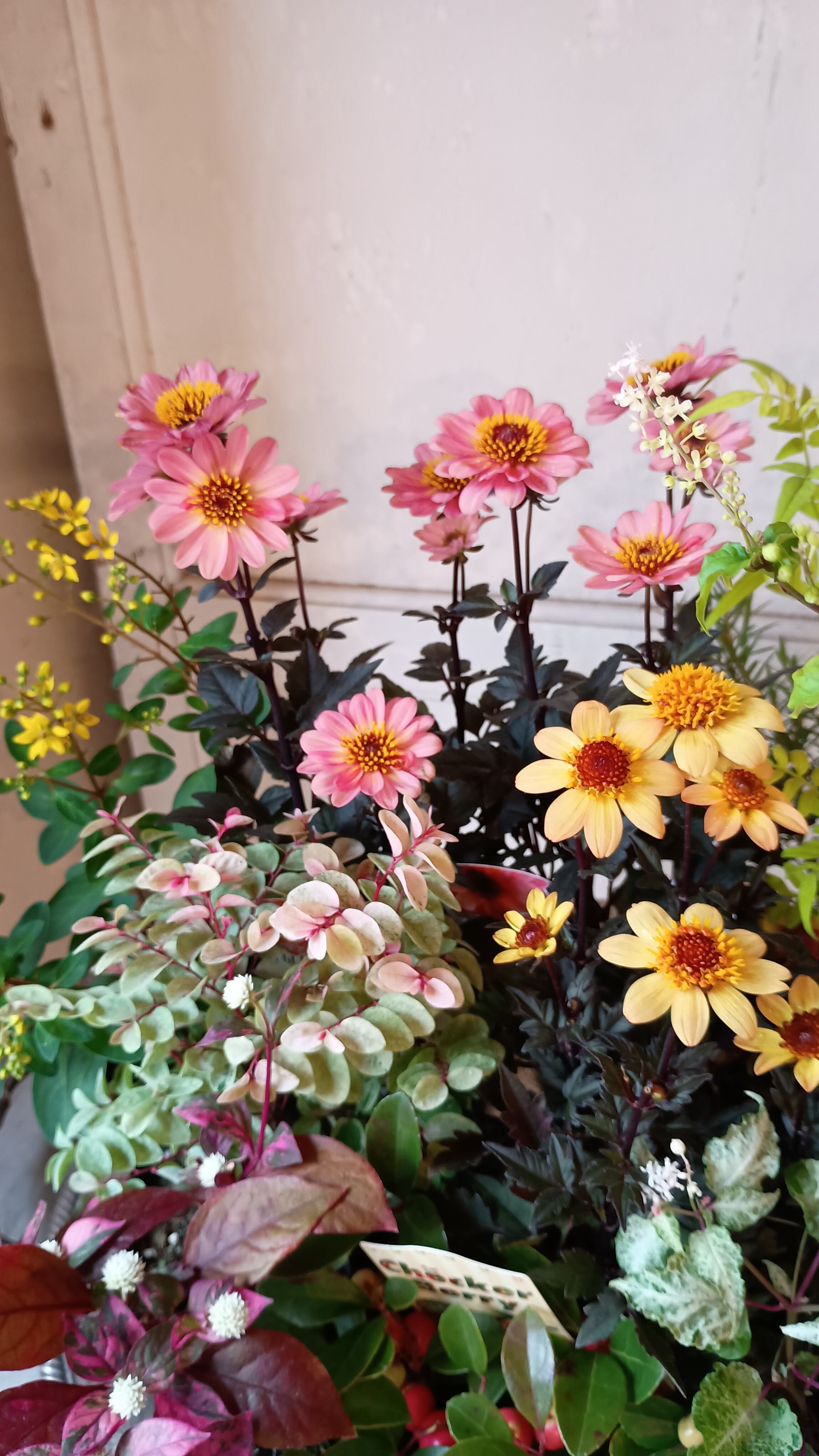 花材 プチダリアハミングブロンズ3,ジュズサンゴ2,斑入りジュズサンゴ絣1,洋種コバンノキ2、アルテルナンテラ、コウシュンカズラ、バーベナテネラ、ハゴロモジャスミン、プリペッドカスタードリップル、メラレウカ、チェッカーベリー