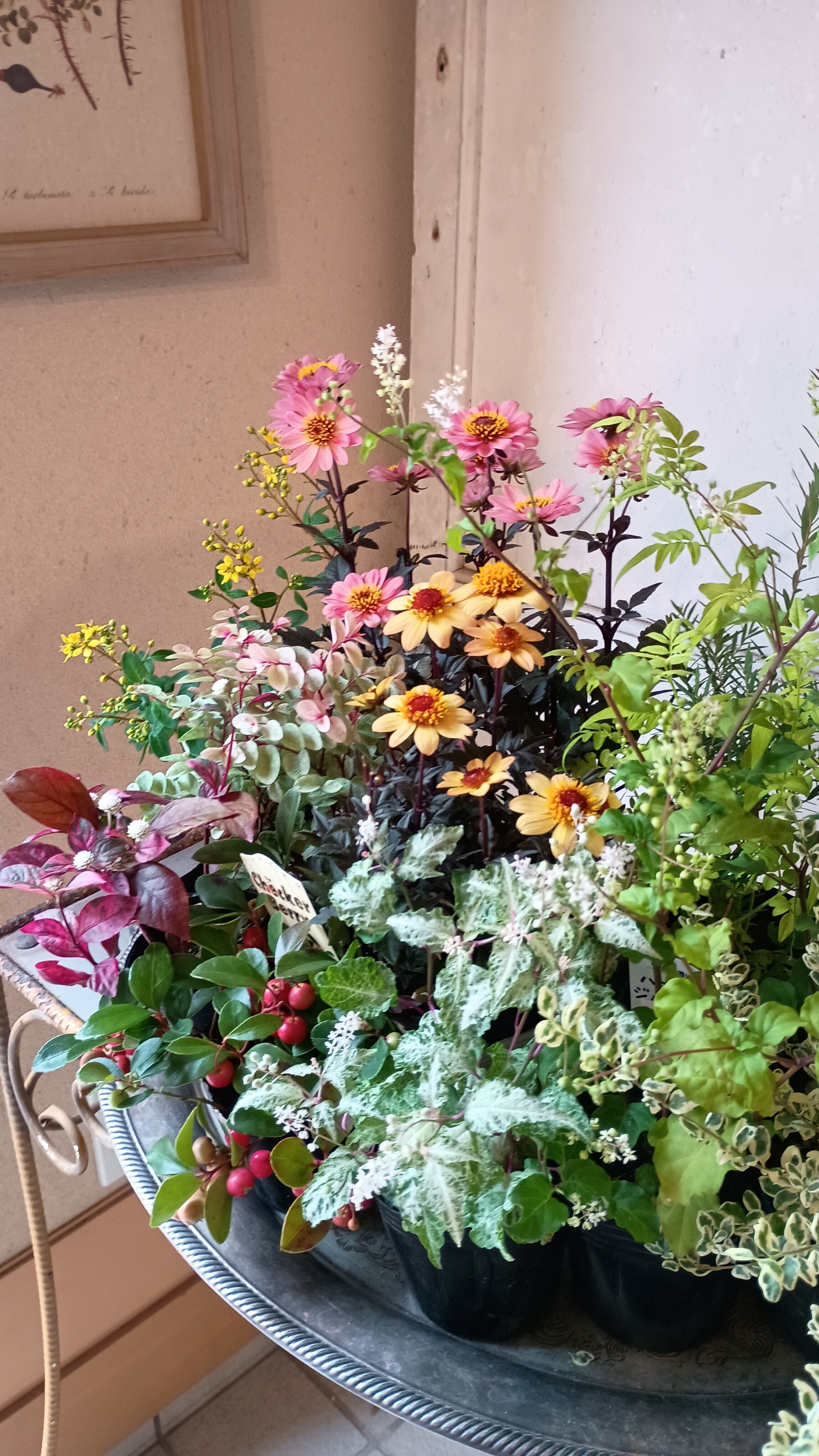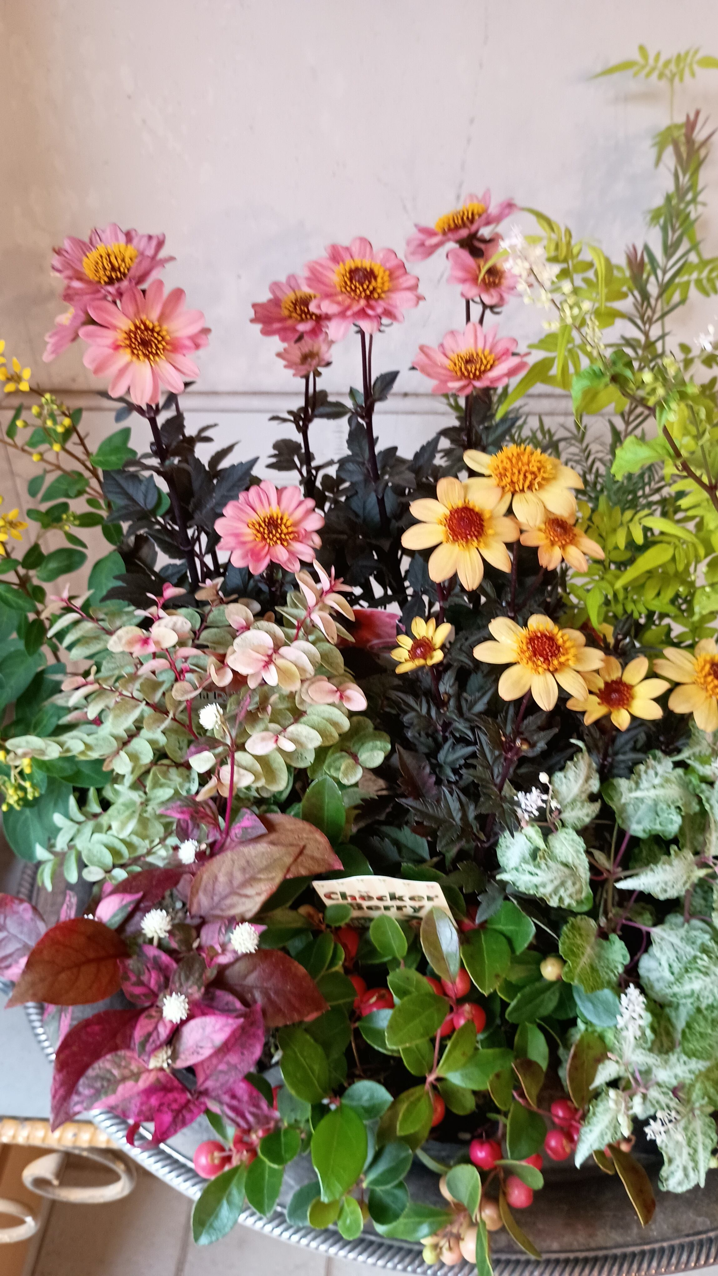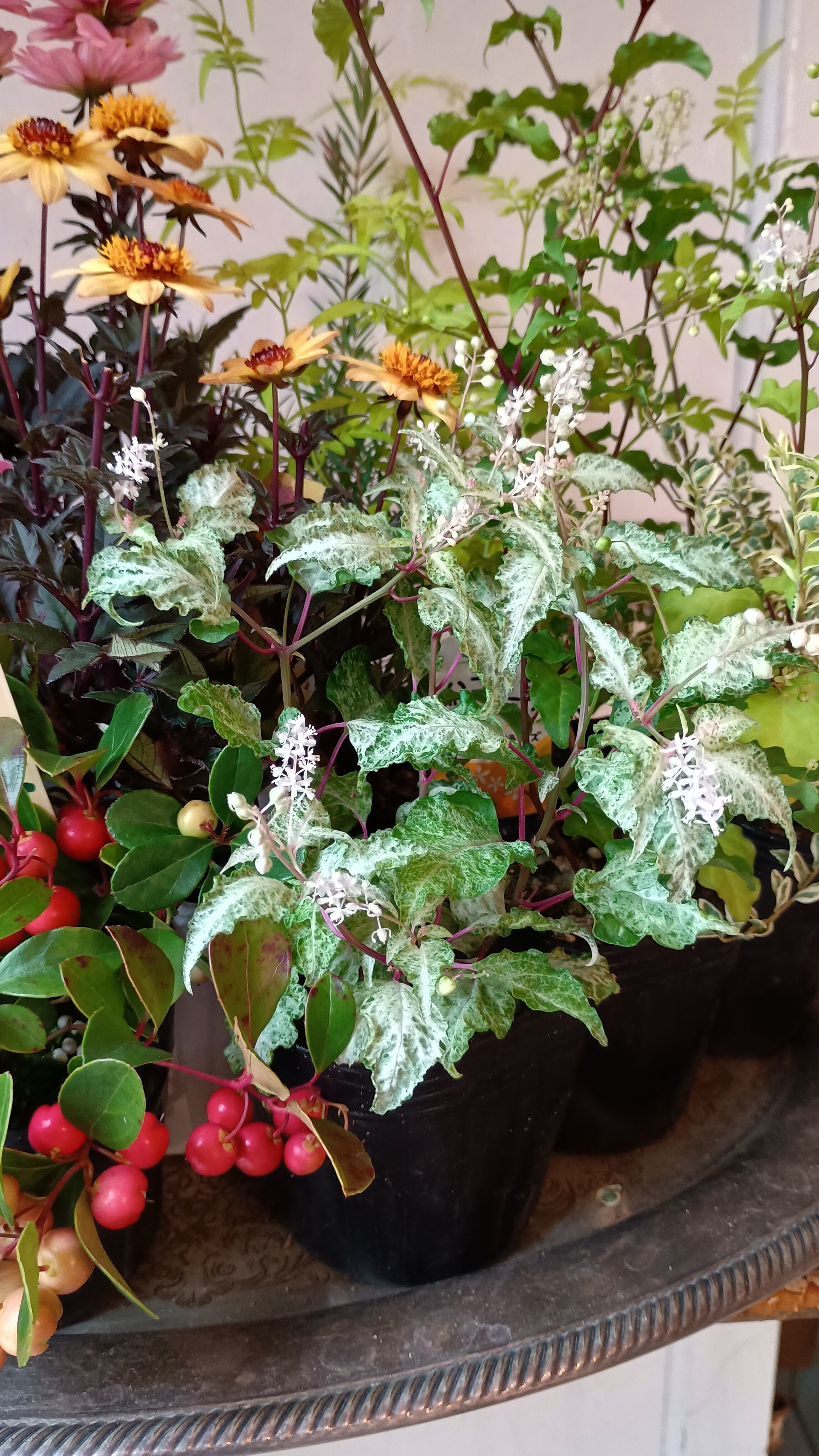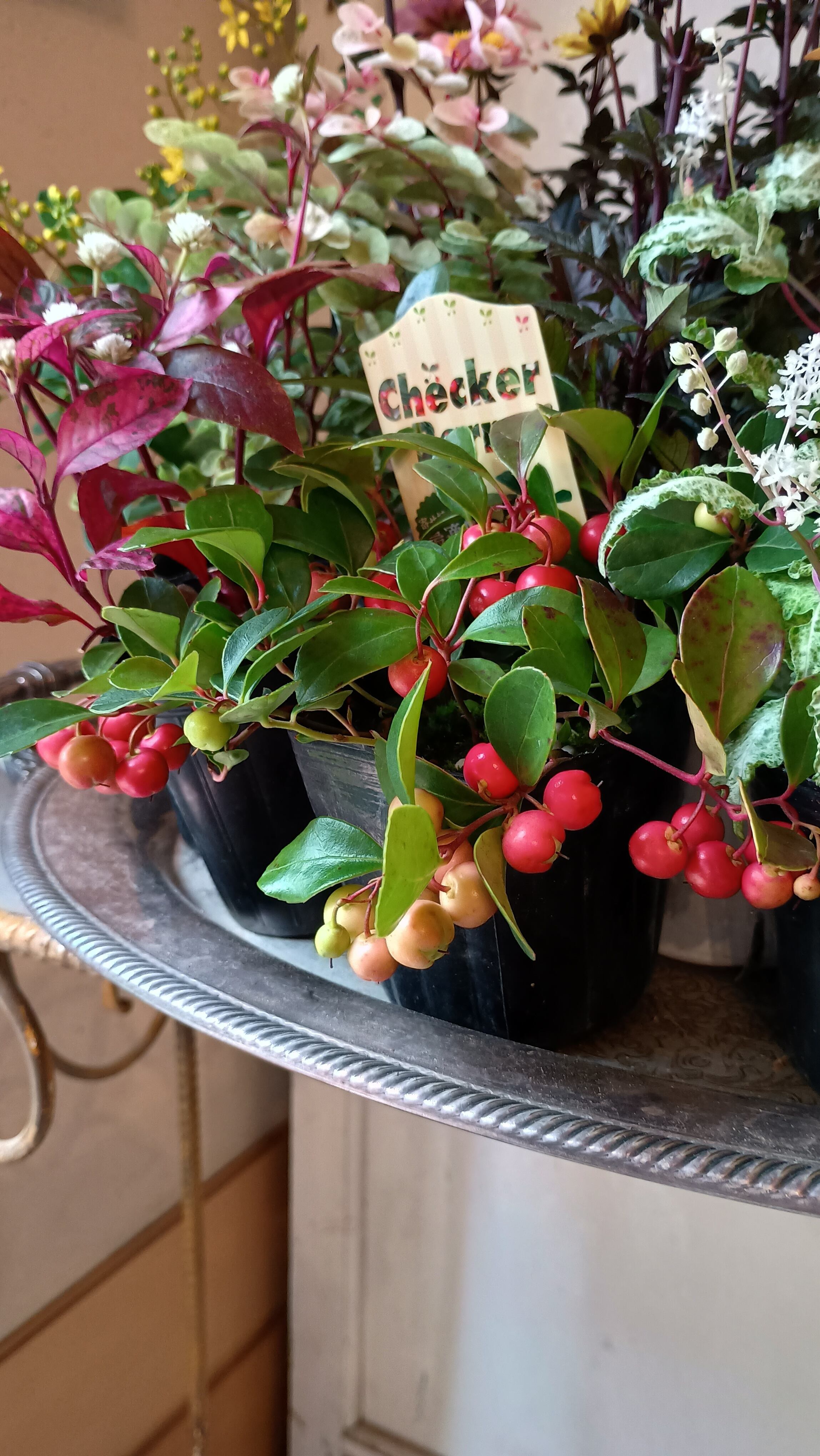 こっくりとしたサーモンピンク、イエローの花色とブラックの銅葉との対比が鮮やかなプチダリアハミングブロンズをカラフルなオータムリーフたっぷりの花苗セットです。プチダリアハミングブロンズは丈夫で庭植も可能です。ジュズサンゴは斑入り品質と2種類使用。小さい実がオレンジ、赤に色付いてきます。ピンクのグラデーションが美しい洋種コバンノキ、アルテルナンテラ、黄色の小花が可愛いコウシュンカズラ、明るいグリーンのバーベナ、ハゴロモジャスミン、プリペッドカスタードリップル、メラレウカとの対比が秋らしい鮮やかな寄せ植えを楽しめます。たっぷりと実ったチェッカーベリーは秋の代表アイテムです。だんだんと色付いていく秋を楽しんでいただける寄せ植え花苗セットです。
