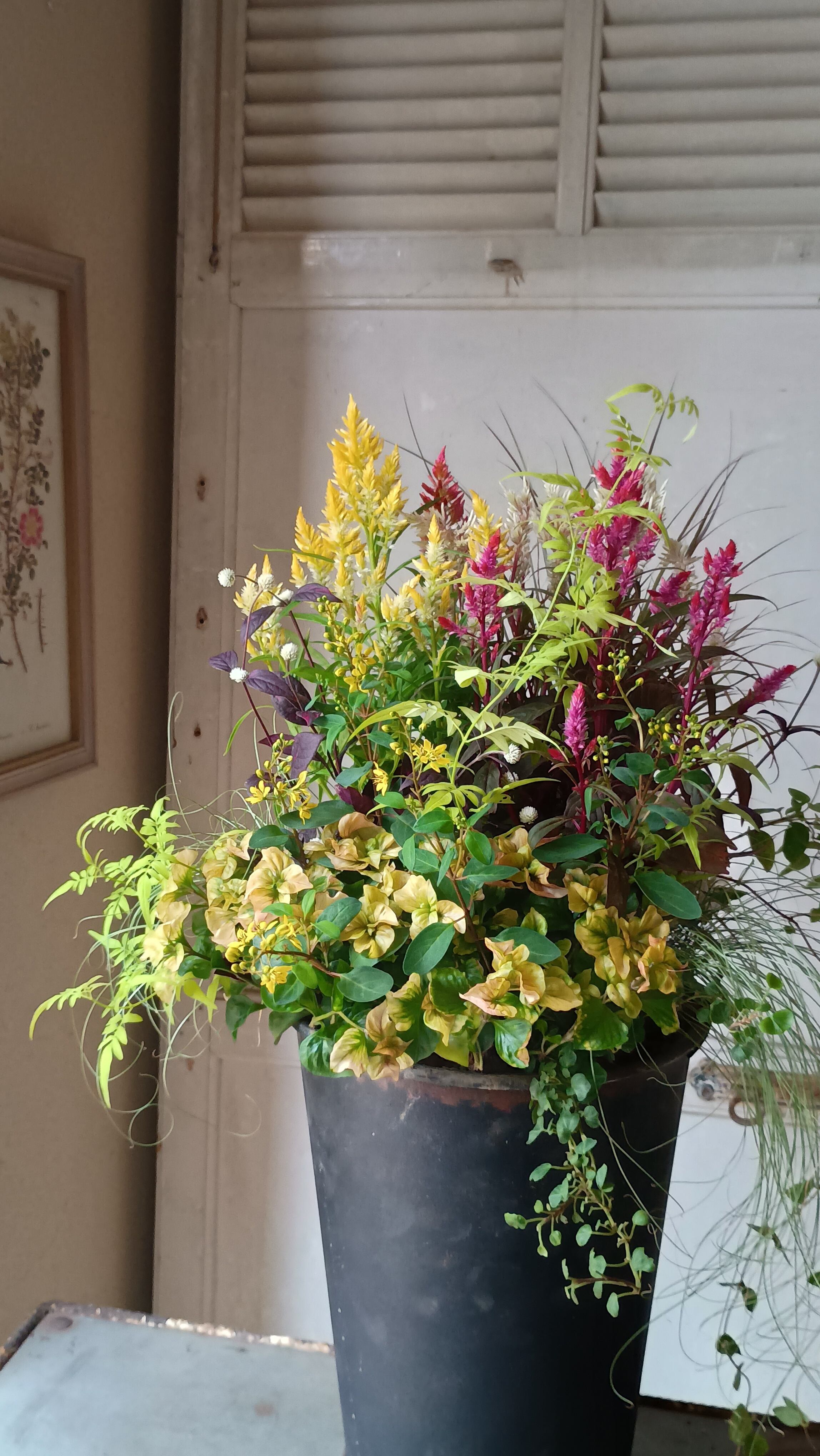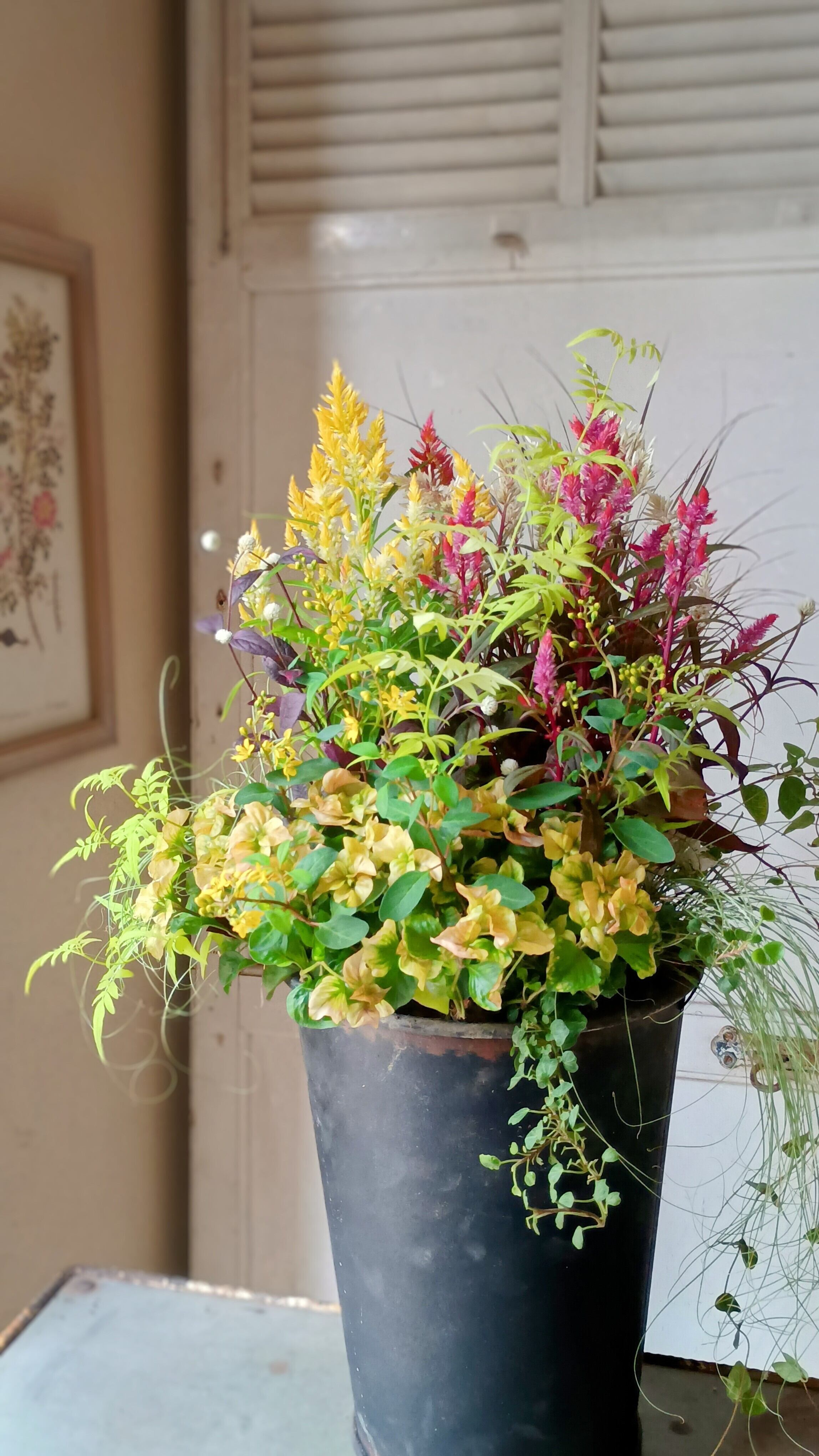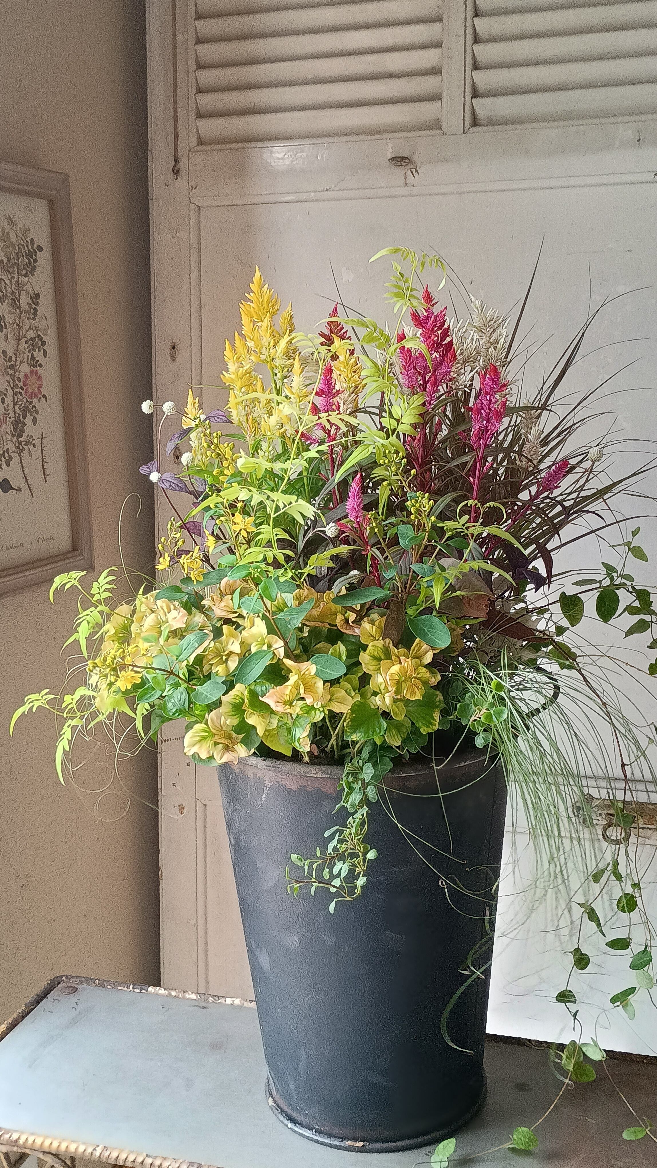 エレガントで美しい従来のイメージを覆すケイトウ「霧島の秋」育種家松永一氏が五穀豊穣を花で表現しようと十数年かけて育種選抜を続け92才にして完成されたケイトウです。霜が降りるころには花穂がフサフサのたてがみのようになり秋の澄んだ空気に揺れる様子は大変美しいです。零れ種でよく増えます。パープルファウンテングラス、アルテルナンテラ、コウシュンカズラなど秋らしいカラーリーフや小花と合わせ、華やかに仕上げました。エイジング加工されたブリキバケツは底穴があります。ココヤシチップと培養土をブレンドした土に植え込み軽くて移動も簡単です。華やかでスタイリッシュな秋の寄せ植えをお庭に飾ってみませんか?
