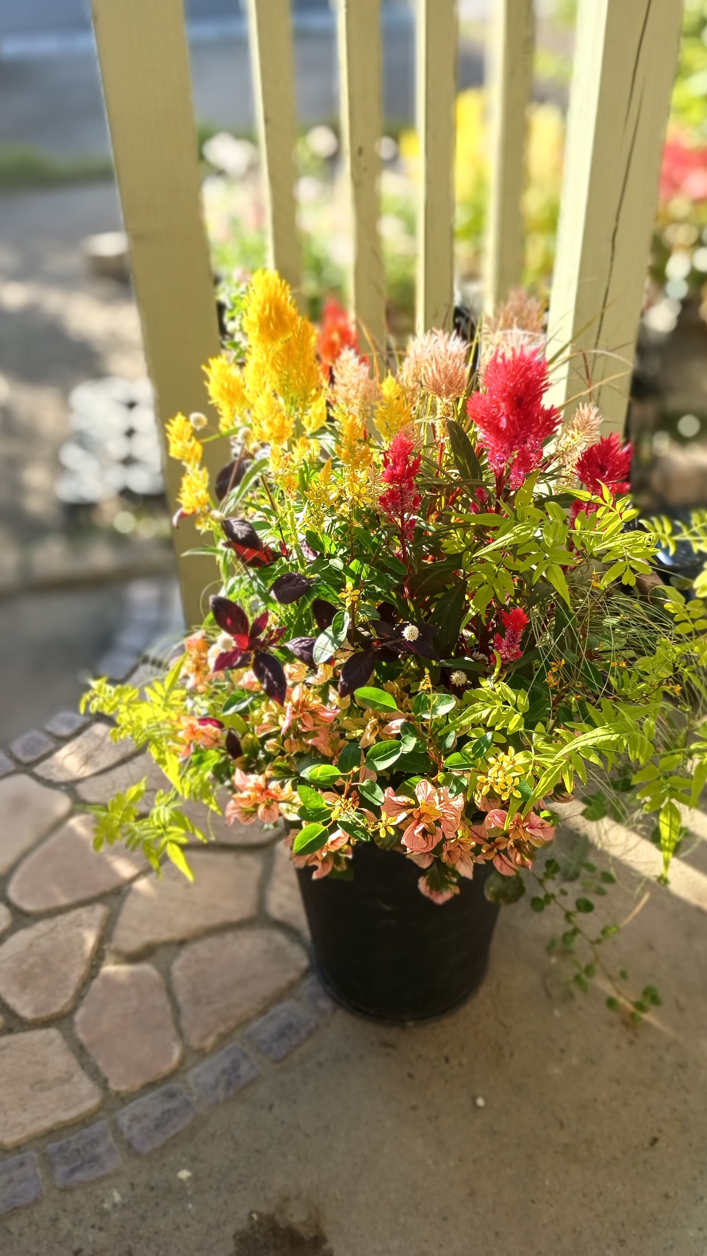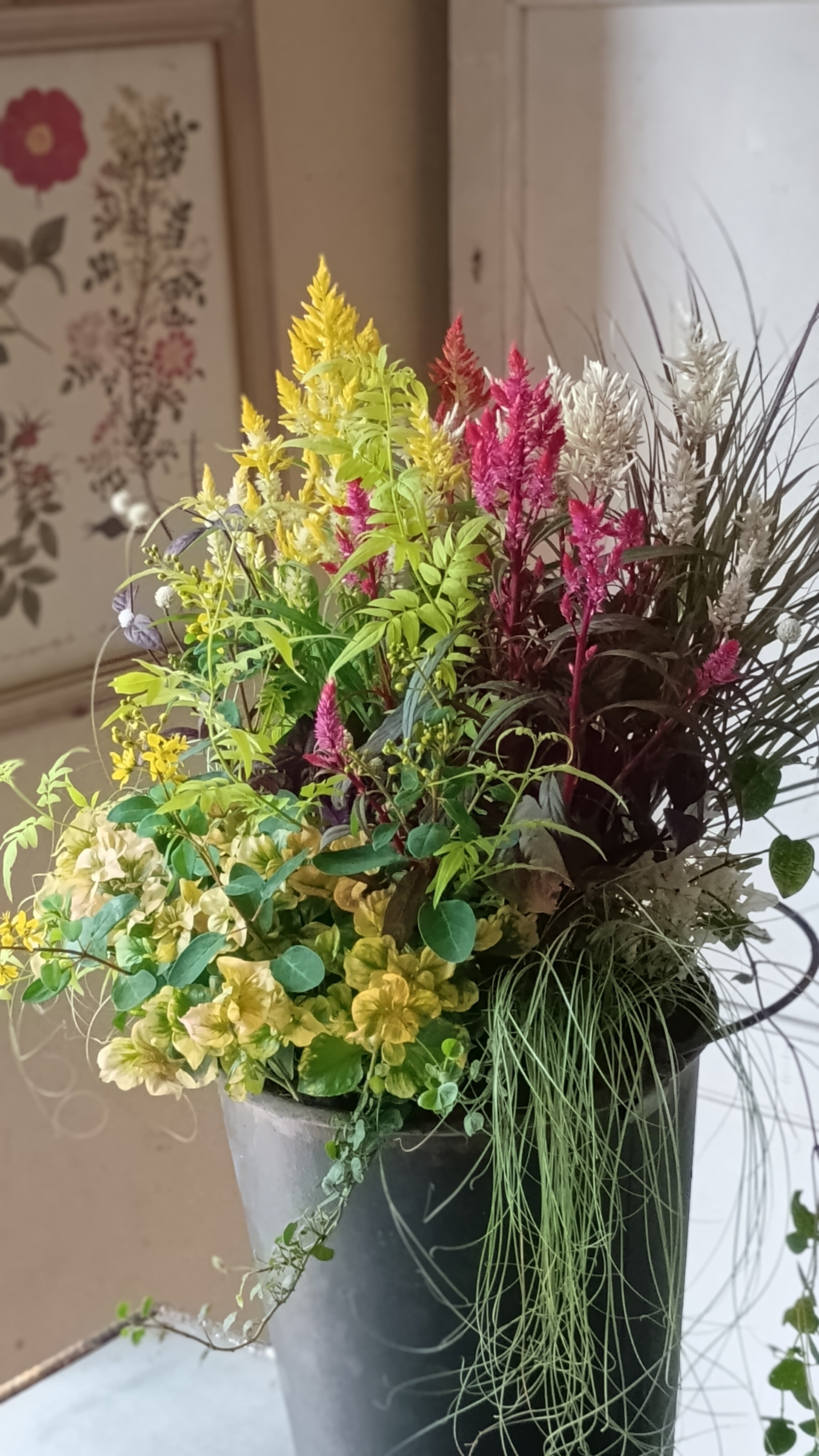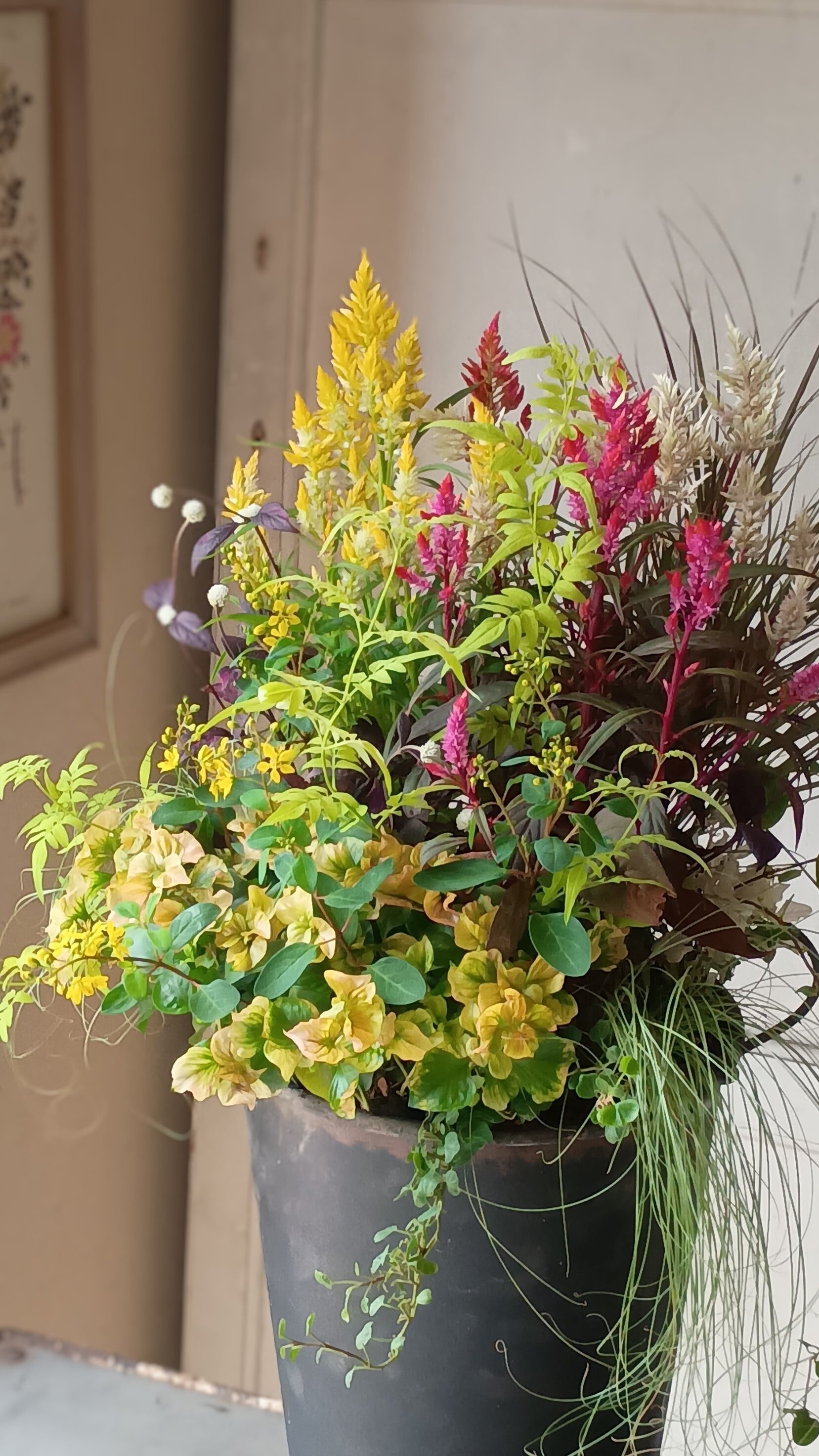エレガントで美しい従来のイメージを覆すケイトウ「霧島の秋」育種家松永一氏が五穀豊穣を花で表現しようと十数年かけて育種選抜を続け92才にして完成されたケイトウです。霜が降りるころには花穂がフサフサのたてがみのようになり秋の澄んだ空気に揺れる様子は大変美しいです。零れ種でよく増えます。パープルファウンテングラス、アルテルナンテラ、コウシュンカズラなど秋らしいカラーリーフや小花と合わせ、華やかに仕上げました。エイジング加工されたブリキバケツは底穴があります。ココヤシチップと培養土をブレンドした土に植え込み軽くて移動も簡単です。華やかでスタイリッシュな秋の寄せ植えをお庭に飾ってみませんか?