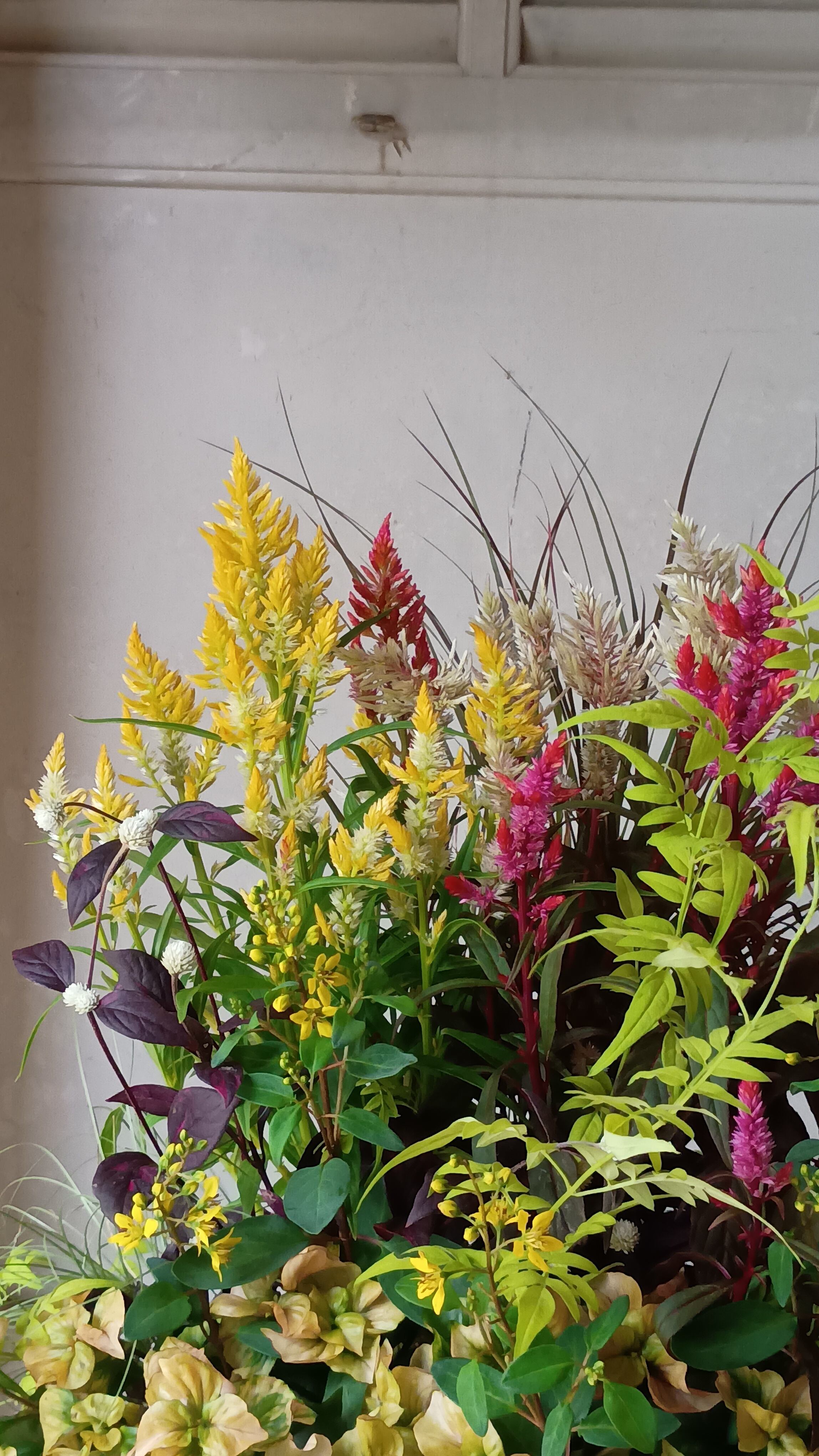花材 セロシア霧島の秋3、パープルファウンテングラス、アルテルナンテラレッドフラッシュ、アルテルナンテラファニードレス2,コウシュンカズラ、ハゴロモジャスミン、カレックス、アルテルナンテラエンジェルレース、ヘデラダックスフット、ハニーサックル