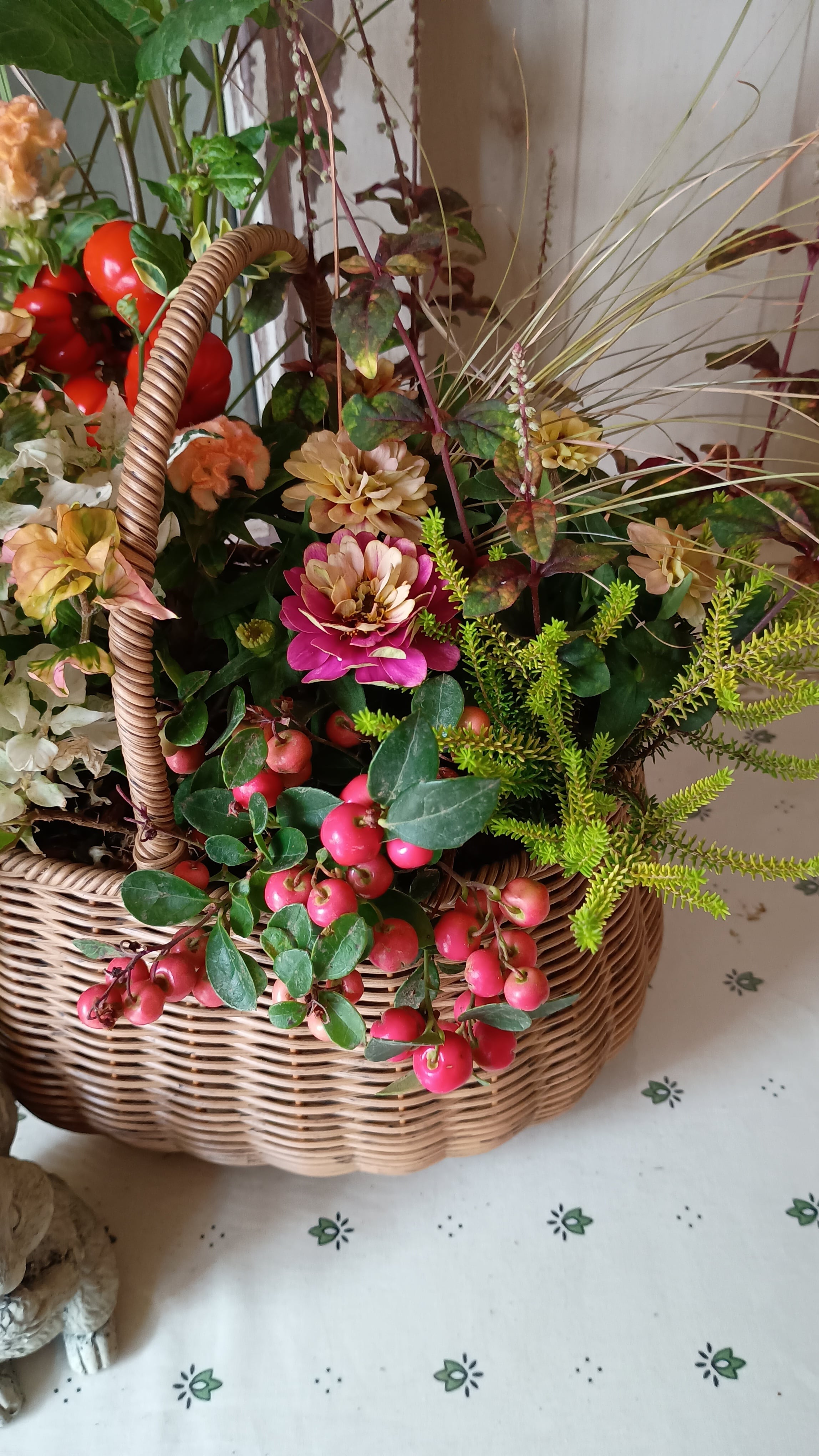 ピンクから琥珀色のグラデーションが楽しめる華やかなジニア「ジニュアンスタブルピーチテラコッタ」をソラナムパンプキンと寄せ植えしたハロウィンの寄せ植えです。オレンジピンクの絶妙なグラデーションで人気のアルテルナンテラ「ファニードレス」とホワイトカラーのアルテルナンテラを華やかに合わせました。オレンジピンクのセロシアジュラサーモン、溢れるような赤い実がかわいいチェッカーベリーを配してかわいいハロウィンカラーの寄せ植えに仕上げました。秋遅くまで楽しめる華やかな寄せ植えです。