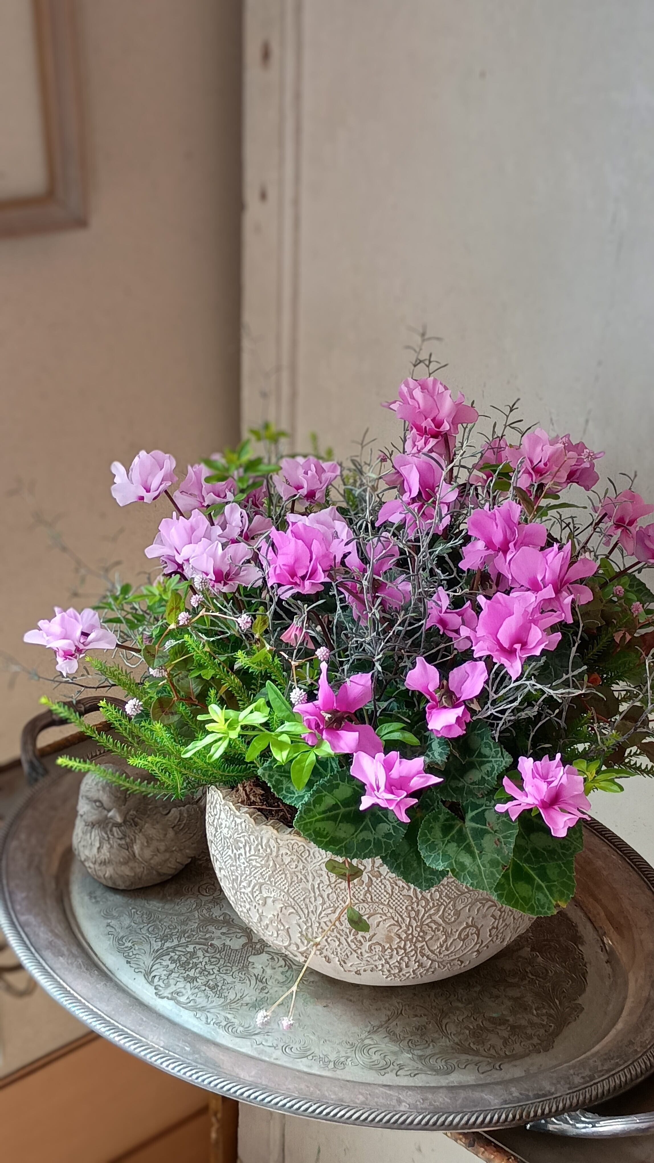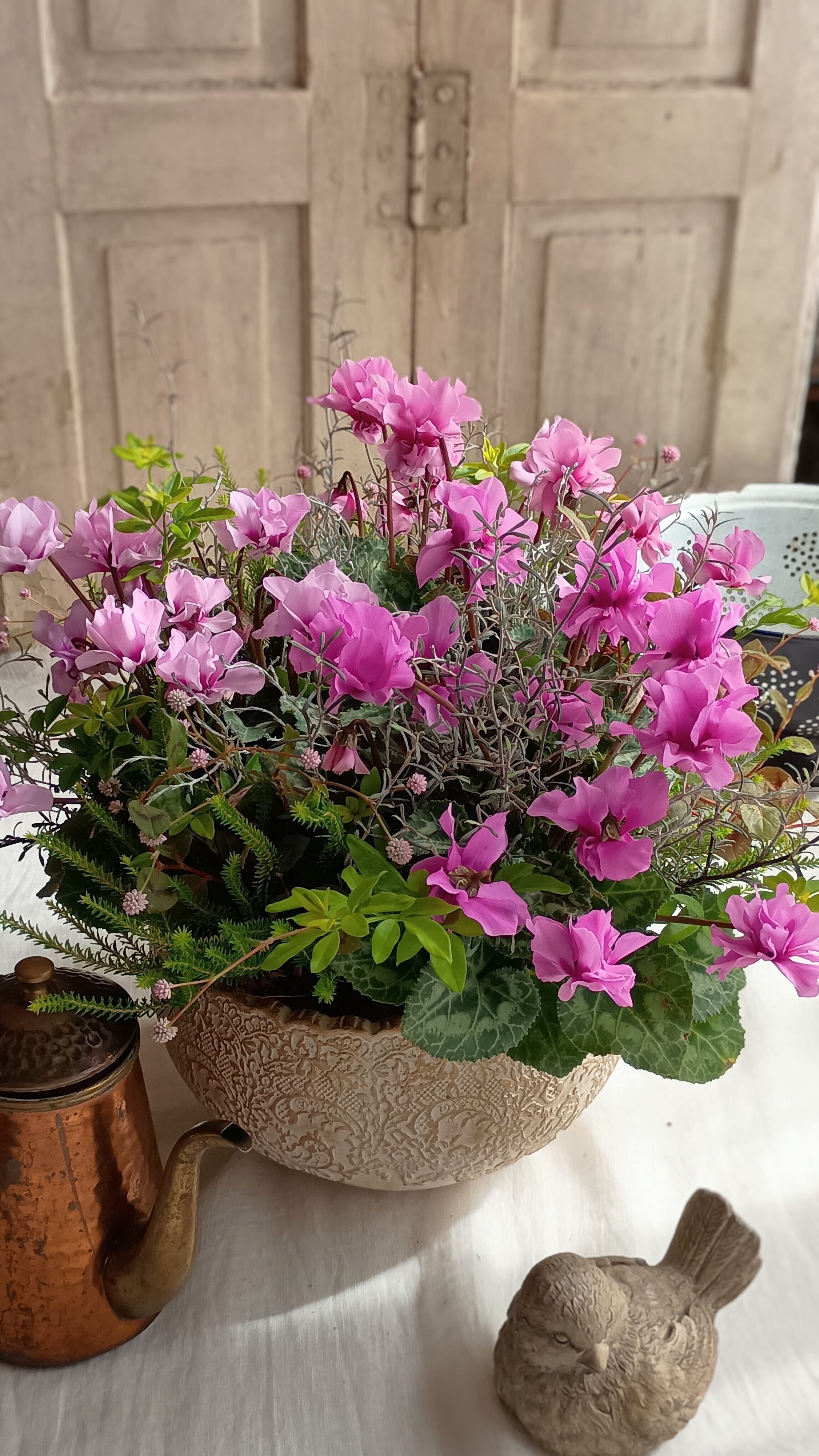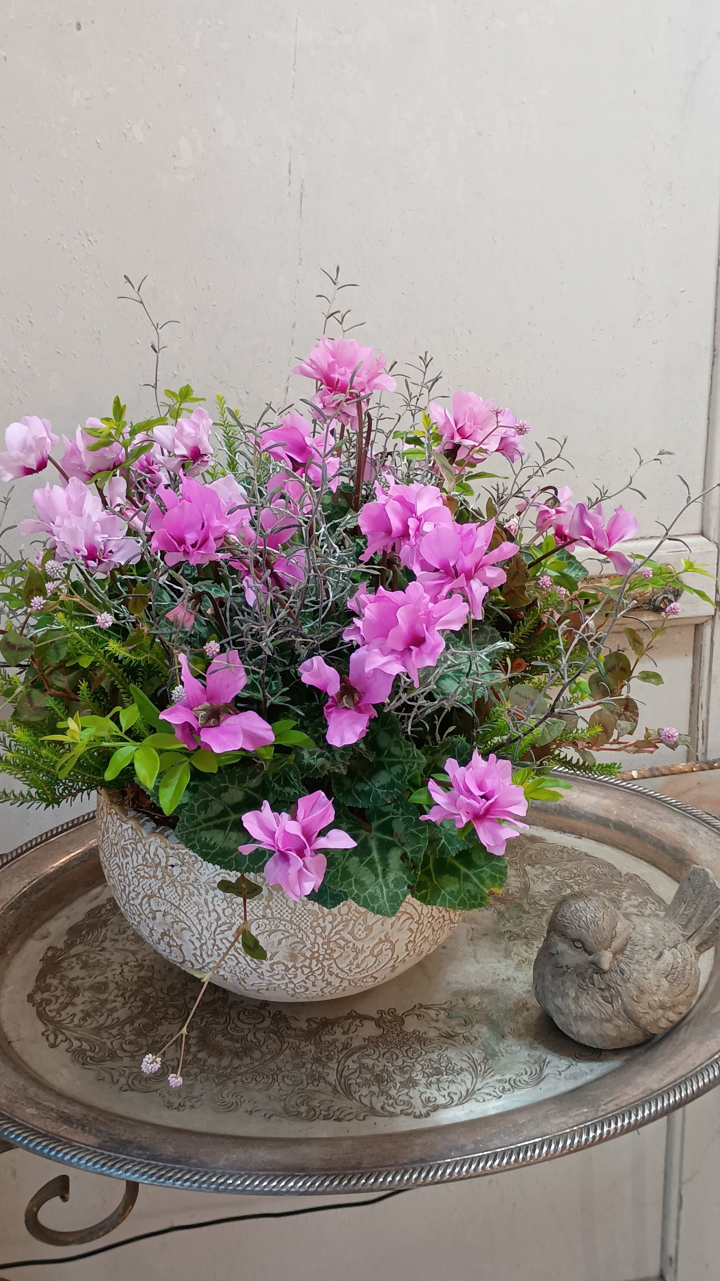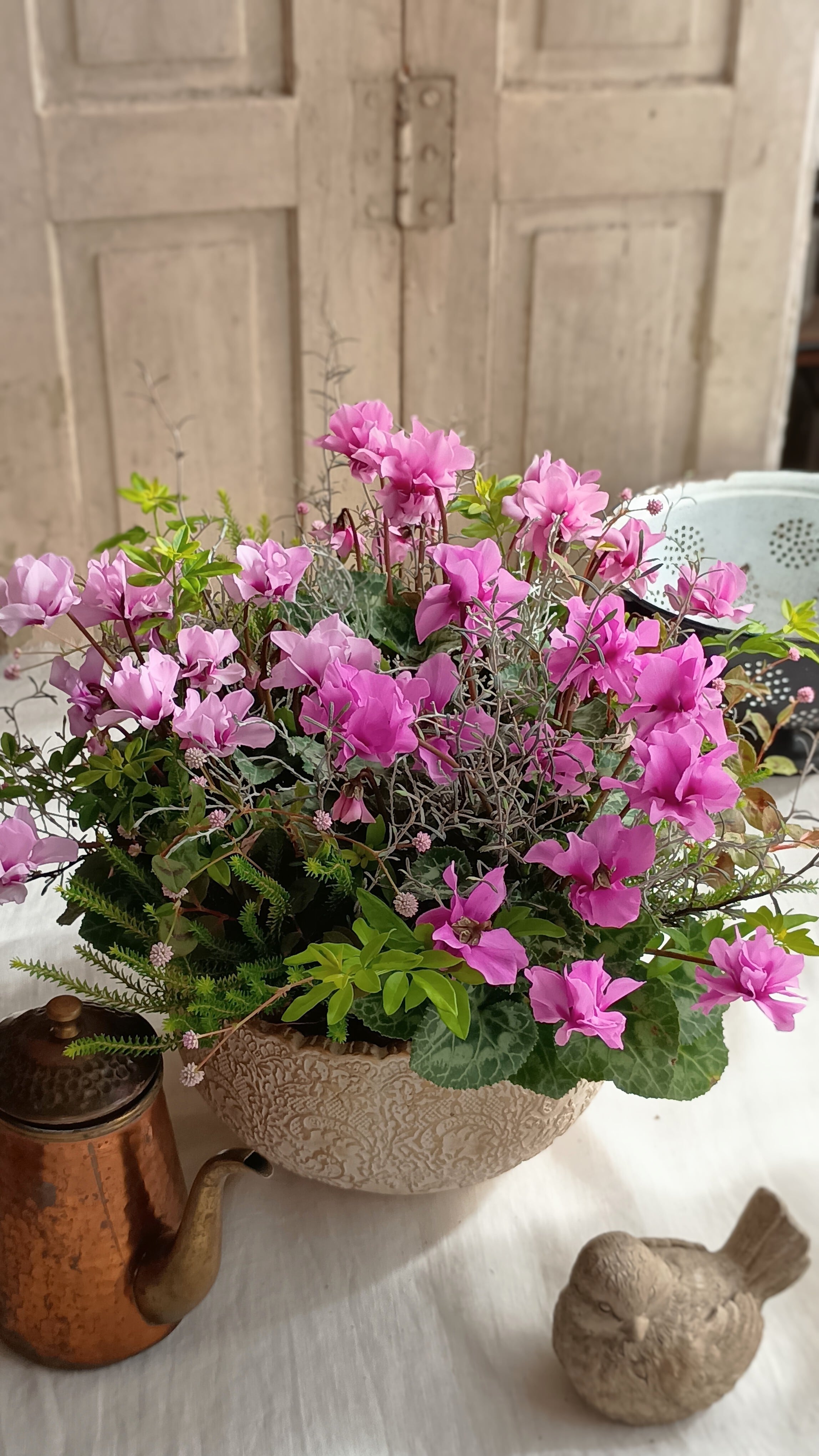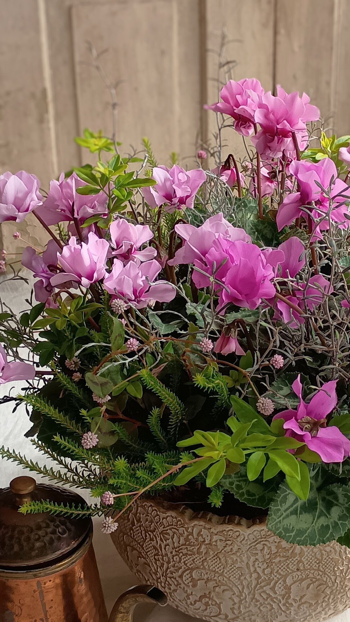 八重咲きミニシクラメン「プティムーラン」の華やかギャザリング寄せ植え