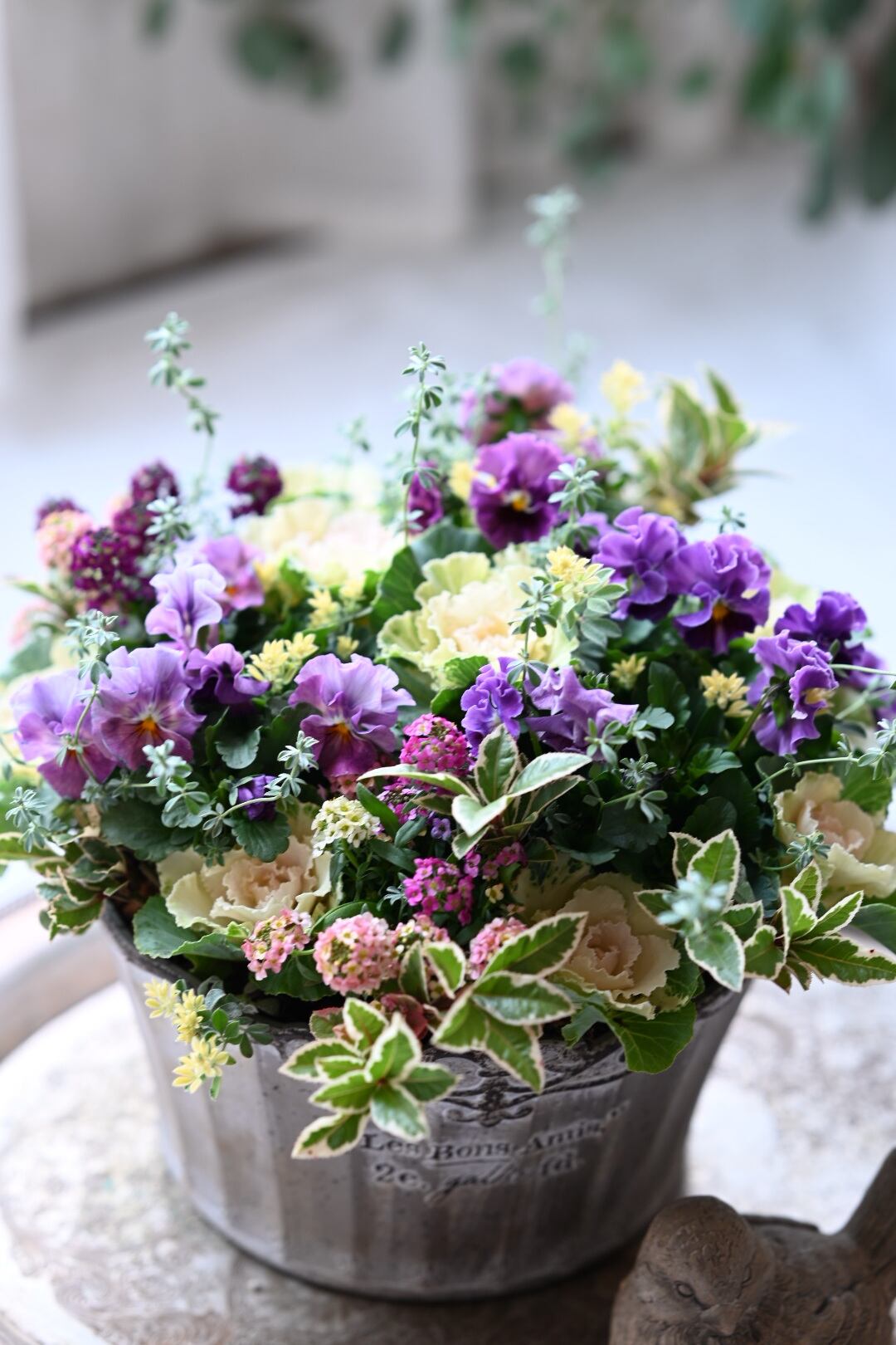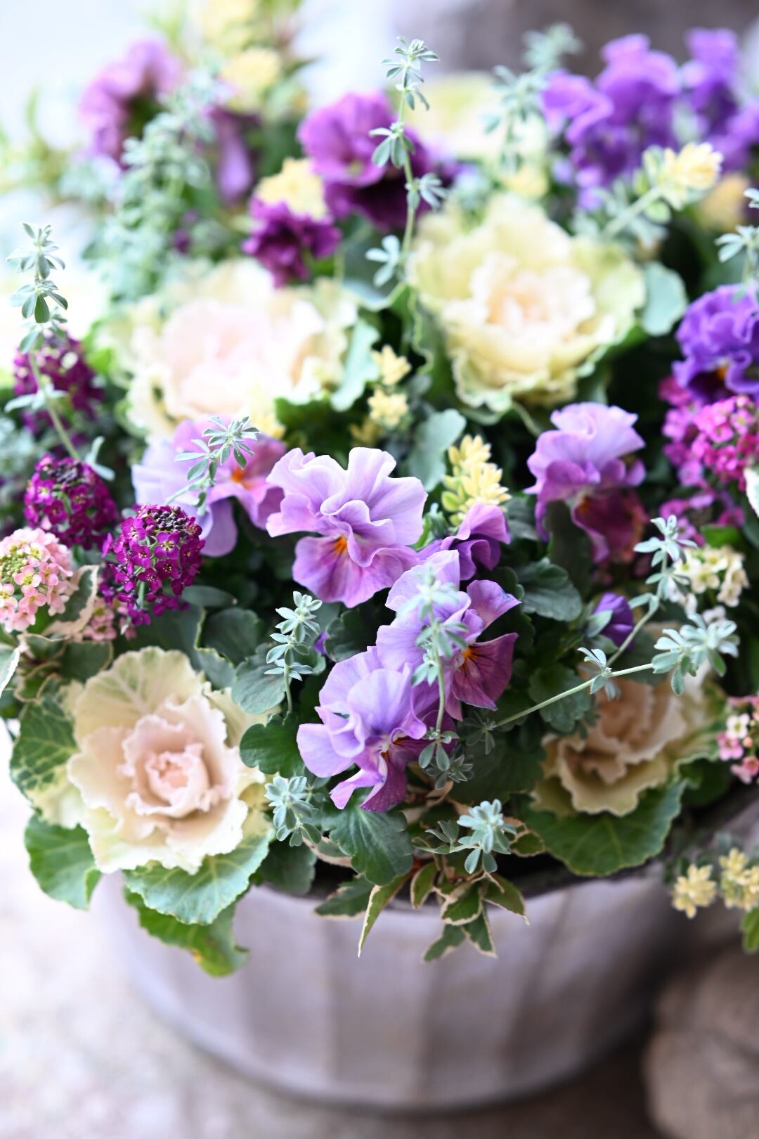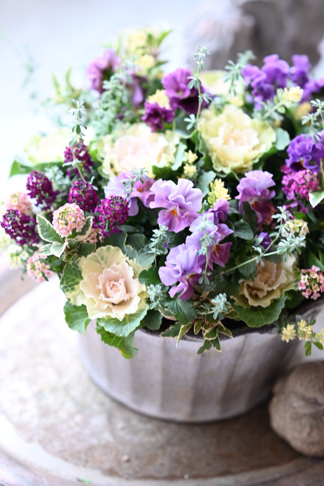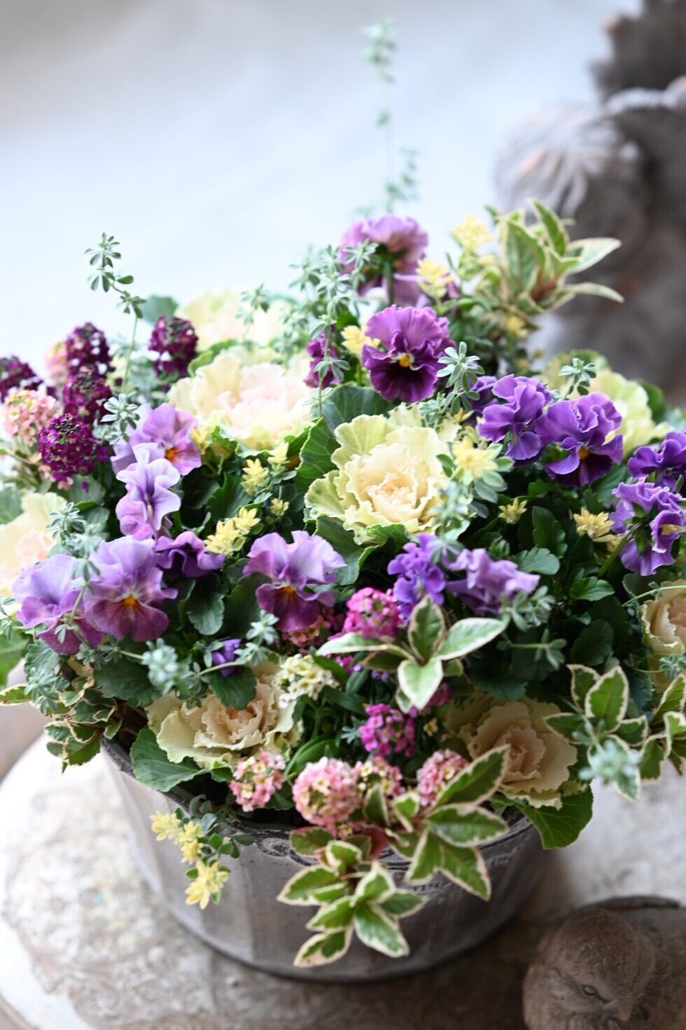 薔薇のような小さなハボタン「ベイビーチュール」紫のフリルビオラをアリッサム、グリーンと合わせてケーキのように植え込みました。ハボタンとフリルビオラ、アリッサムがピンクから紫のグラデーションとなって上品な可愛いらしさです。グリーンにはロータスプリムストン、ロータスクレティクス、斑入りヤブコウジを使用。春まで長く楽しめる華やかなギャザリング寄せ植えです。