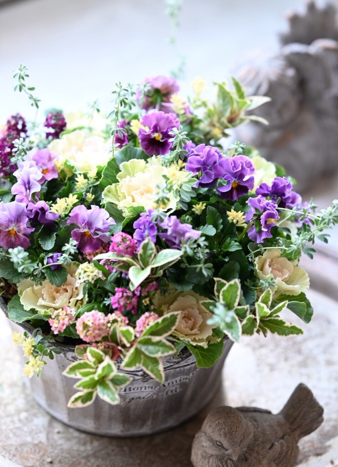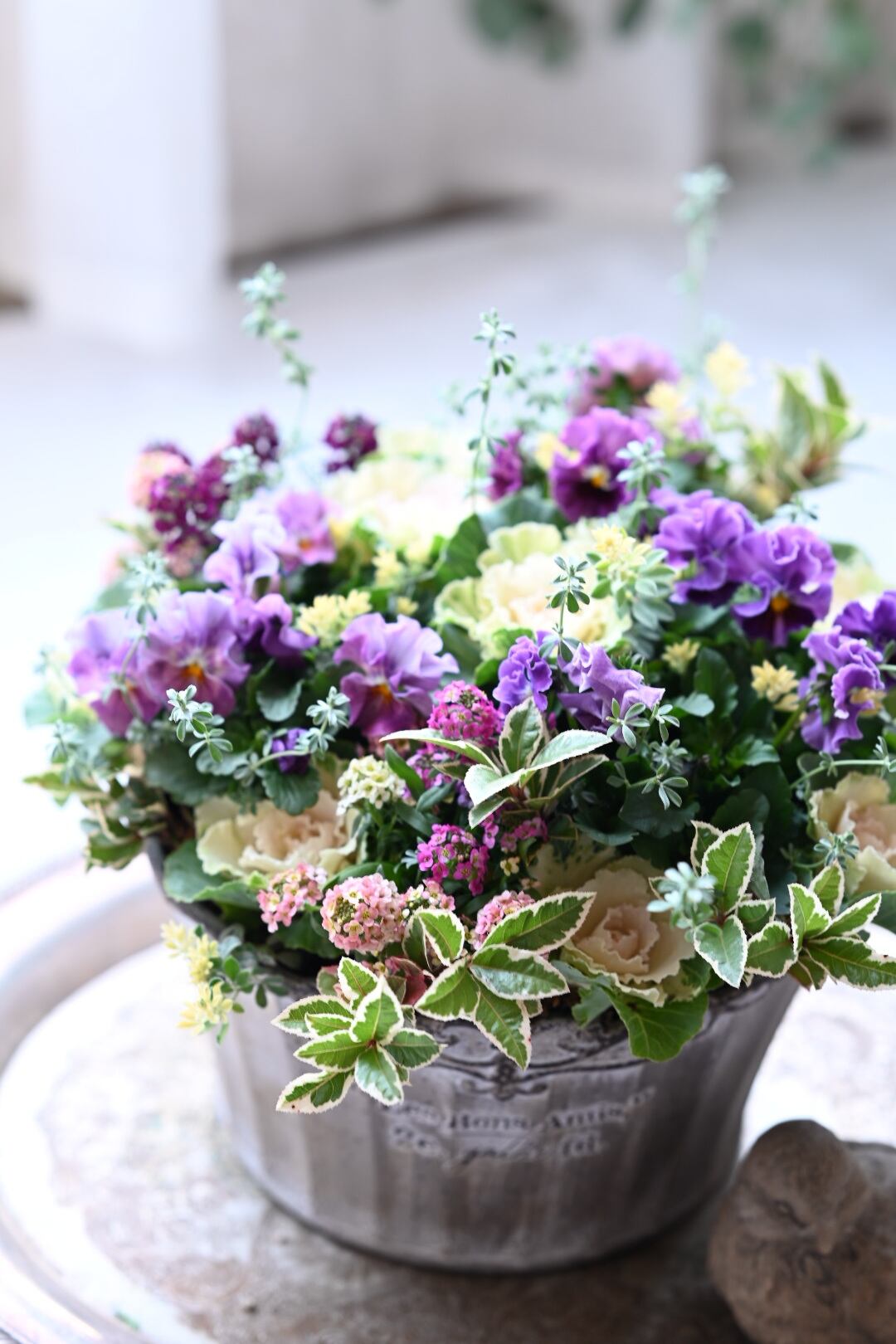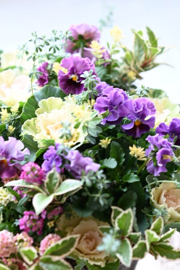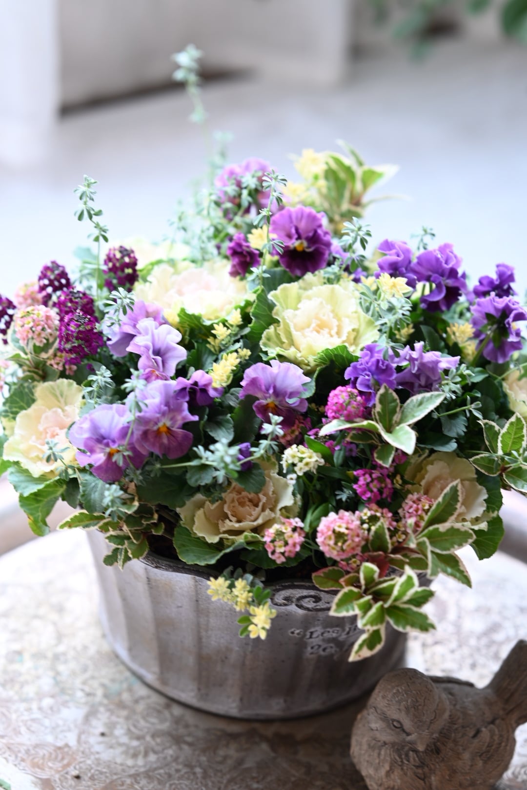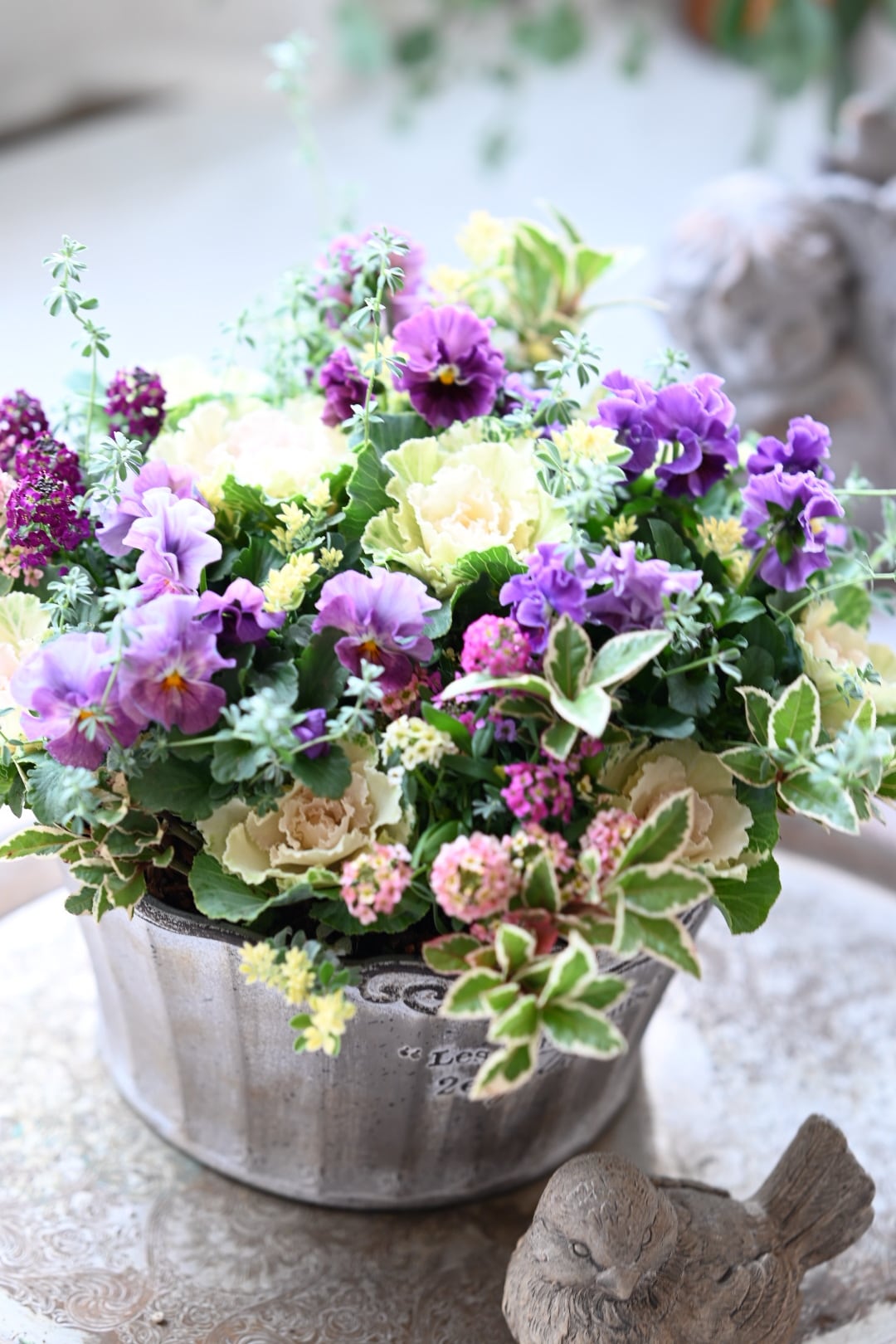 薔薇のような小さなハボタン「ベイビーチュール」紫のフリルビオラをアリッサム、グリーンと合わせてケーキのように植え込みました。ハボタンとフリルビオラ、アリッサムがピンクから紫のグラデーションとなって上品な可愛いらしさです。グリーンにはロータスプリムストン、ロータスクレティクス、斑入りヤブコウジを使用。春まで長く楽しめる華やかなギャザリング寄せ植えです。
