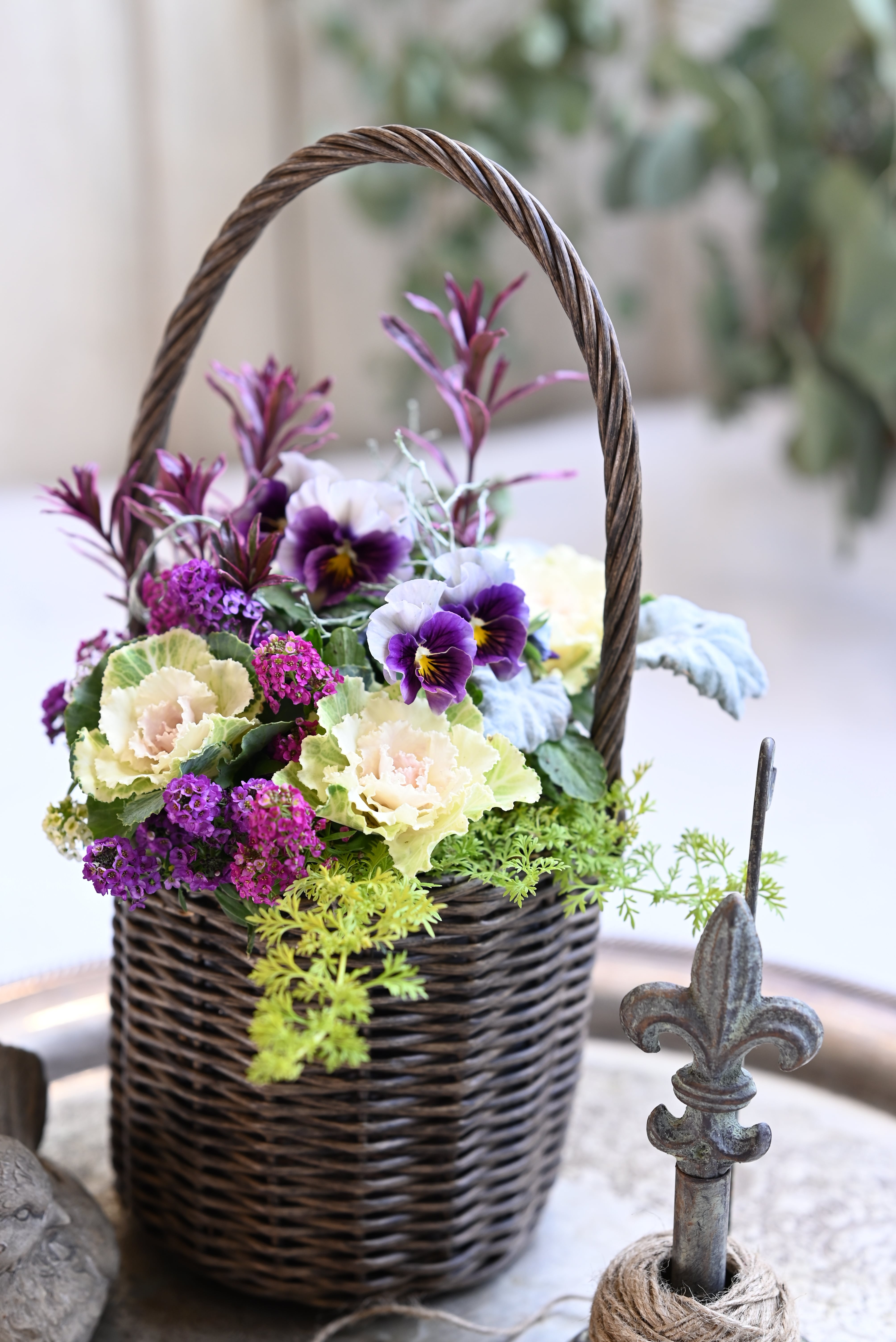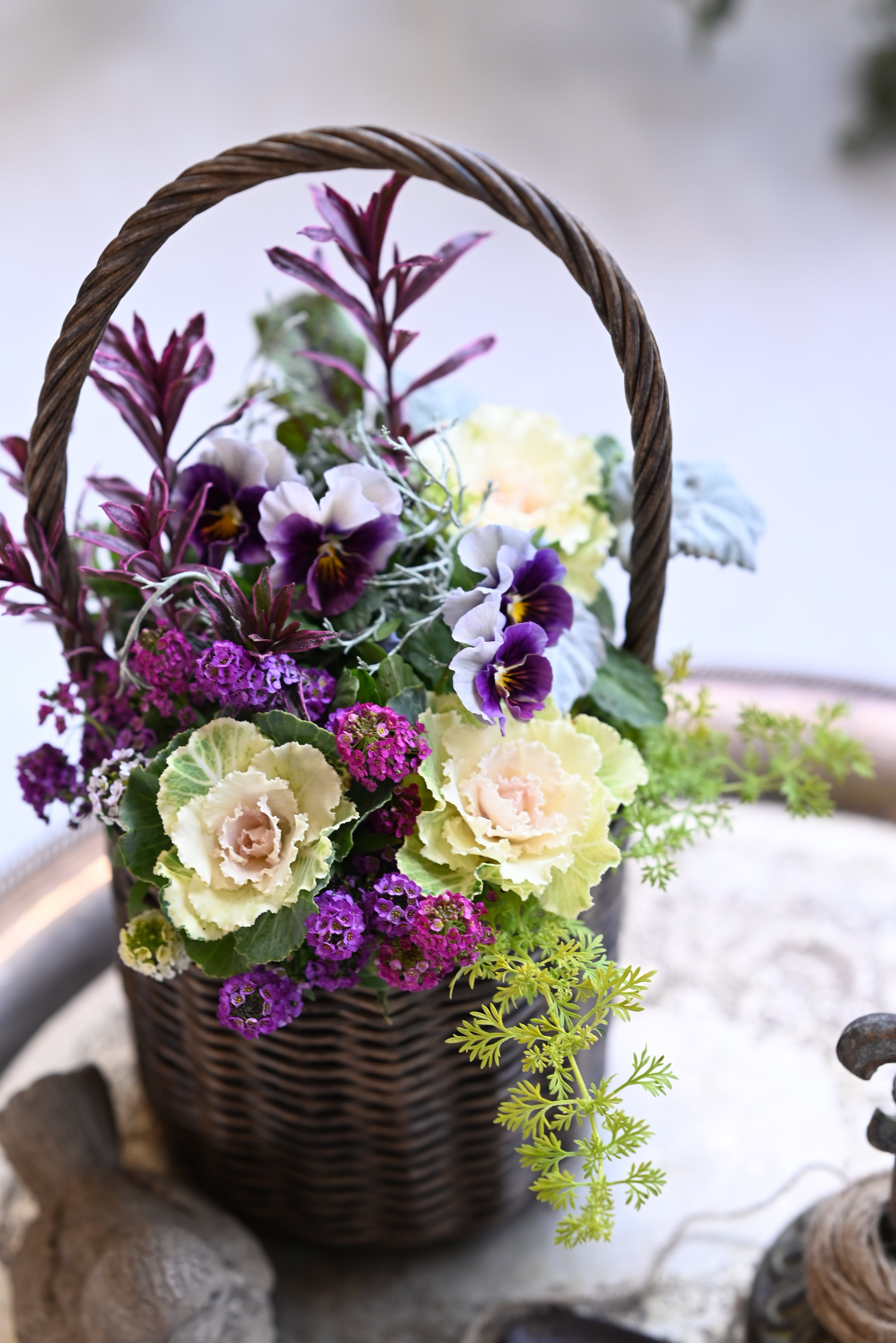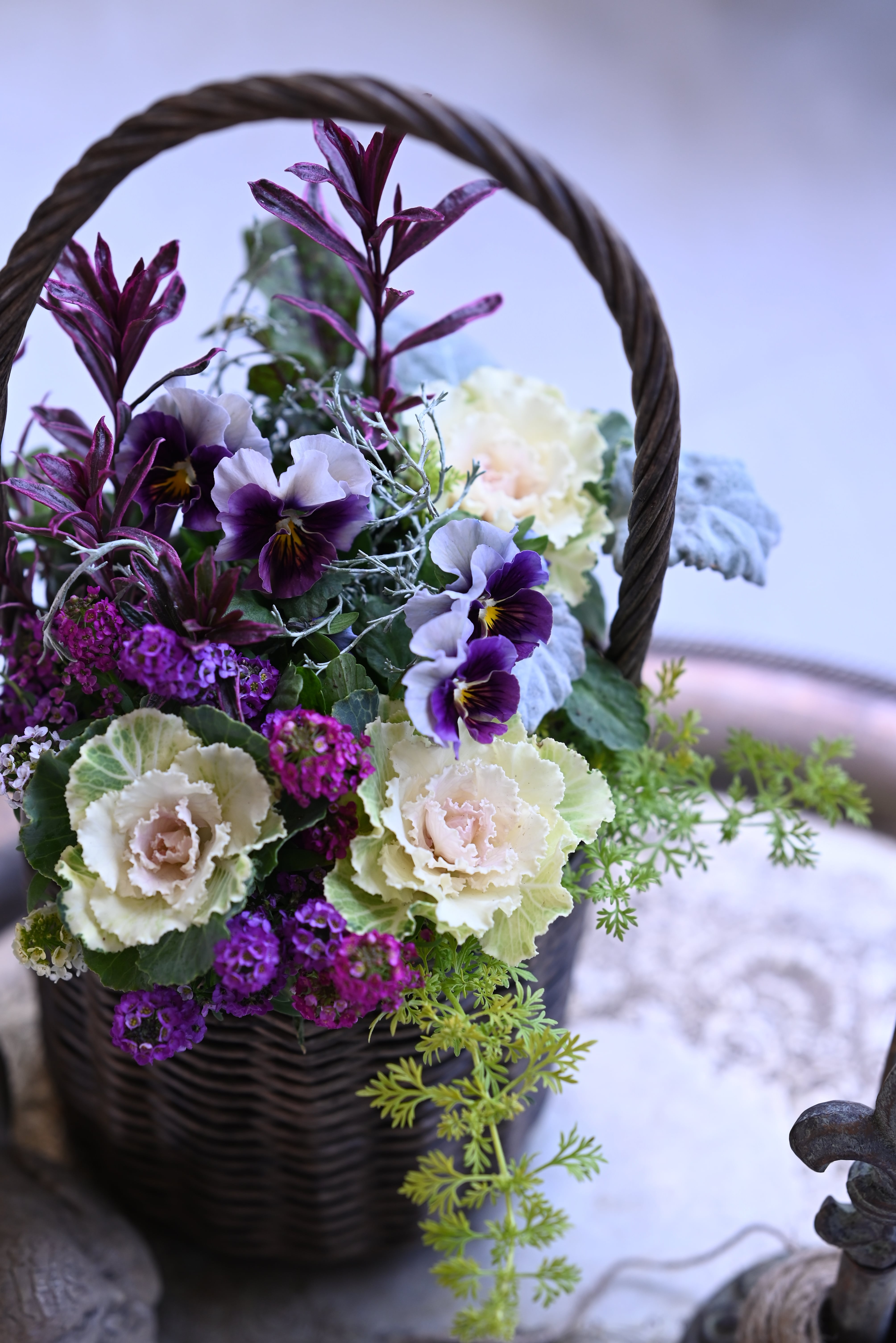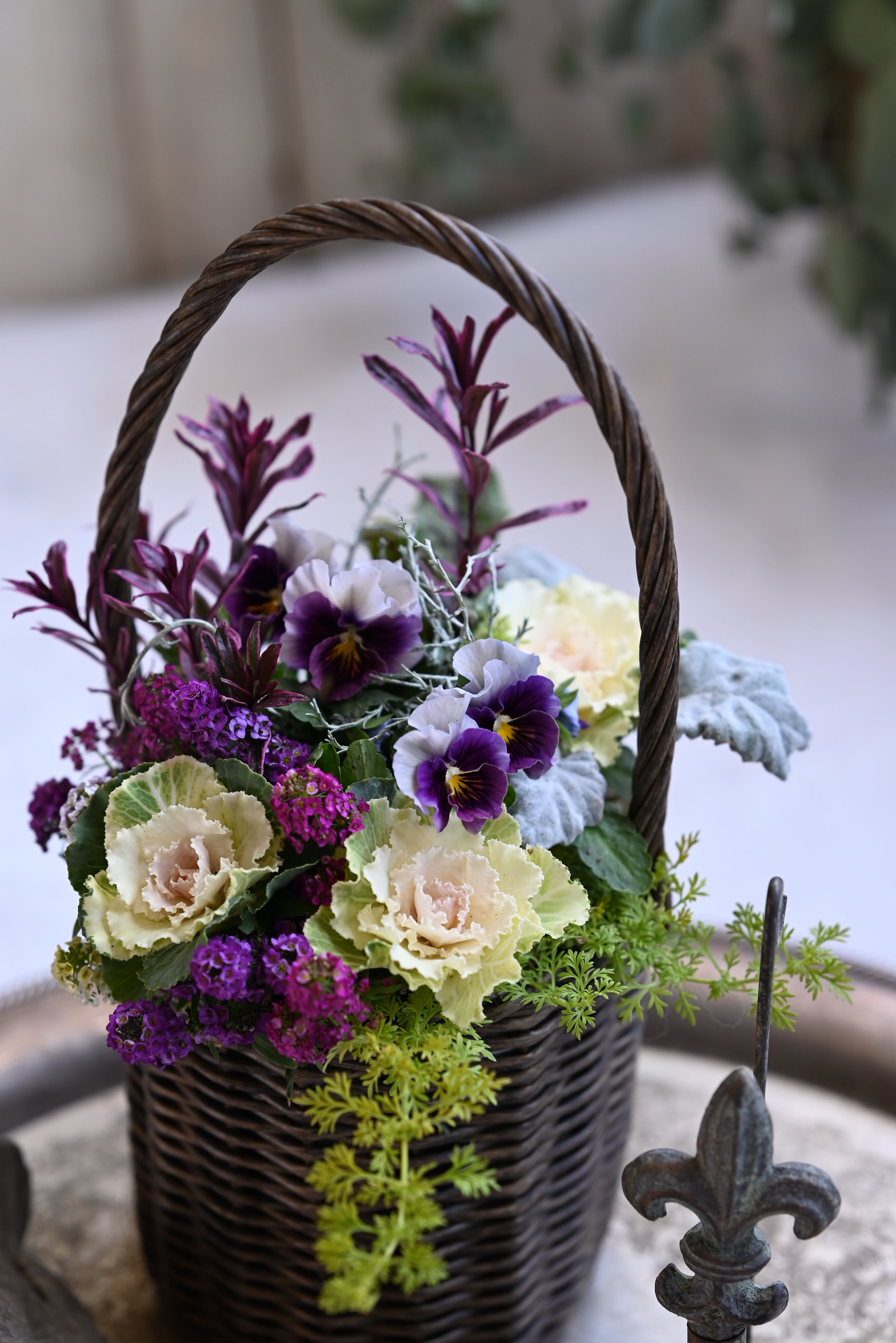 育種家うえたさんパンジー「マシェリマダム」とハボタンのシックバスケット