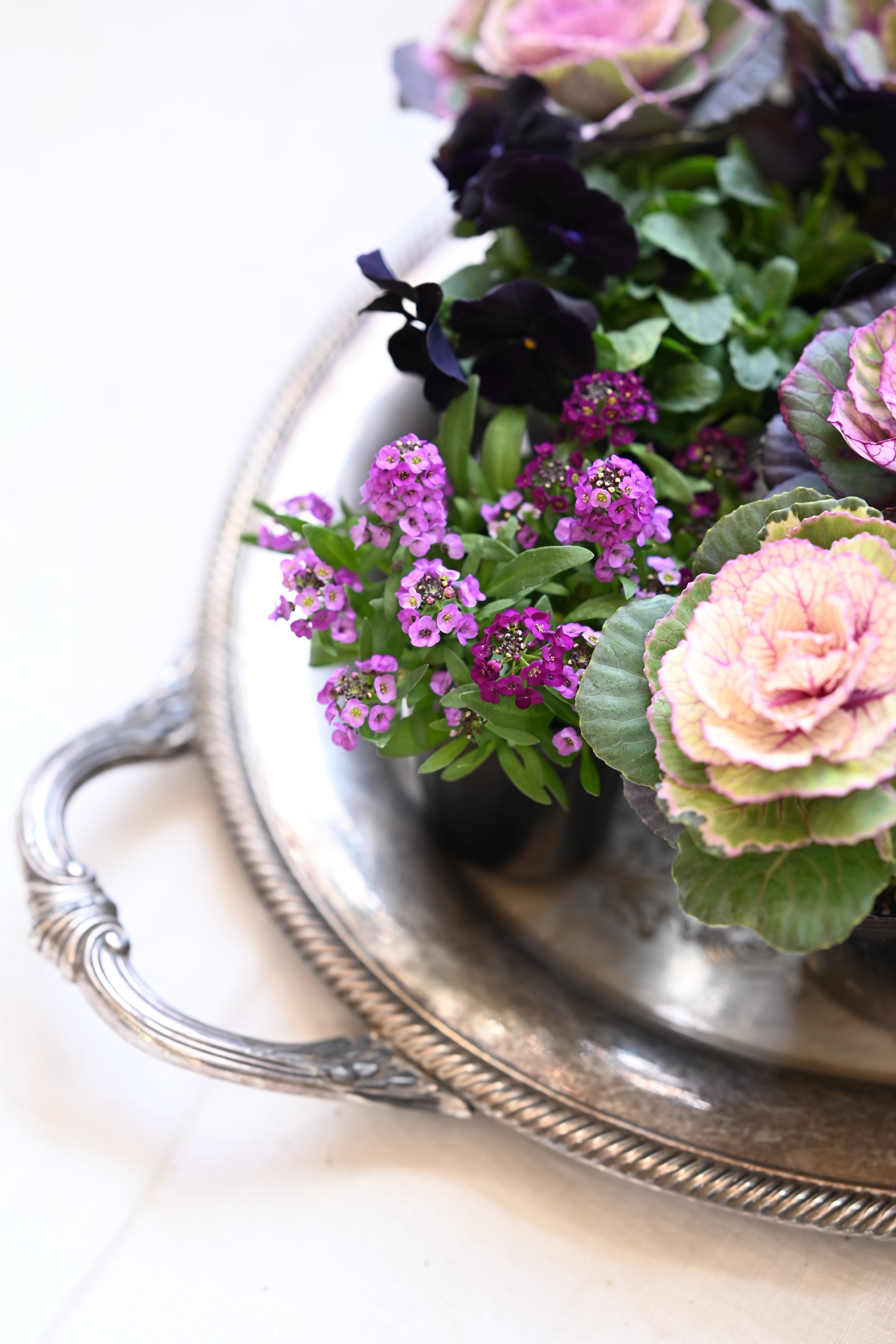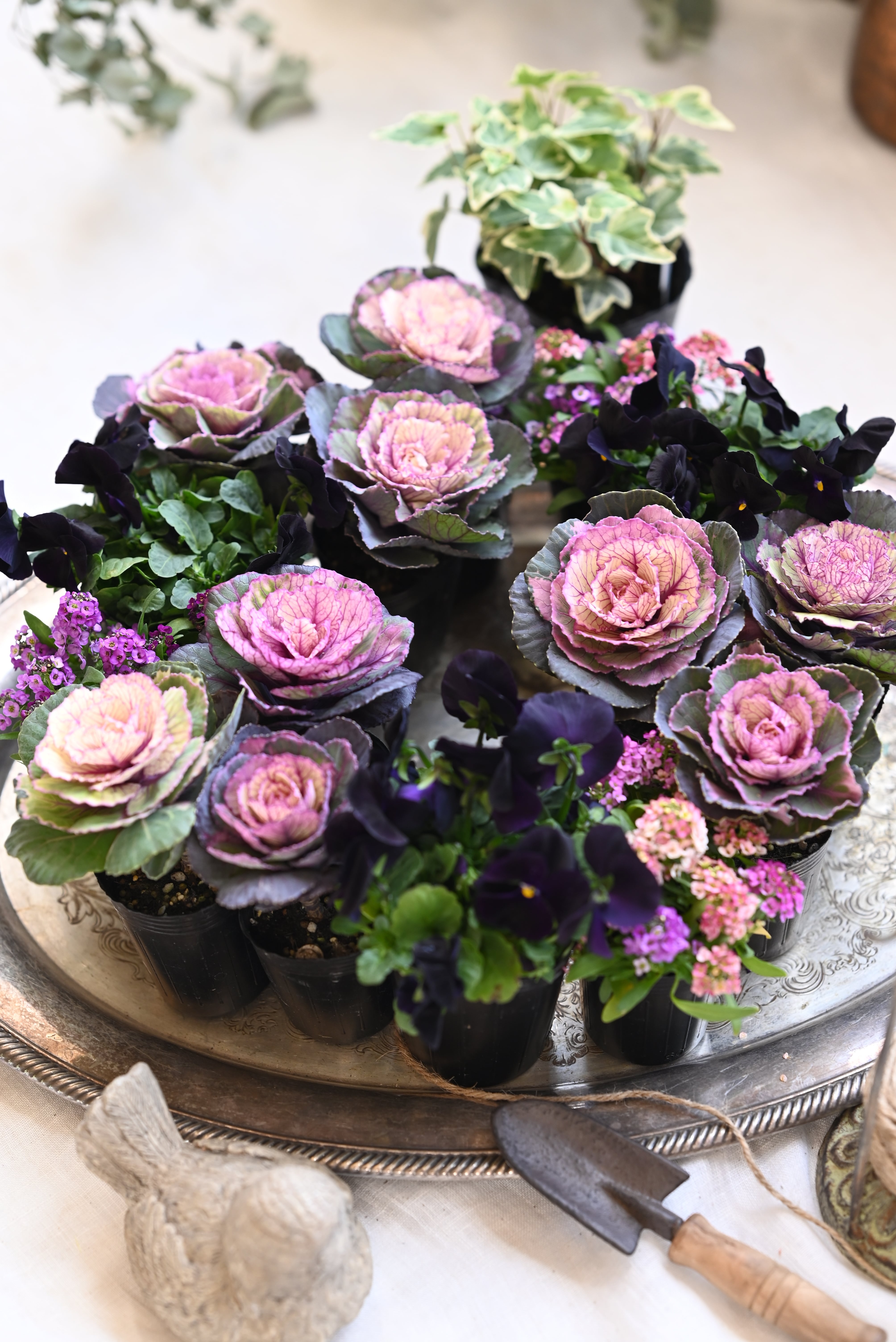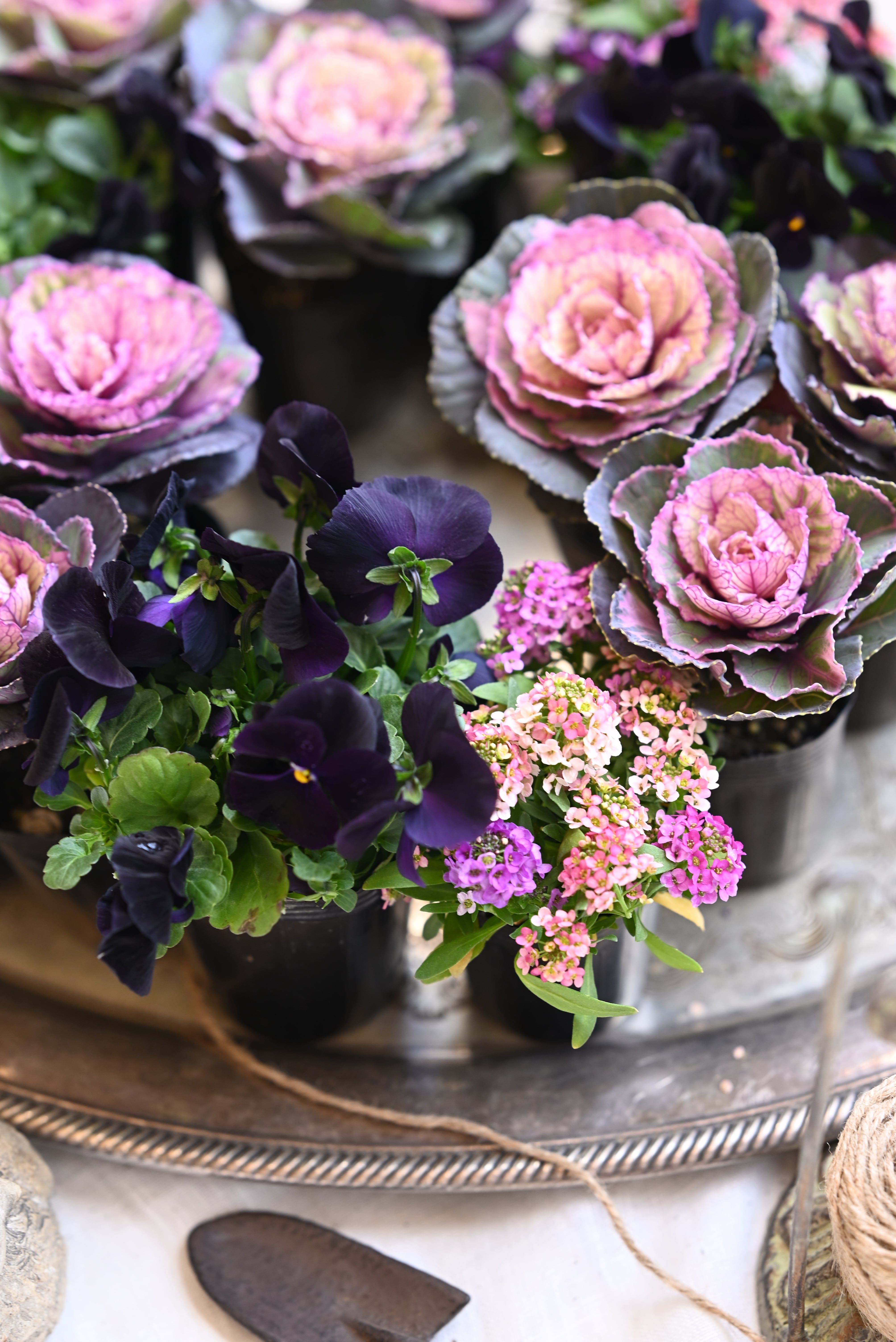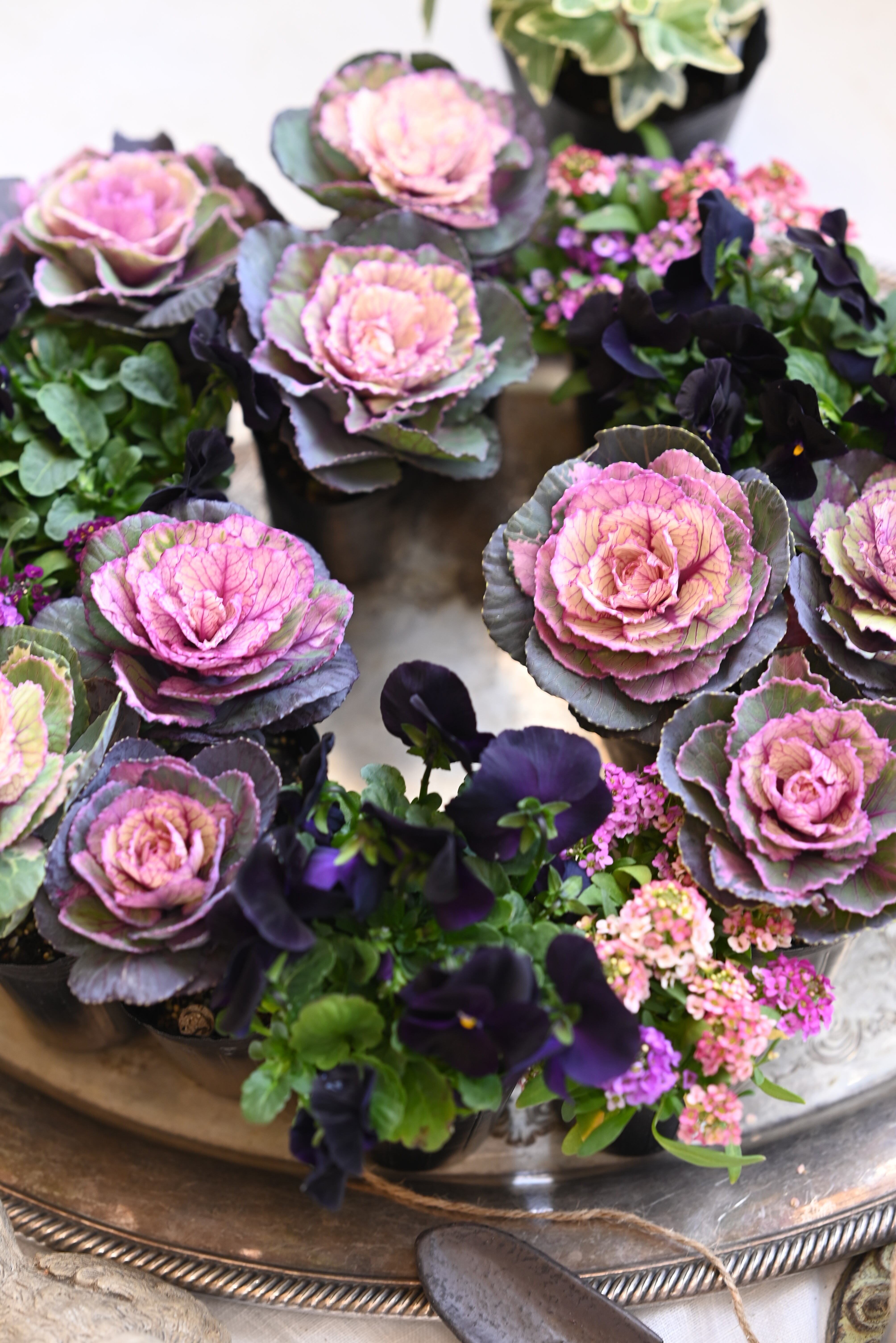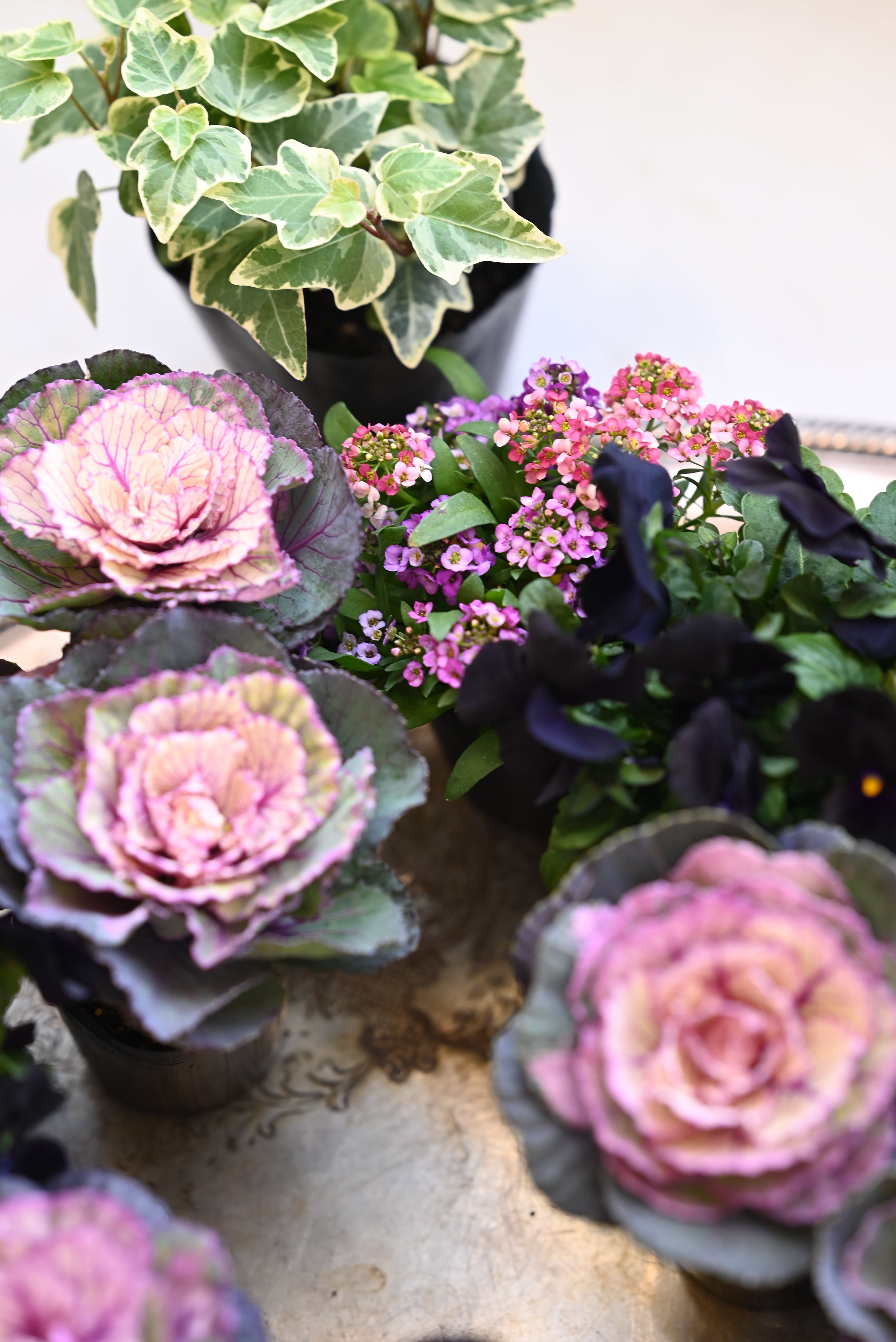 花材 ハボタン「スノールージュ」1本植え9ポット、ピンクとパープルの複色植えのアリッサム3ポット、ブラックビオラ3ポット 15株