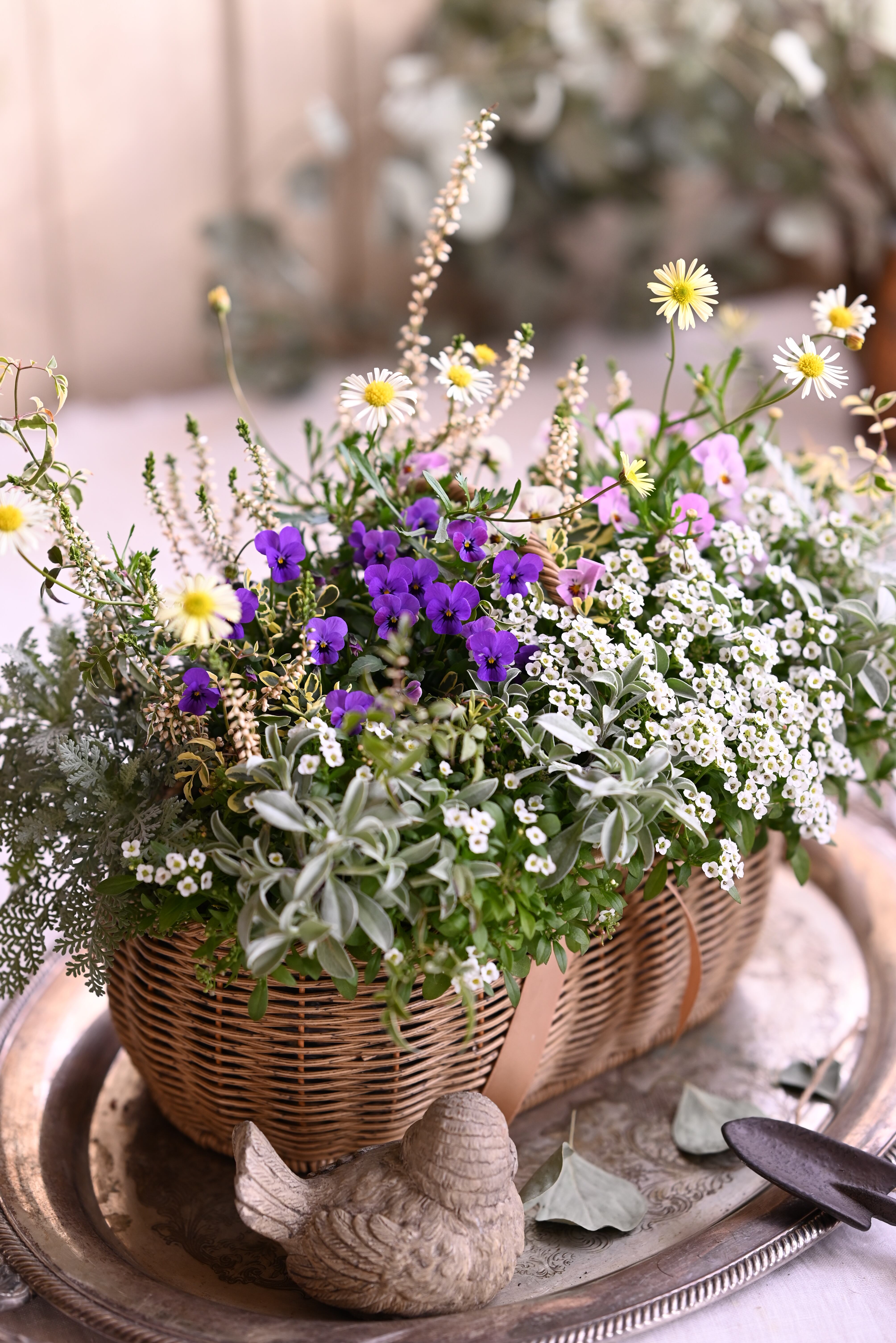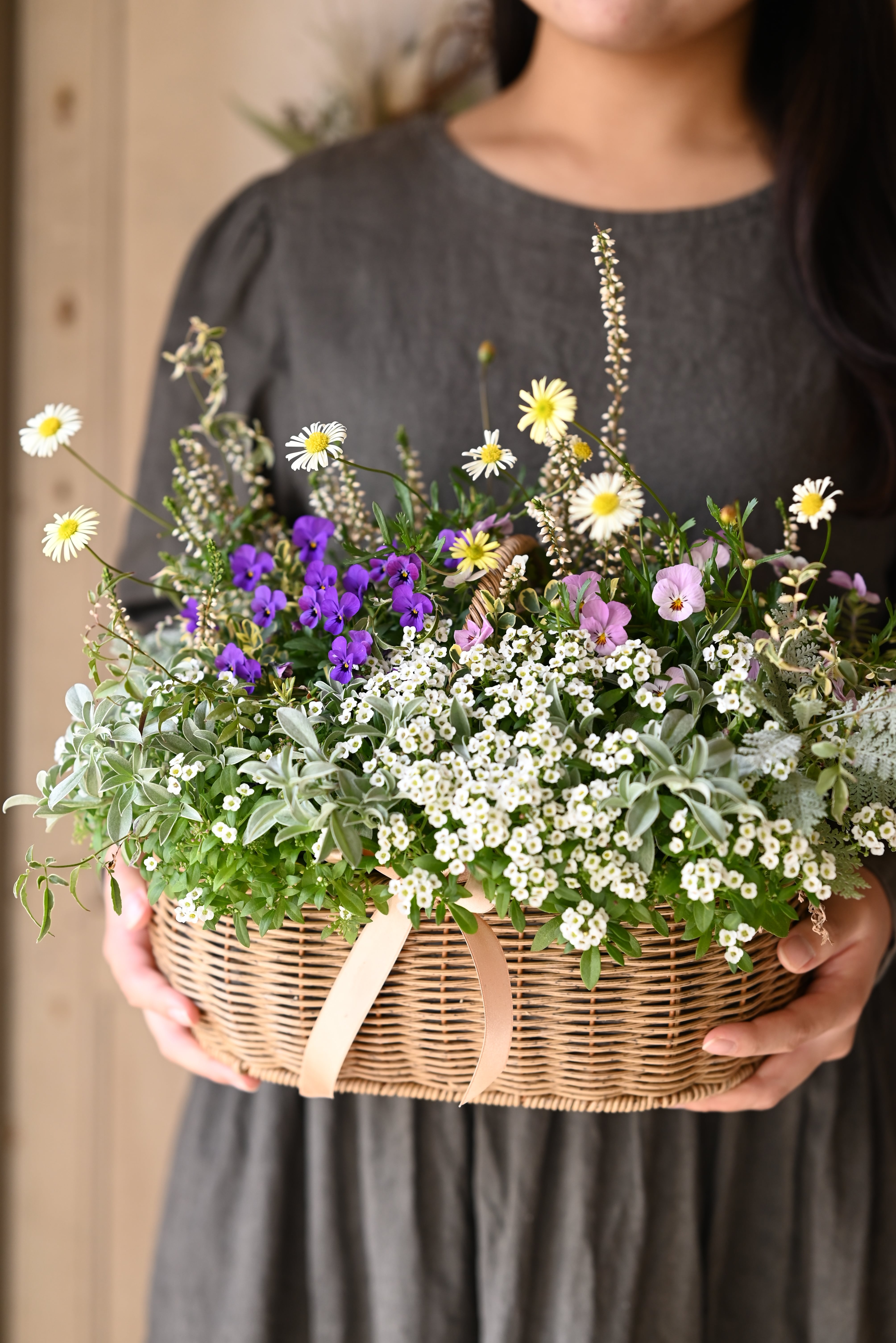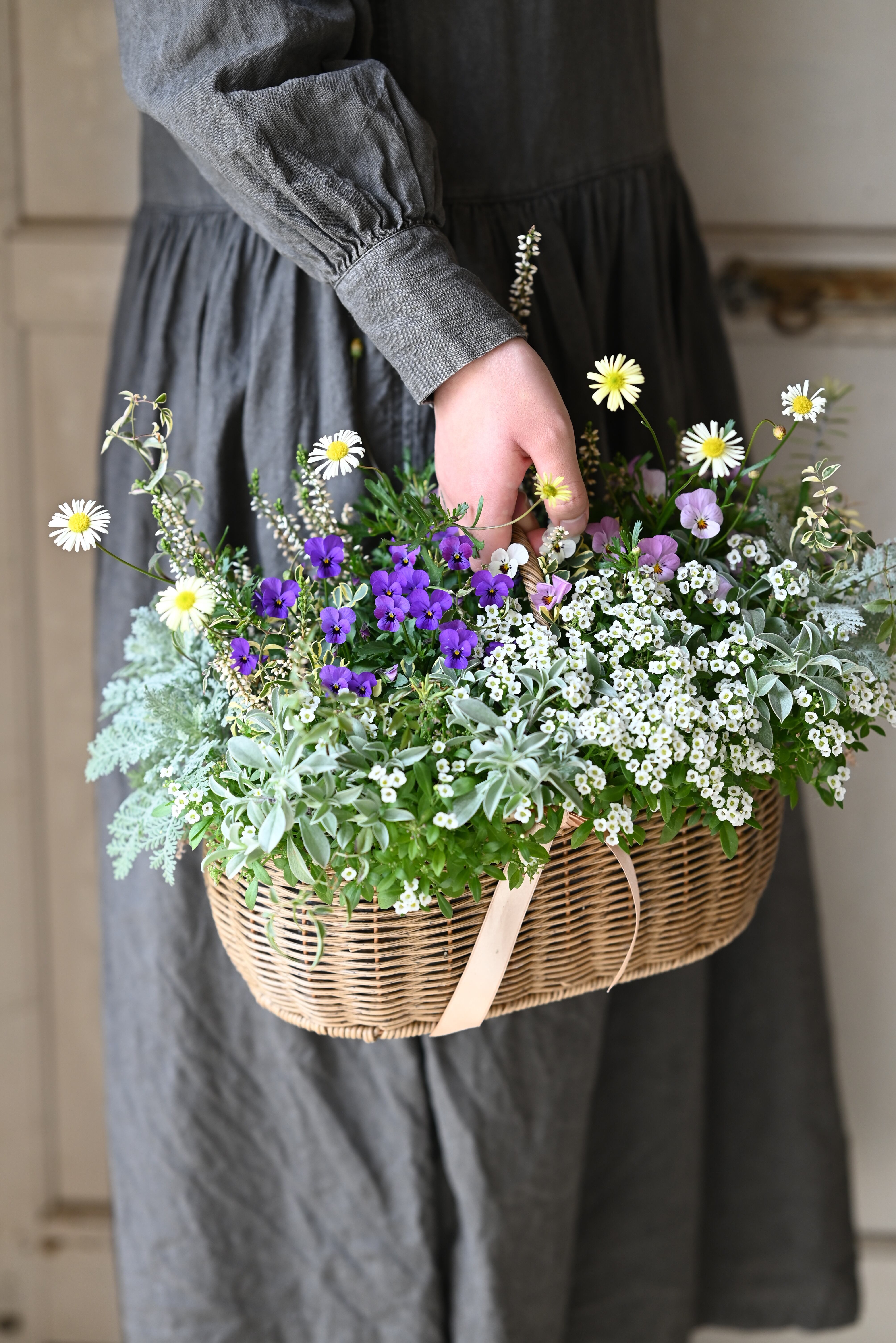 小さなお顔がかわいい小輪多花性ビオラ「ビオレッタ」2種とイエローブラキカム、大輪アリッサム「雪水晶」、カルーナをグリーンと合わせて籠に植え込みました。籠は再生プラスチックで丈夫です。小輪の育種ビオラ「ビオレッタ」が大変可憐な寄せ植えです。ビオレッタは春には溢れるように咲きます。ブラキカムイエロージャイアントも寒さに強く途切れることなく花が咲きます。丈夫な大輪アリッサムと植え込み、春まで途切れることなく楽しんでいただける寄せ植えです。グリーンには、ヘリクリサムホワイトフェリー、コロニラバリエガータ、ウエストリンギア、ハゴロモジャスミンミルキーウェイ、シロタエギクシルバーレースなどを使用。ガーリーな可愛い花籠寄せ植えです。