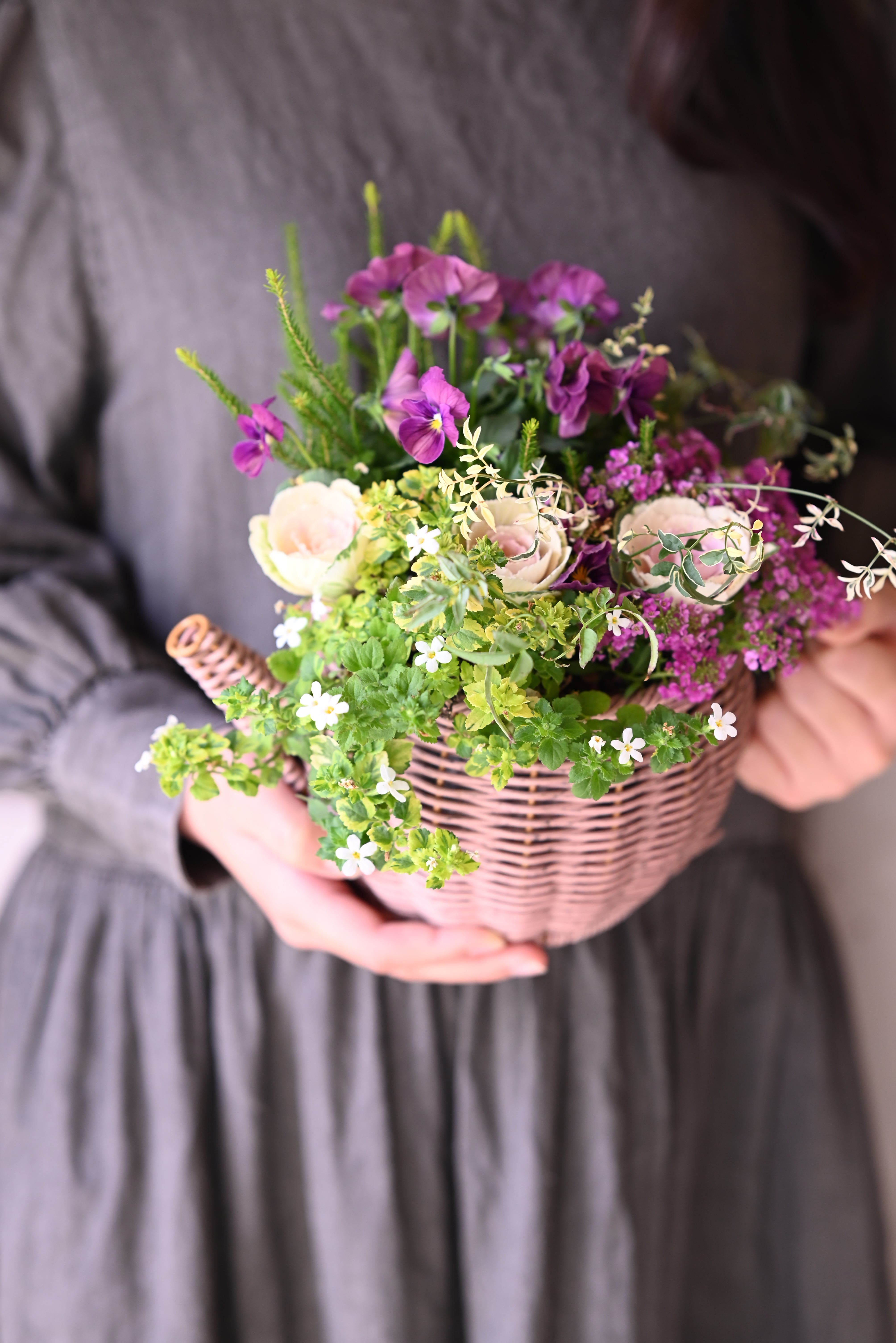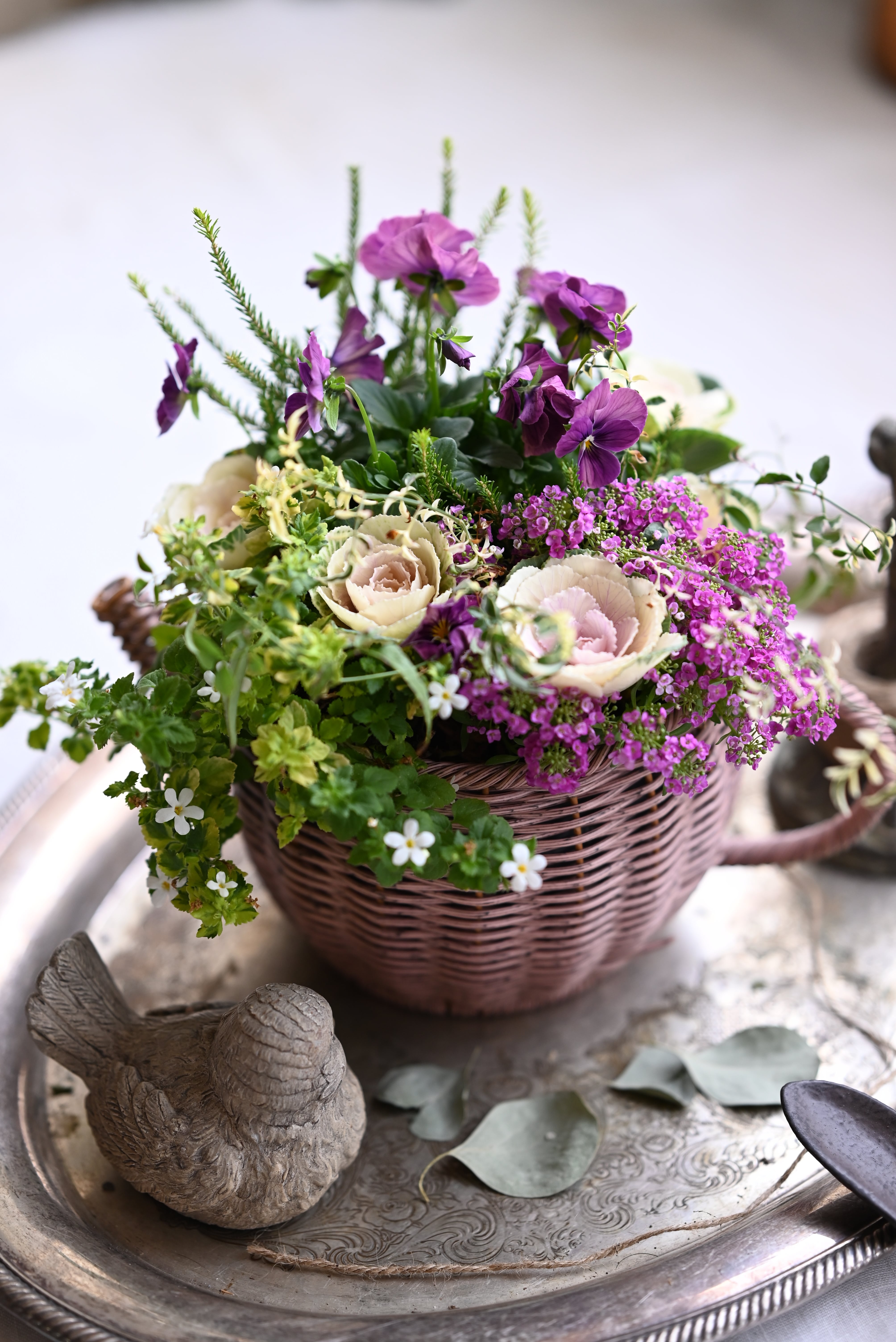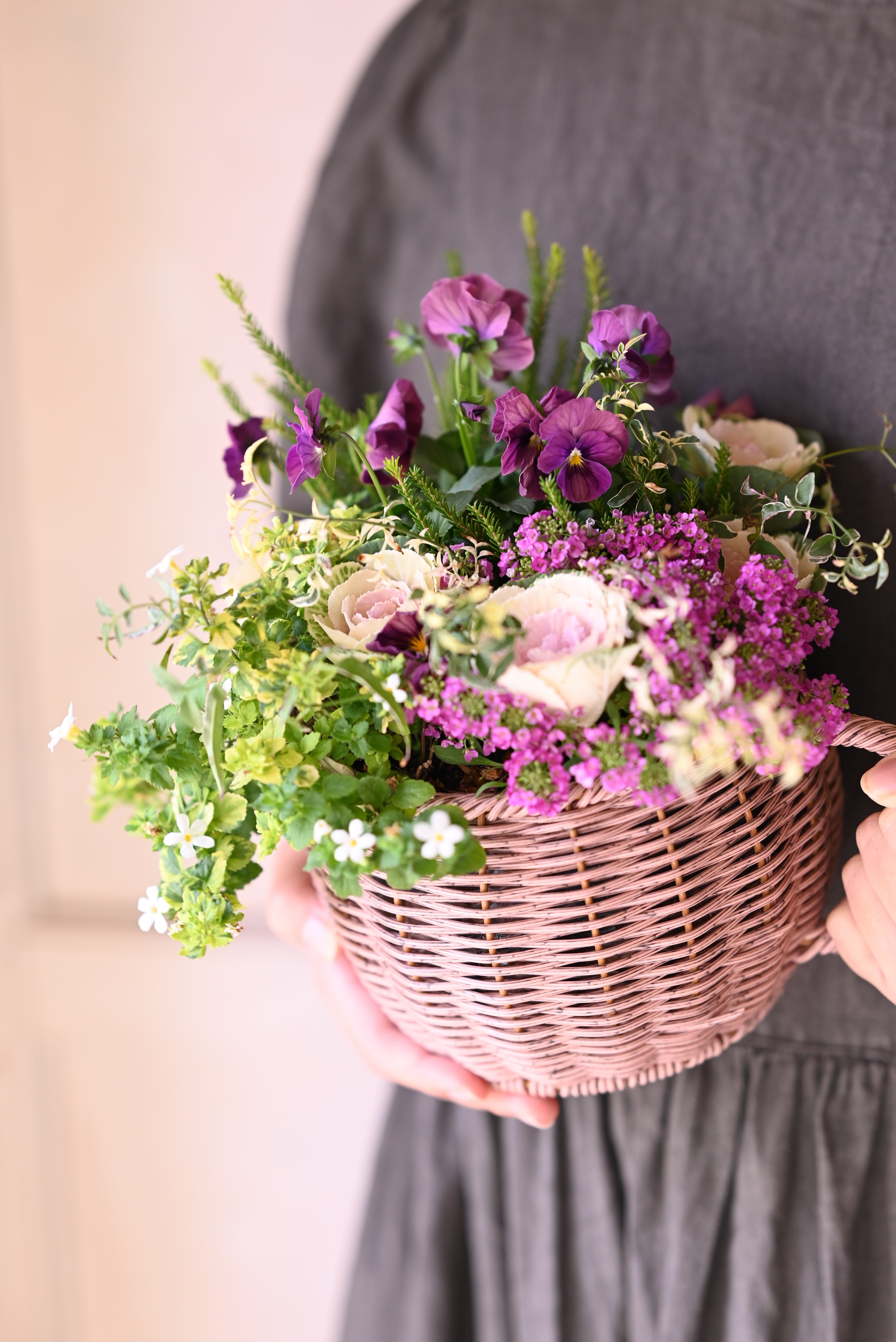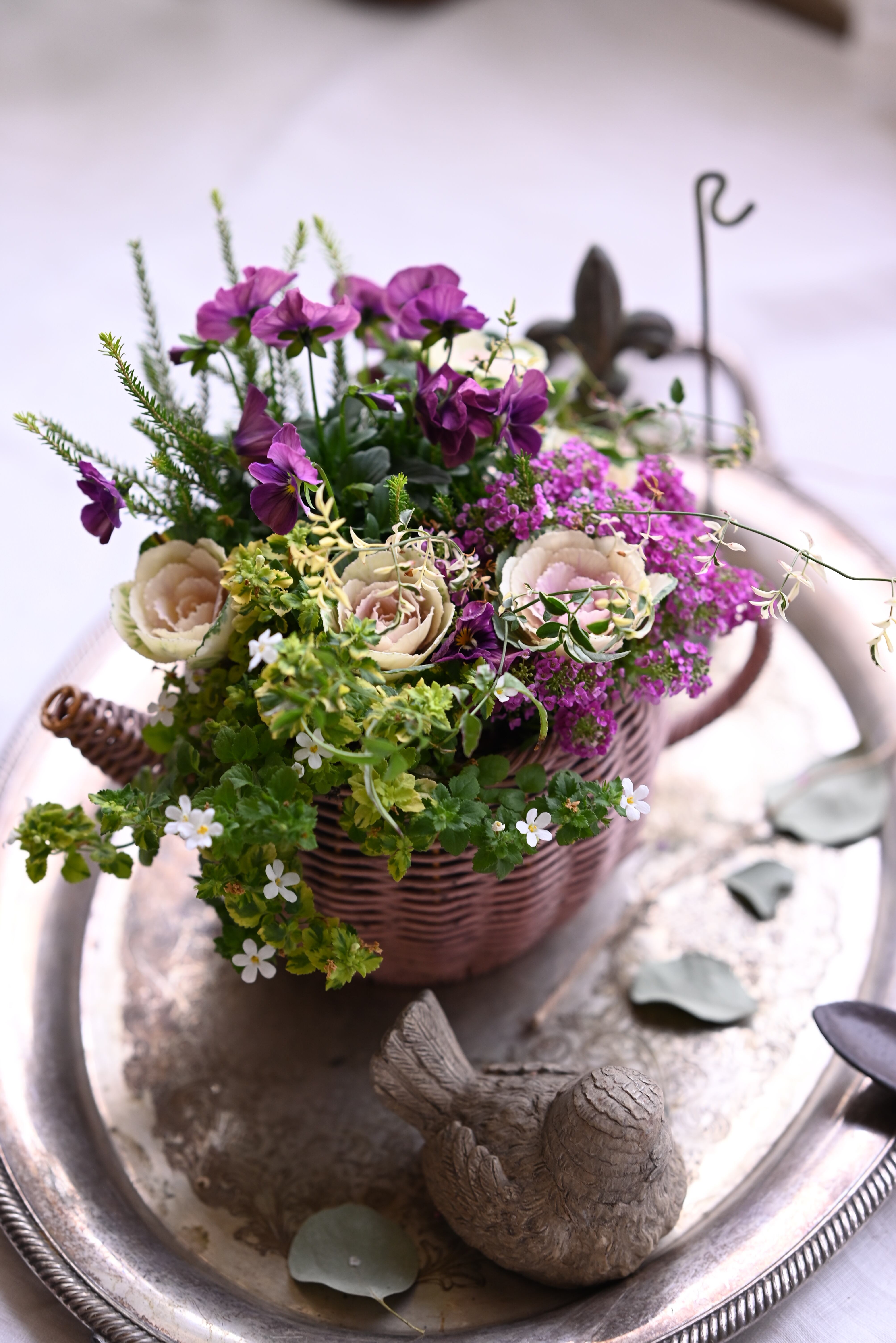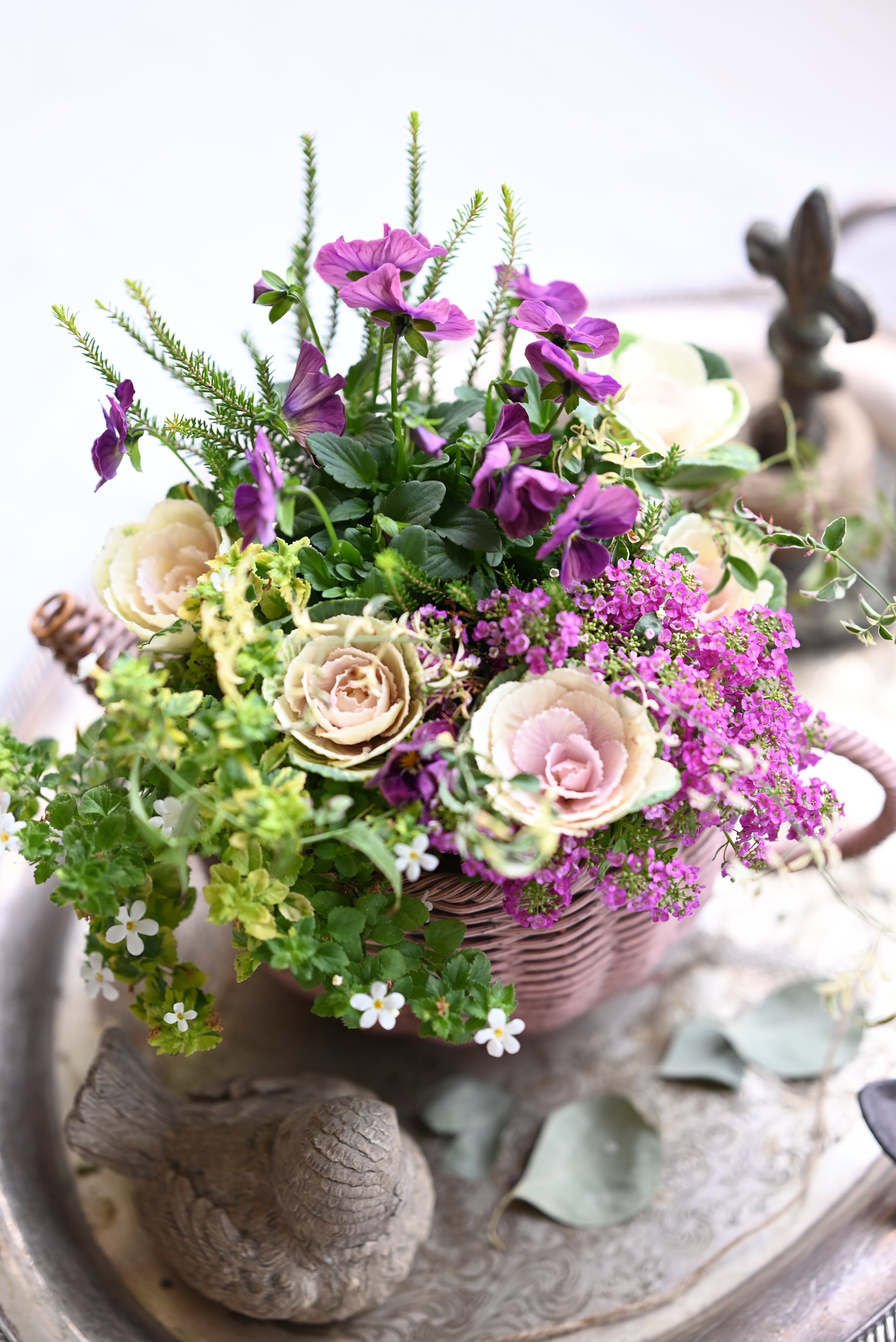薔薇のような小さなハボタン「スィートベリー」、ビオラ「しんしん」、をアリッサム、グリーンと合わせポット型バスケットへ植え込みました。白い小花の斑入りバコパが溢れるように咲く様子は可愛らしいです。グリーンにはエリカバレリーグリフィス、ハゴロモジャスミンミルキーウェイを使用。ナチュラルに可愛いらしく飾れるお正月の寄せ植えです。