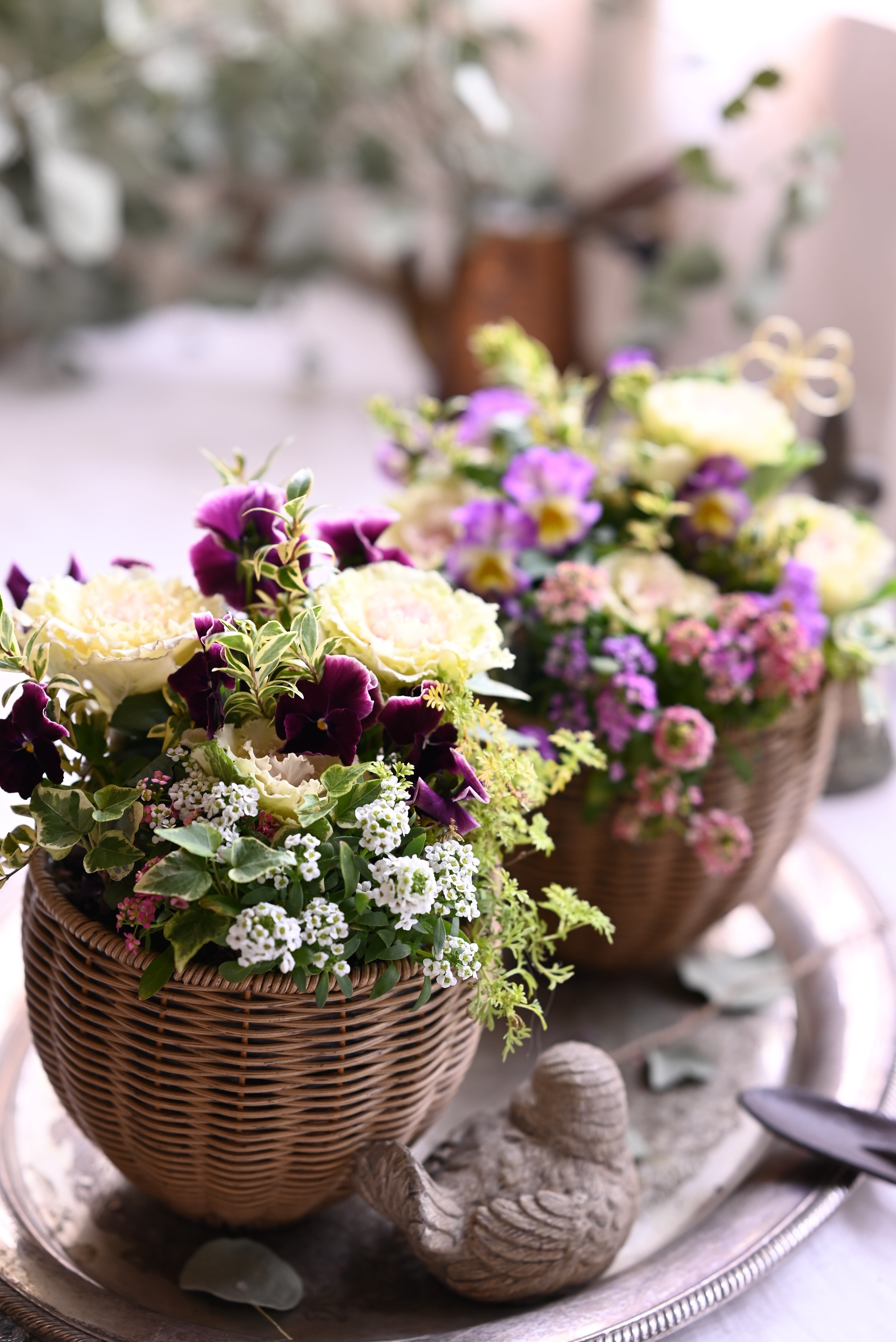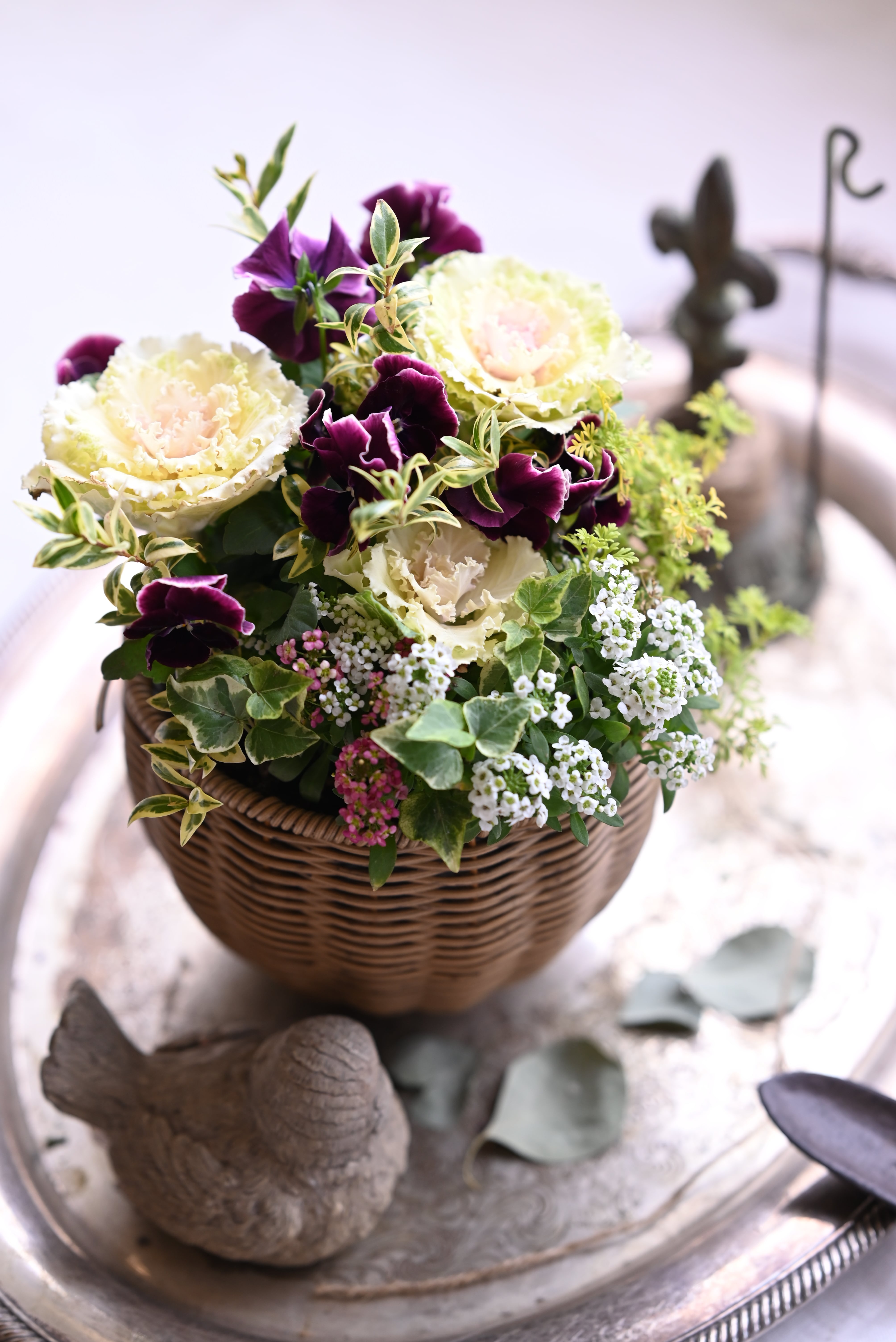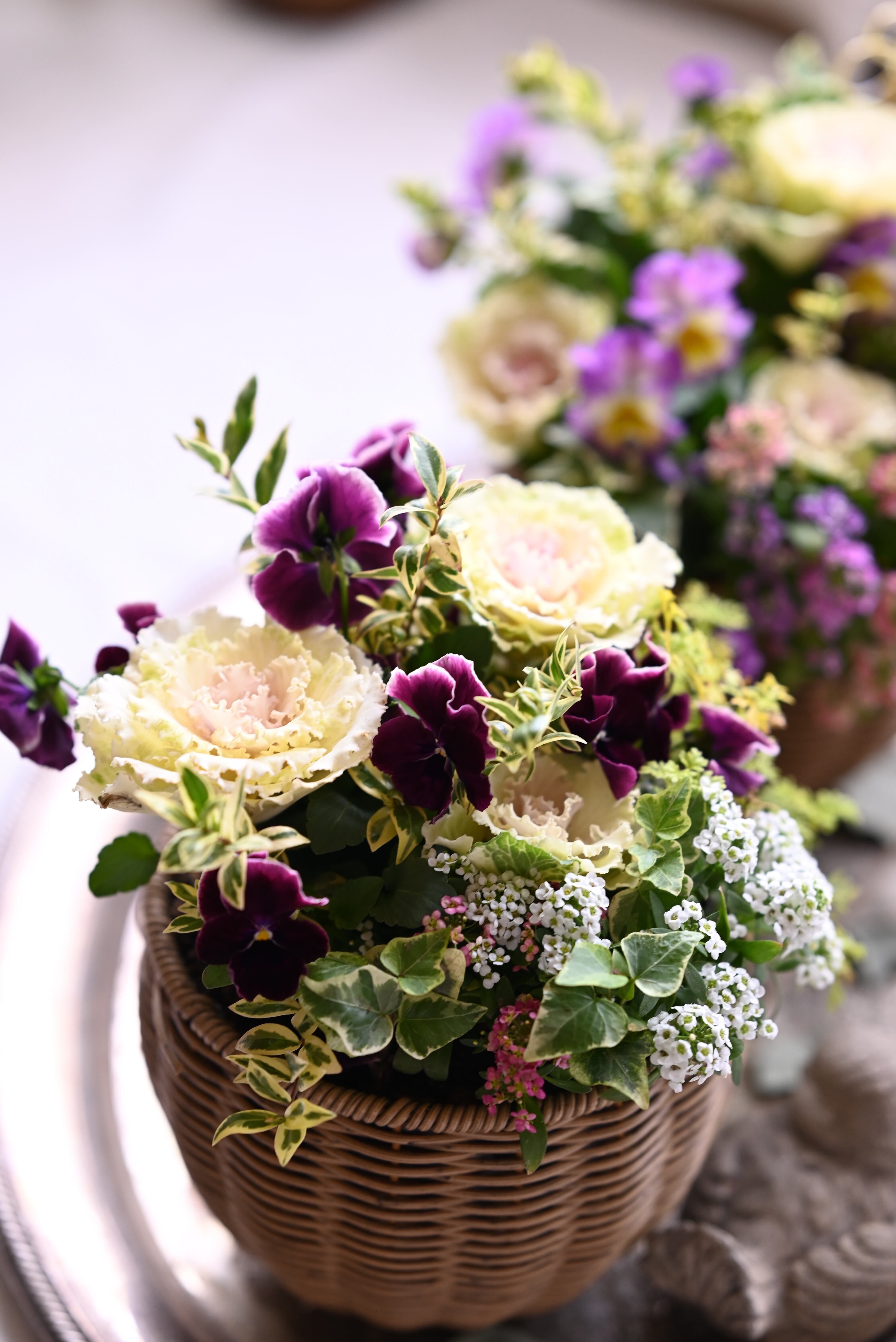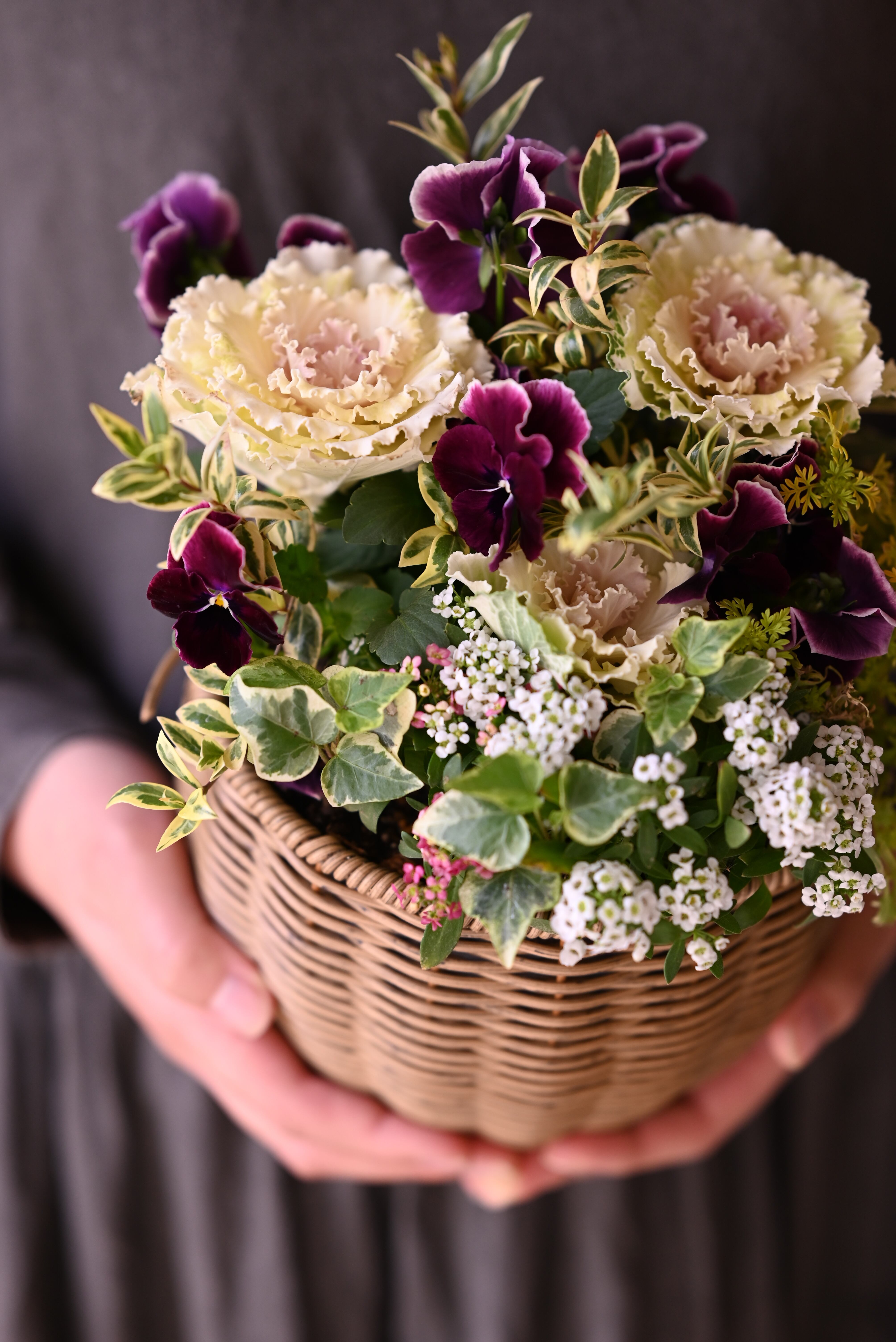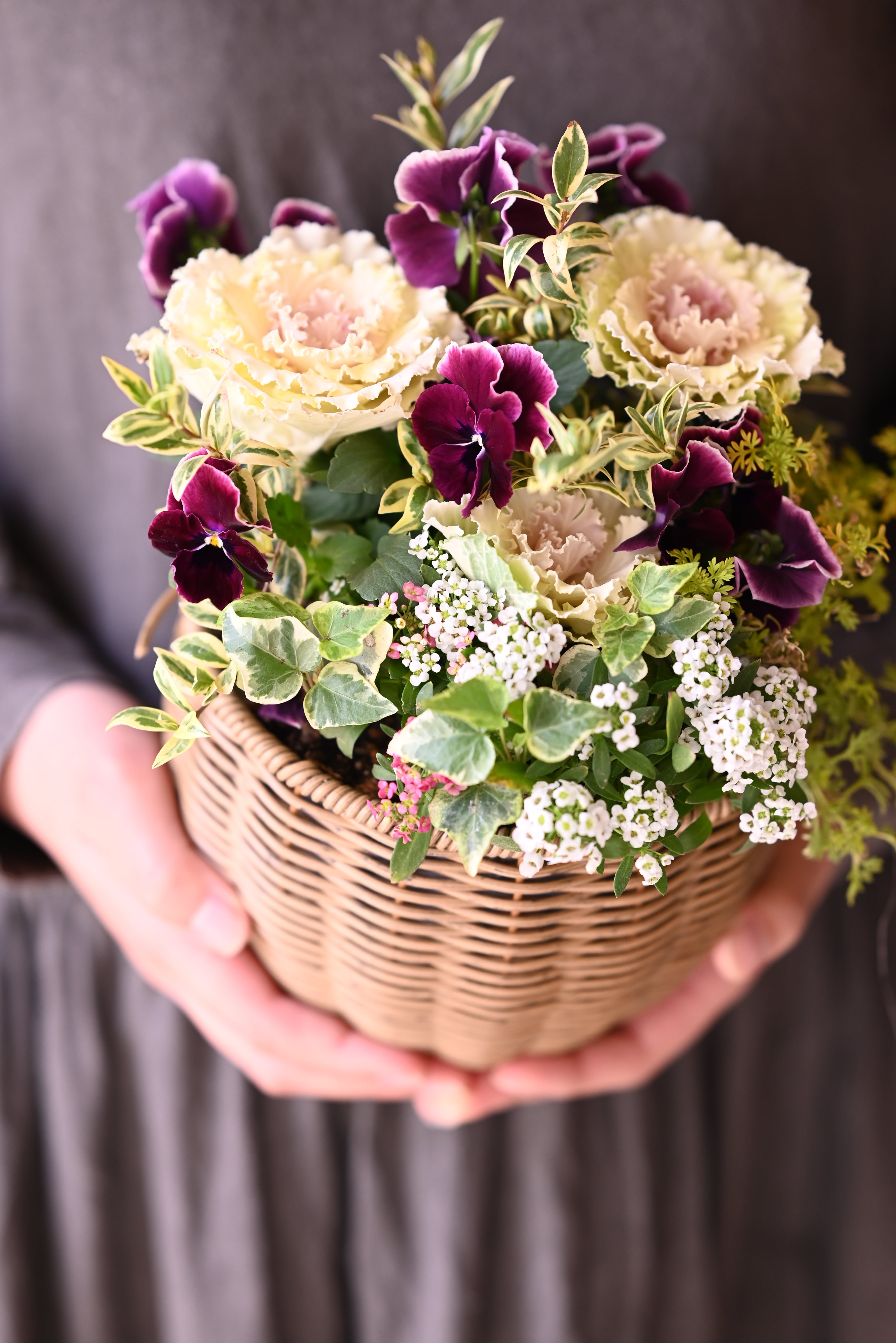 薔薇のような小さなハボタン「ペティピーチ」、ワインレッドのパンジーわらく「プチグレース」をアリッサム、グリーンと合わせバスケットへ植え込みました。混色のアリッサムと明るいグリーンがナチュラルなお正月の寄せ植えです。グリーンにはバーベナテネラ、アベリア、ヘデラを使用。ナチュラルに可愛いらしく飾れるお正月の寄せ植えです。
