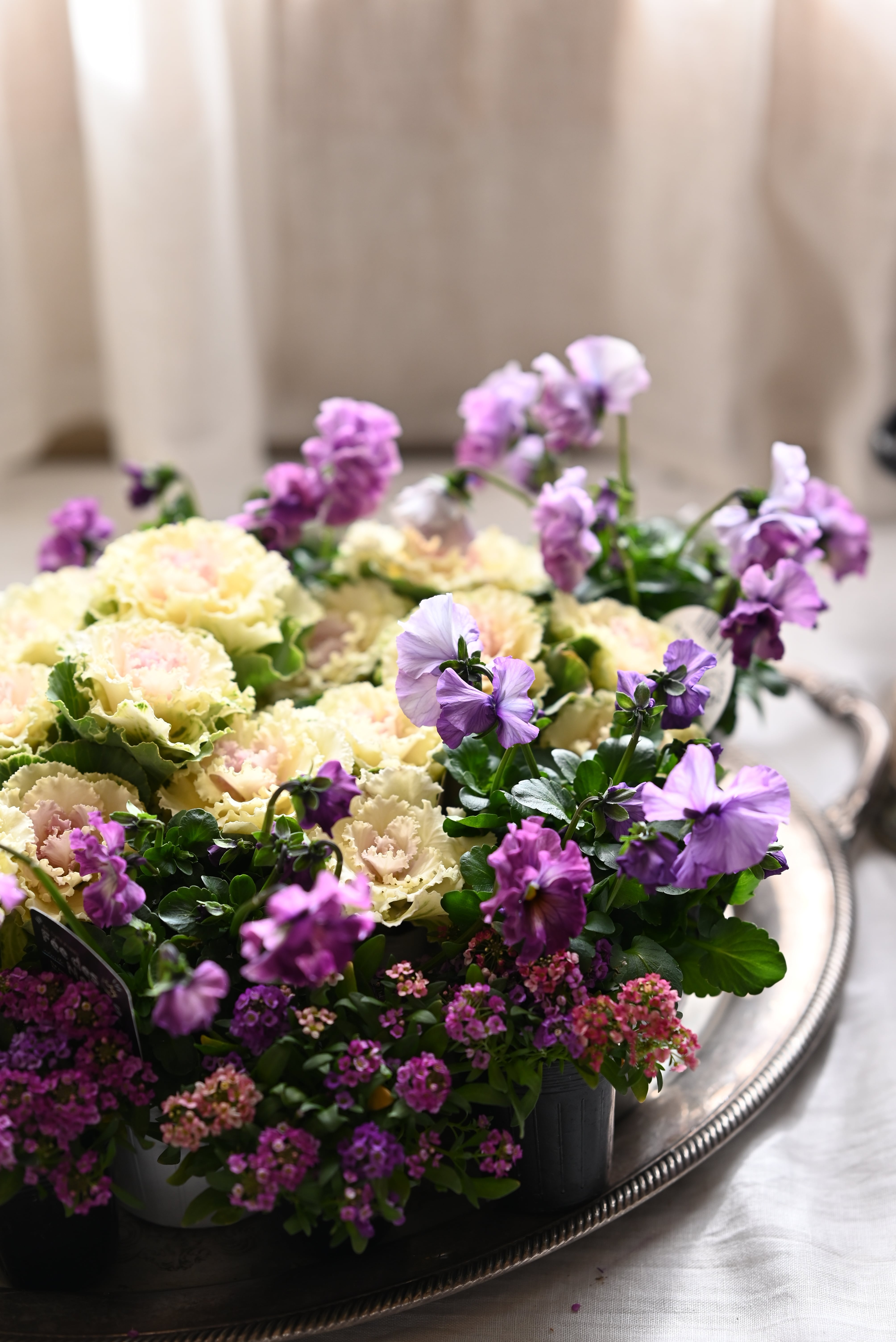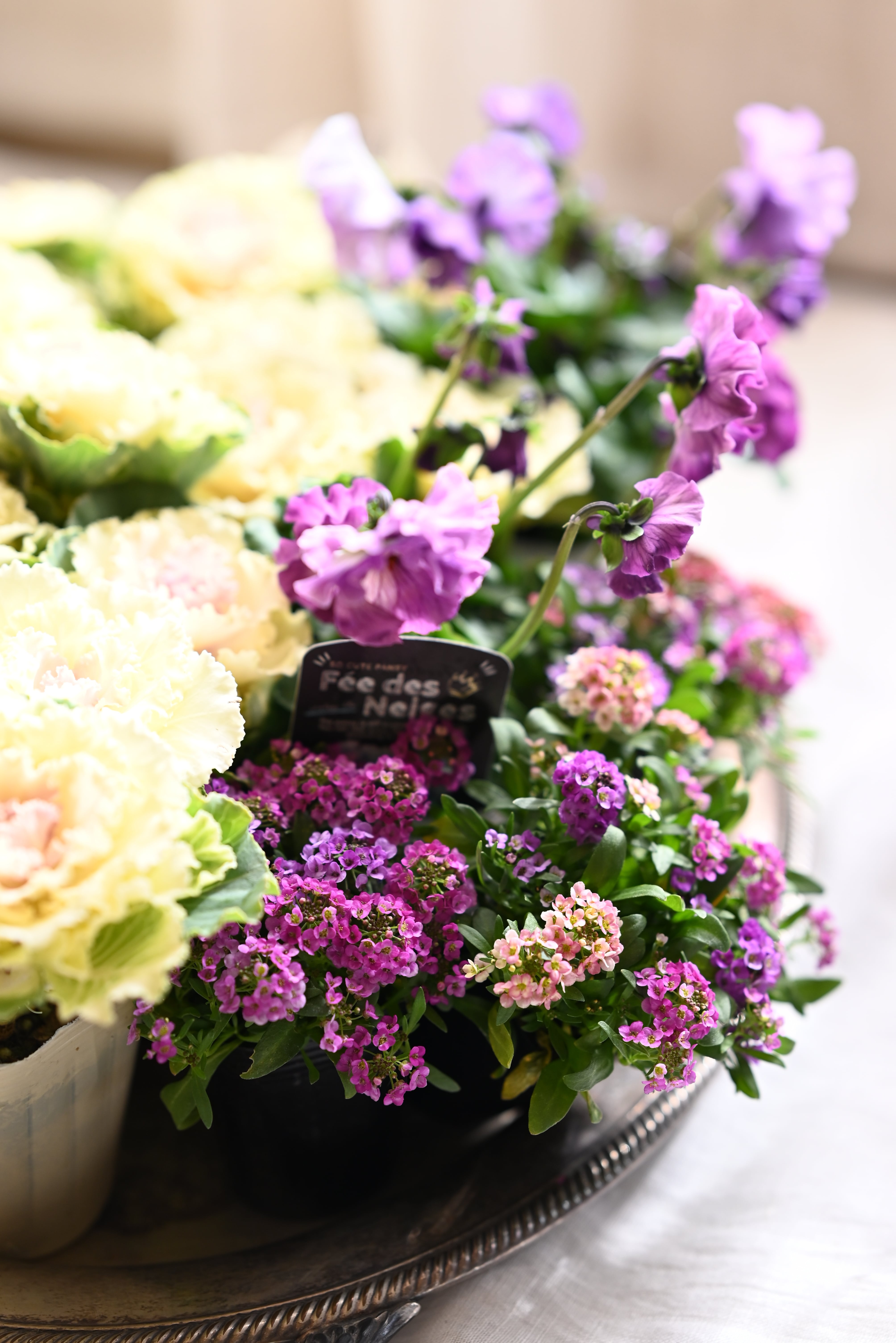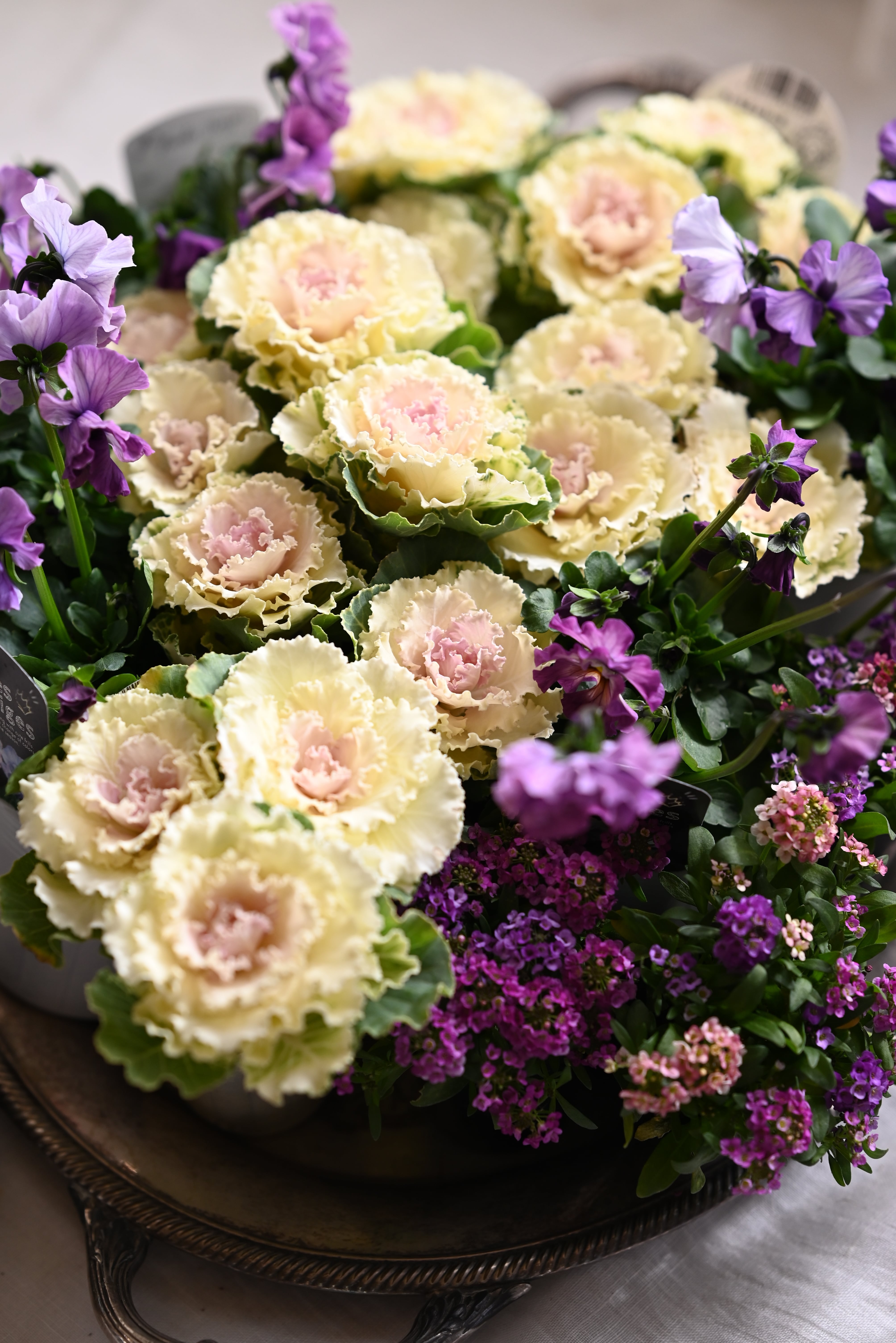 花材 ハボタンペティピーチ3本植え6ポット、パンジーフェデネージュ5ポット、ピンクパープル系の混色アリッサム4ポット 計15ポット