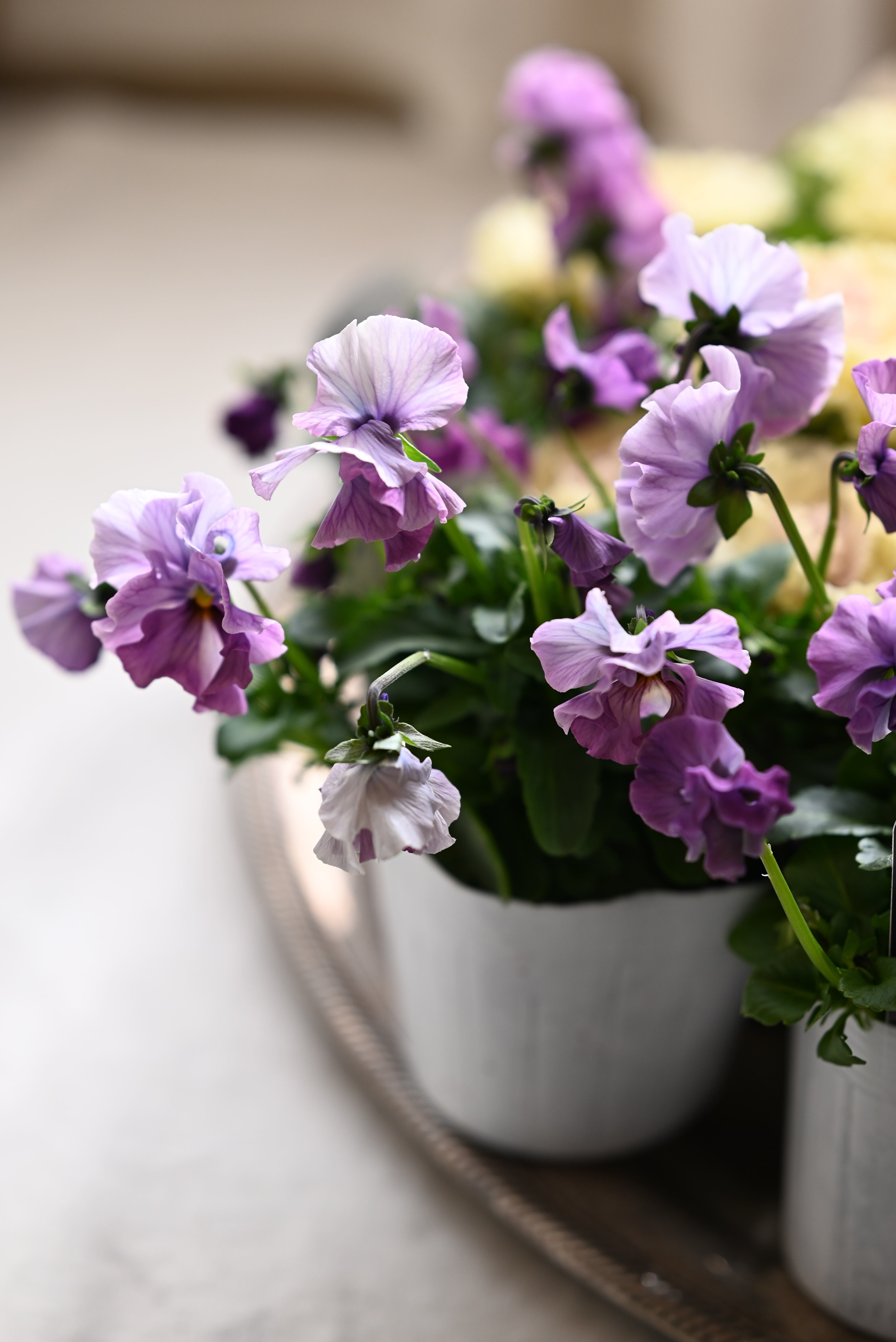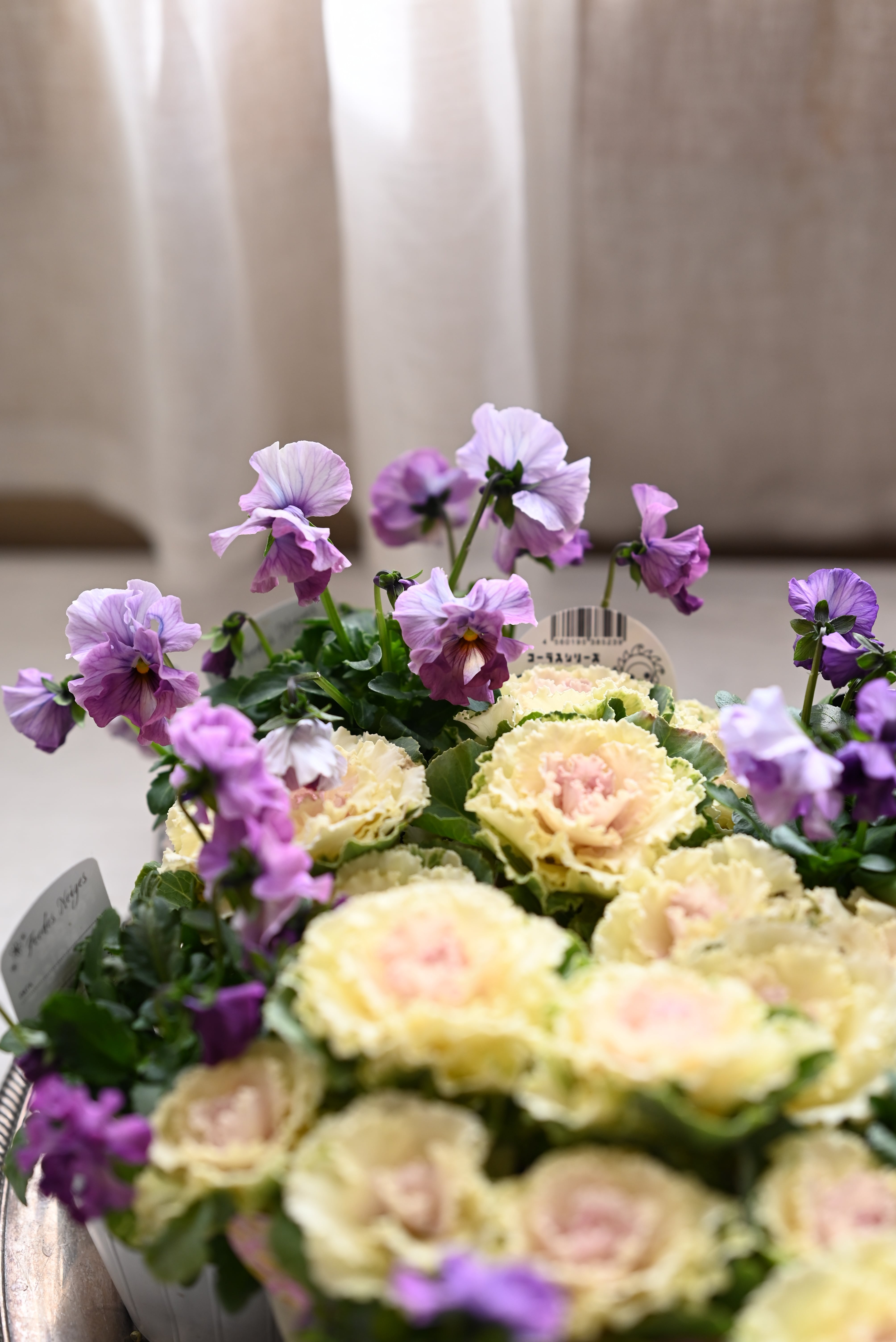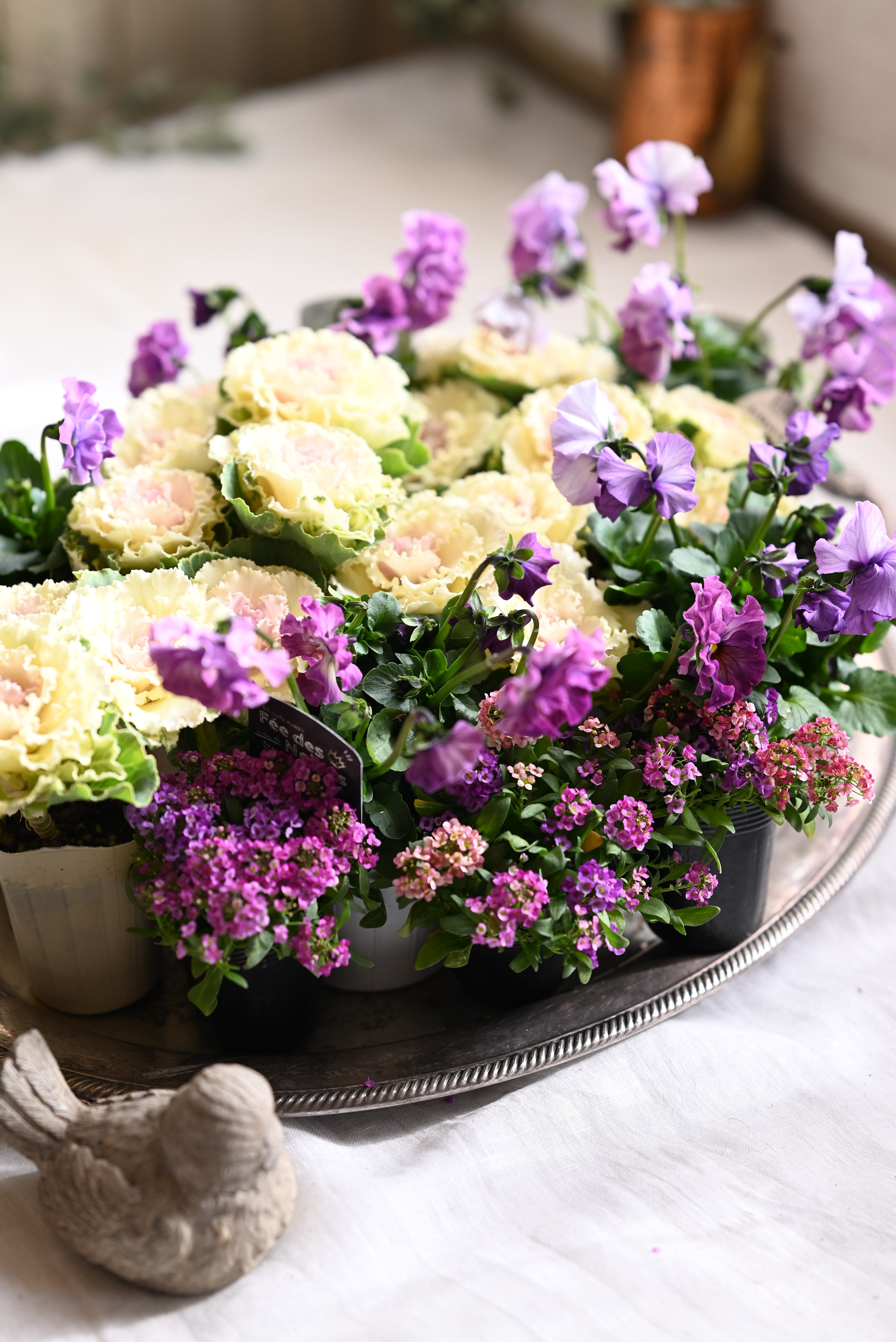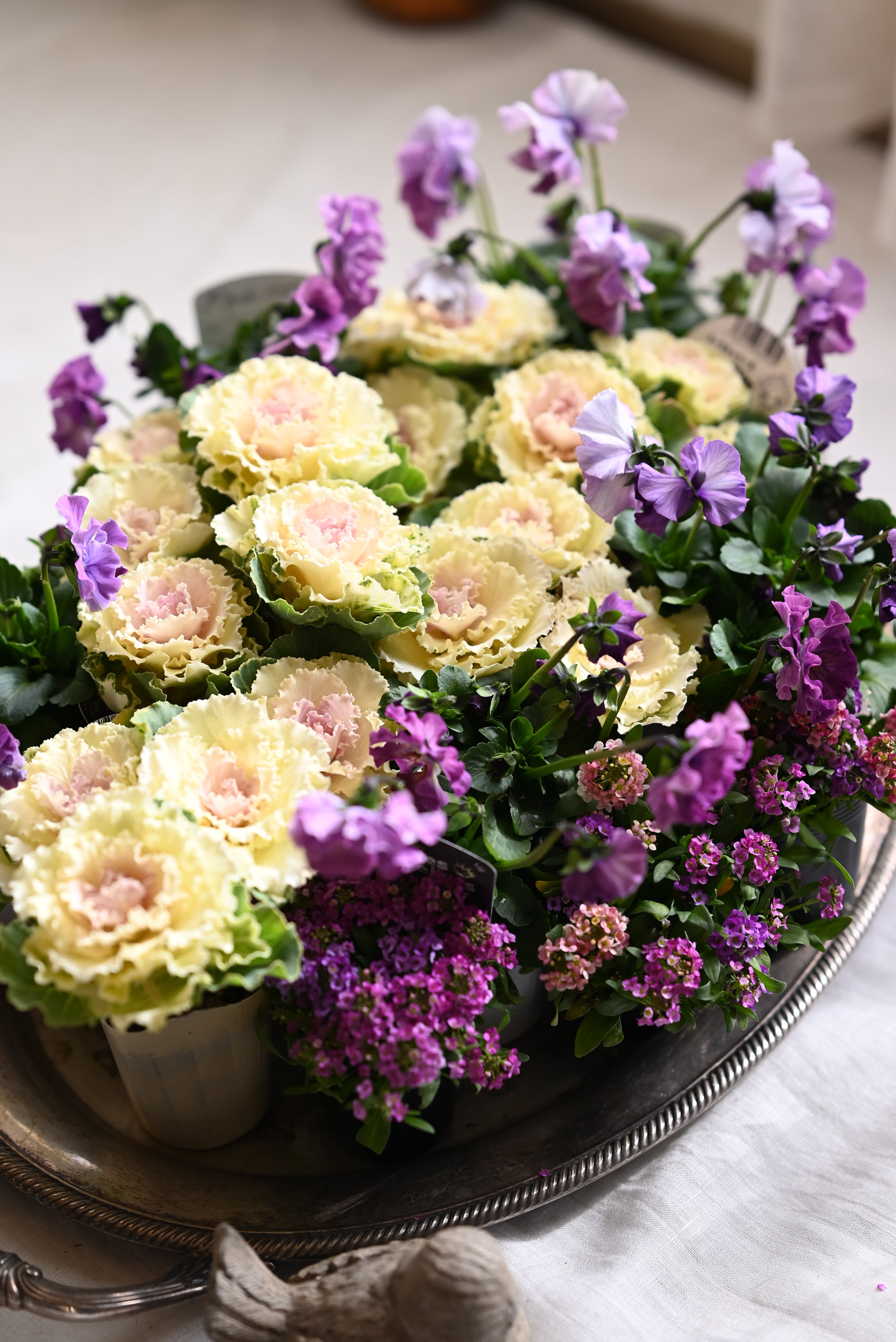 花材 ハボタンペティピーチ3本植え6ポット、パンジーフェデネージュ5ポット、ピンクパープル系の混色アリッサム4ポット 計15ポット