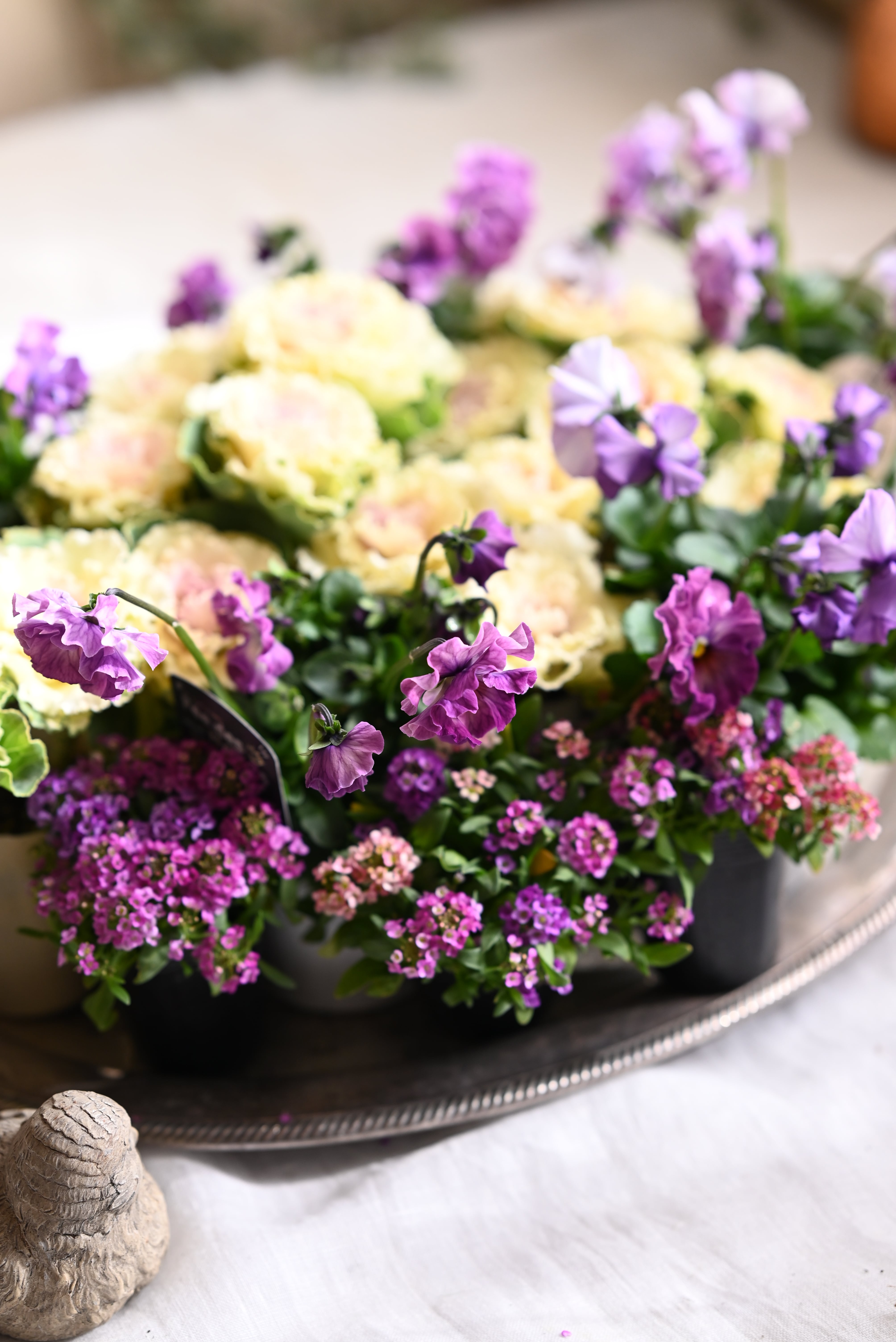 薔薇のようなハボタン3本植え、ピンクパープルのグラデーションと美しい透明感のパンジーフェデネージュ、ピンクパープル系の混色アリッサムを合わせた苗セットです。寄せ植えはもちろん、お庭に植え込んでも美しい苗セットです。