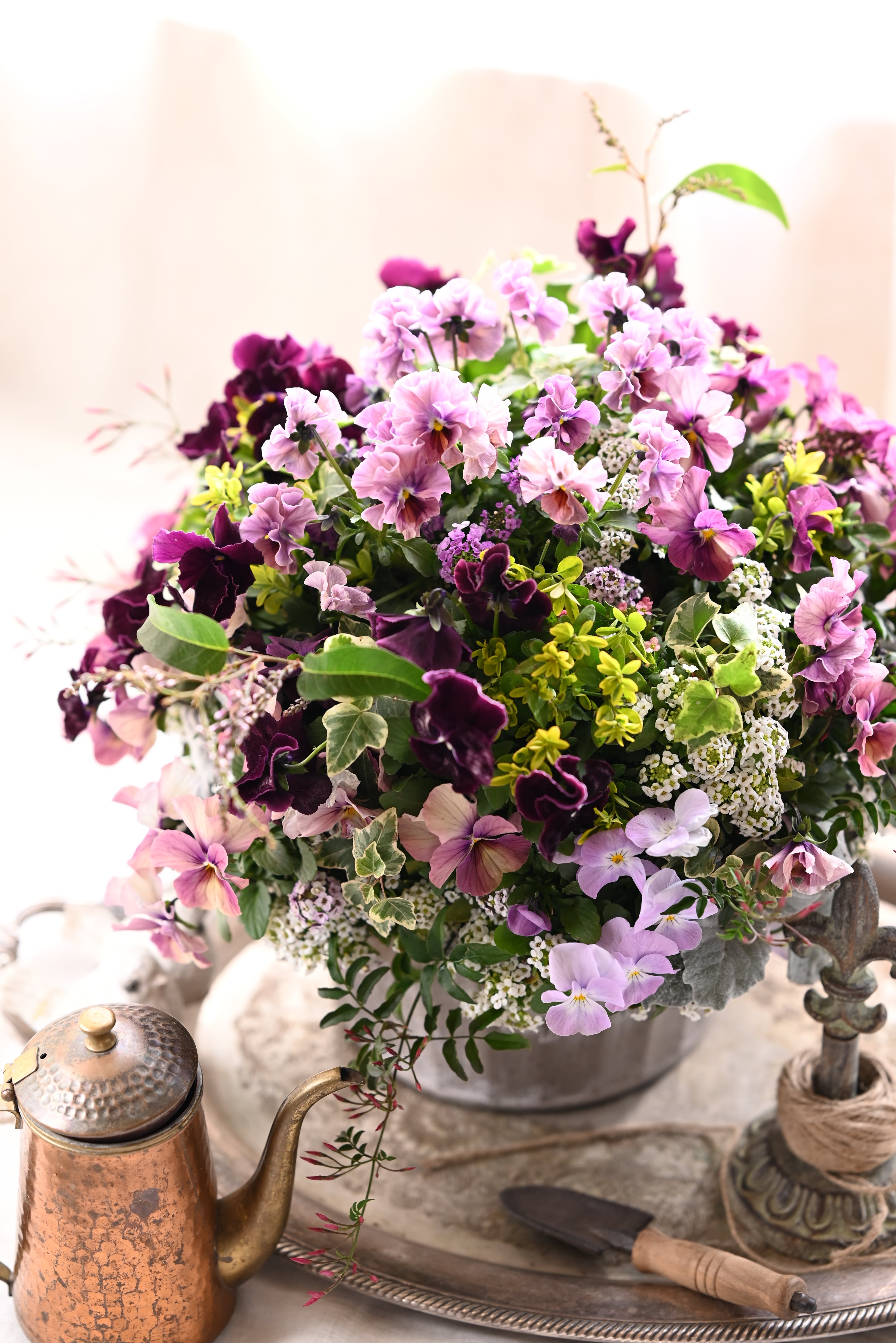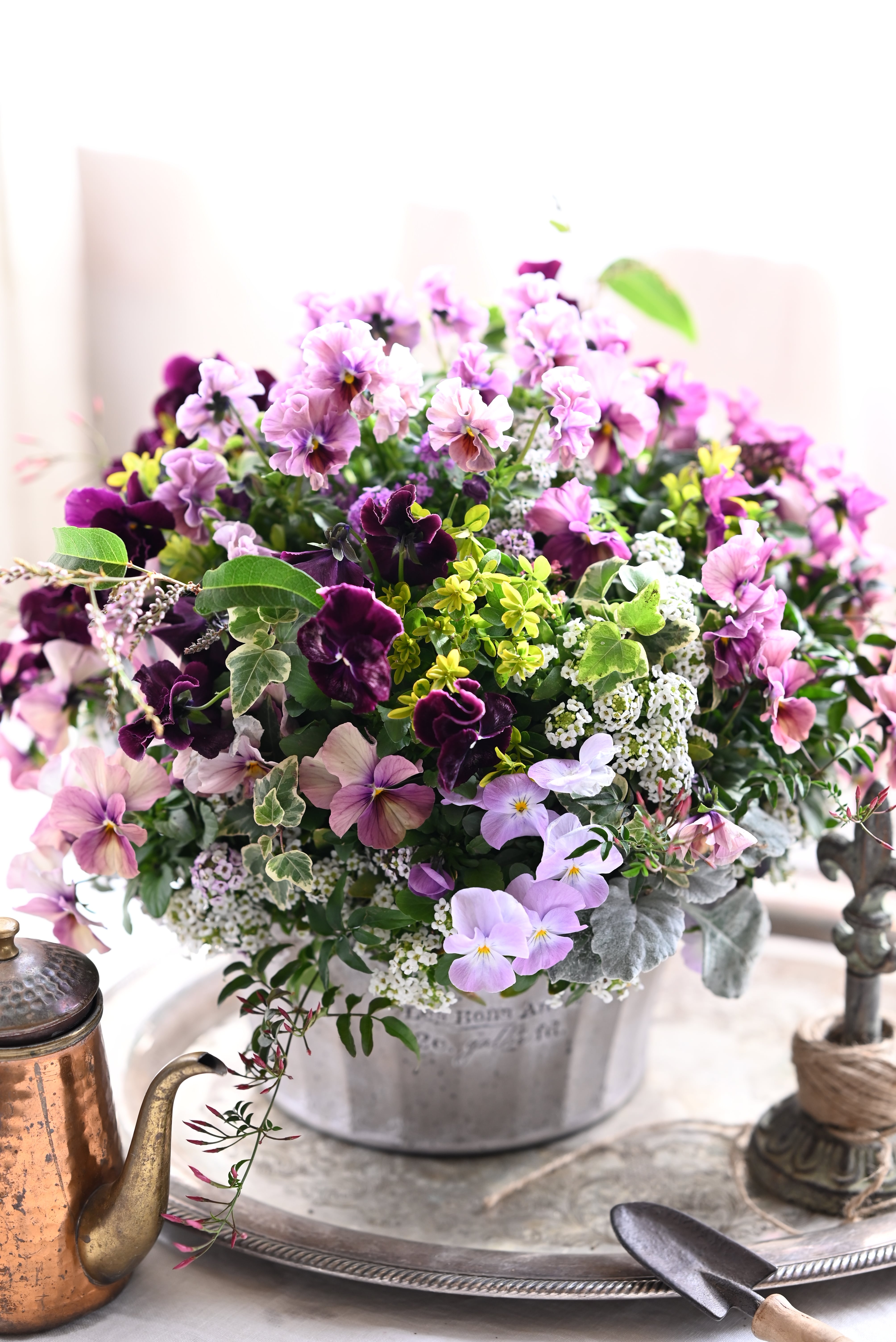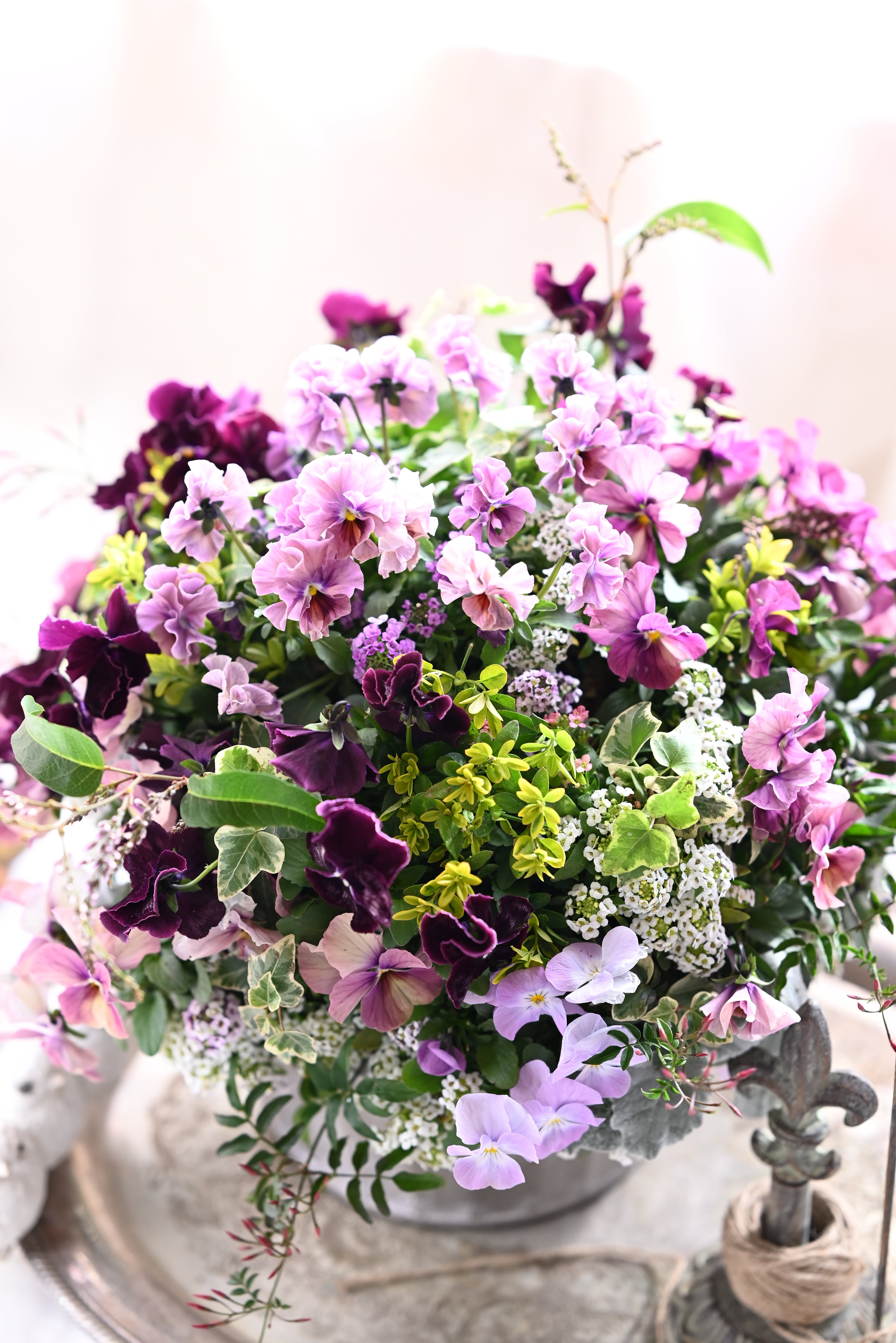 花材 ビオラ「ももかしんしん」、パンジー「プチグレース」、フリルビオラ「トミーの庭」、他2種、アリッサム、ハーデンベルギア、ハゴロモジャスミン、ヘデラ、ヒマラヤソケイ、シロタエニュールック