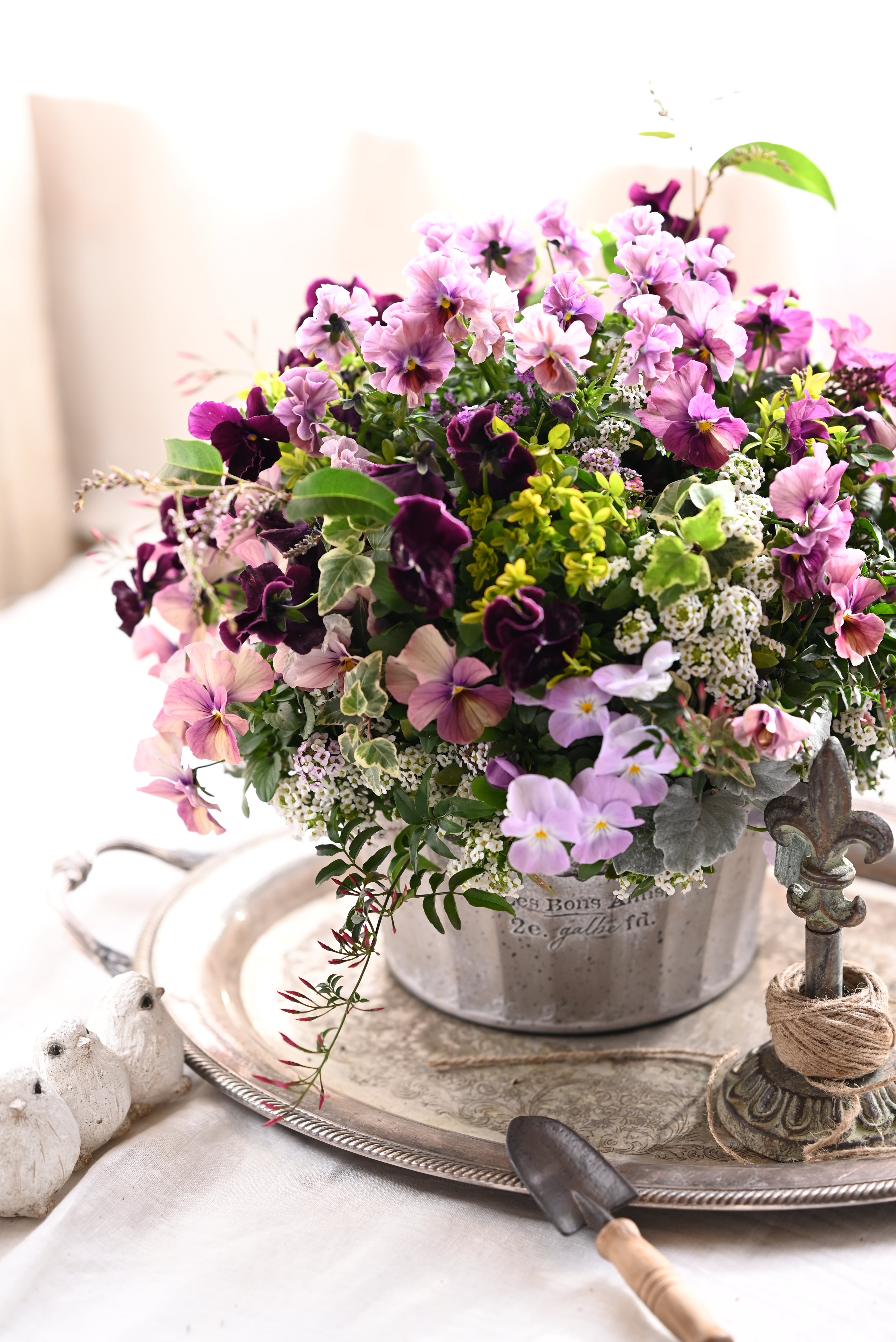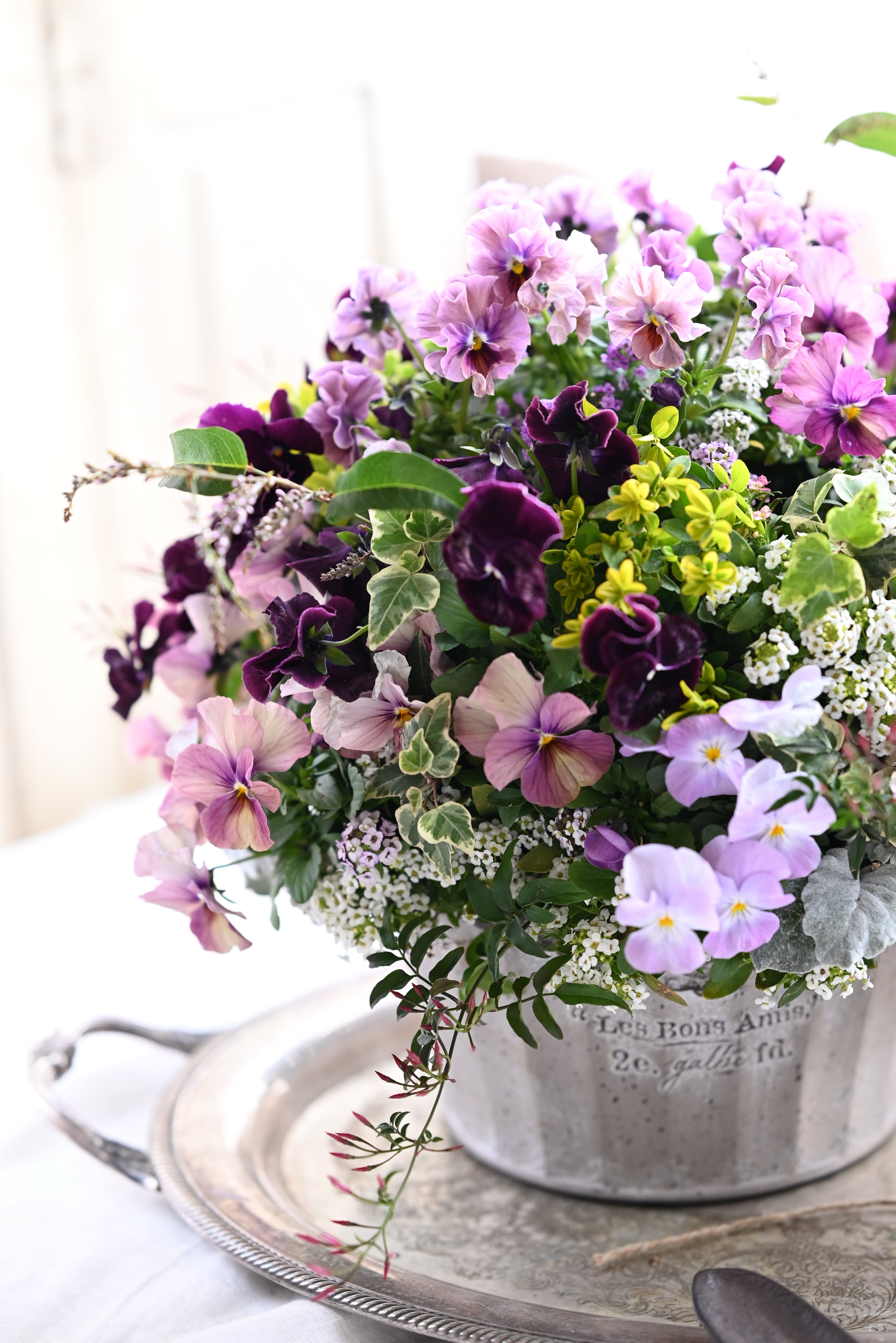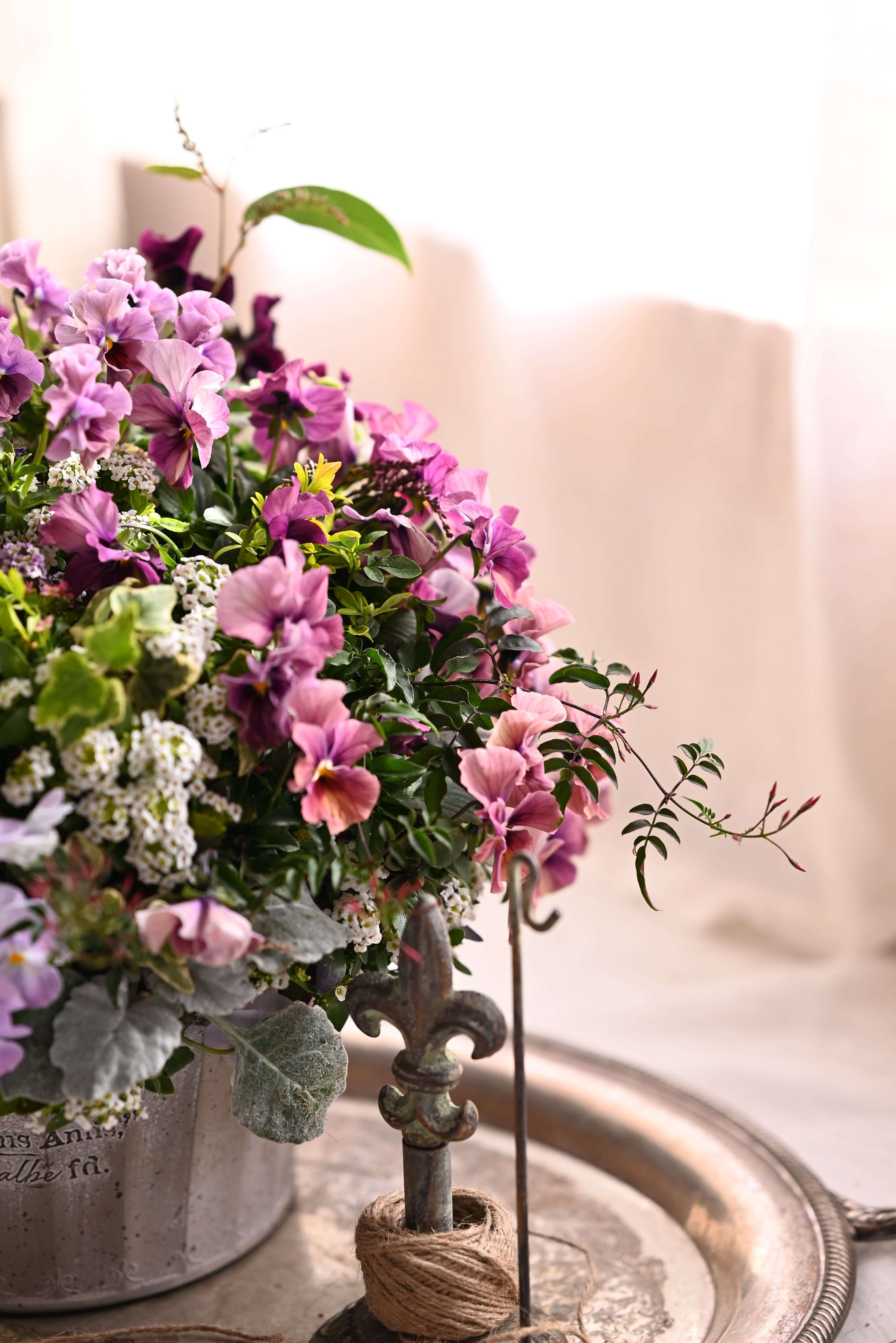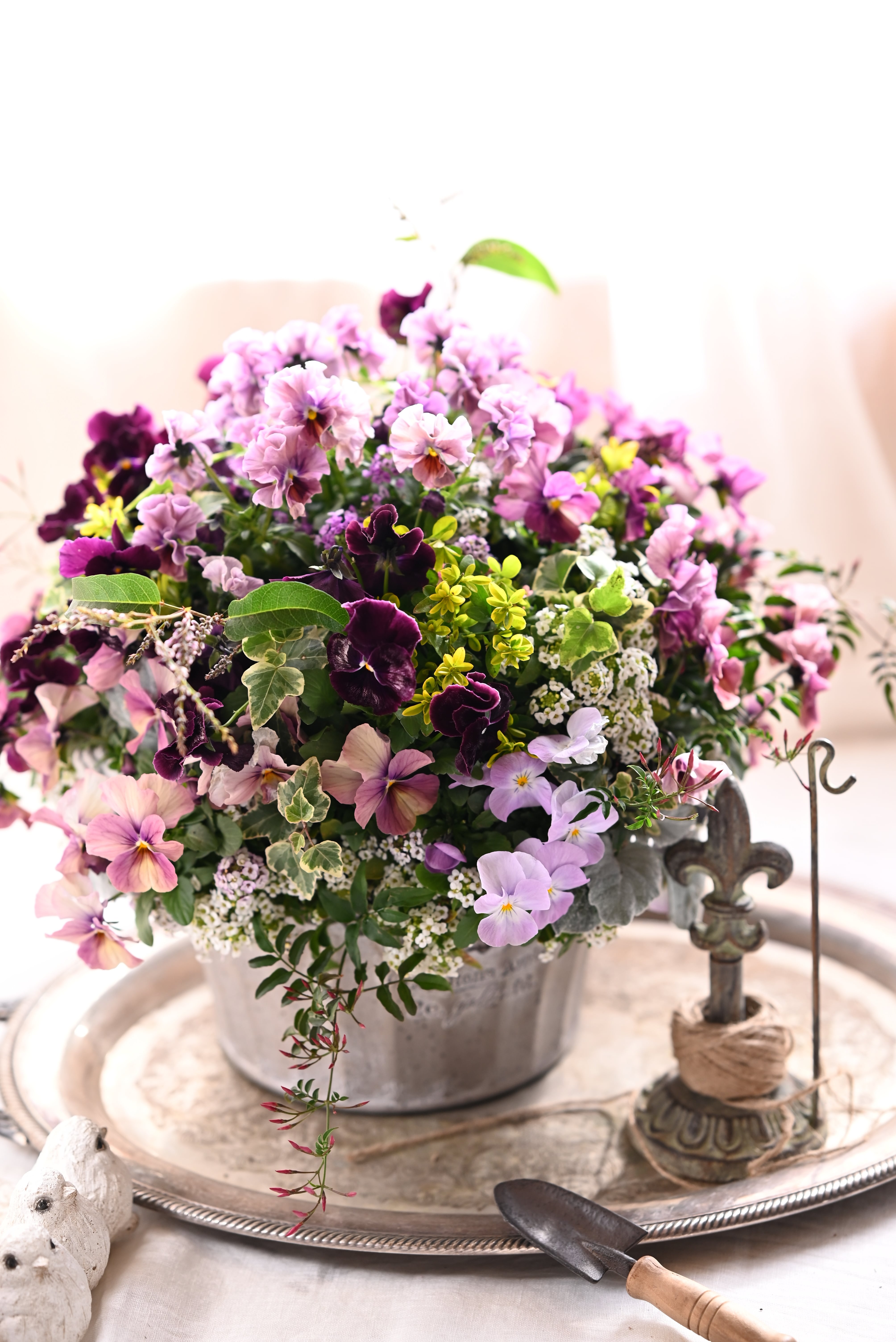 花材 ビオラ「ももかしんしん」、パンジー「プチグレース」、フリルビオラ「トミーの庭」、他2種、アリッサム、ハーデンベルギア、ハゴロモジャスミン、ヘデラ、ヒマラヤソケイ、シロタエニュールック