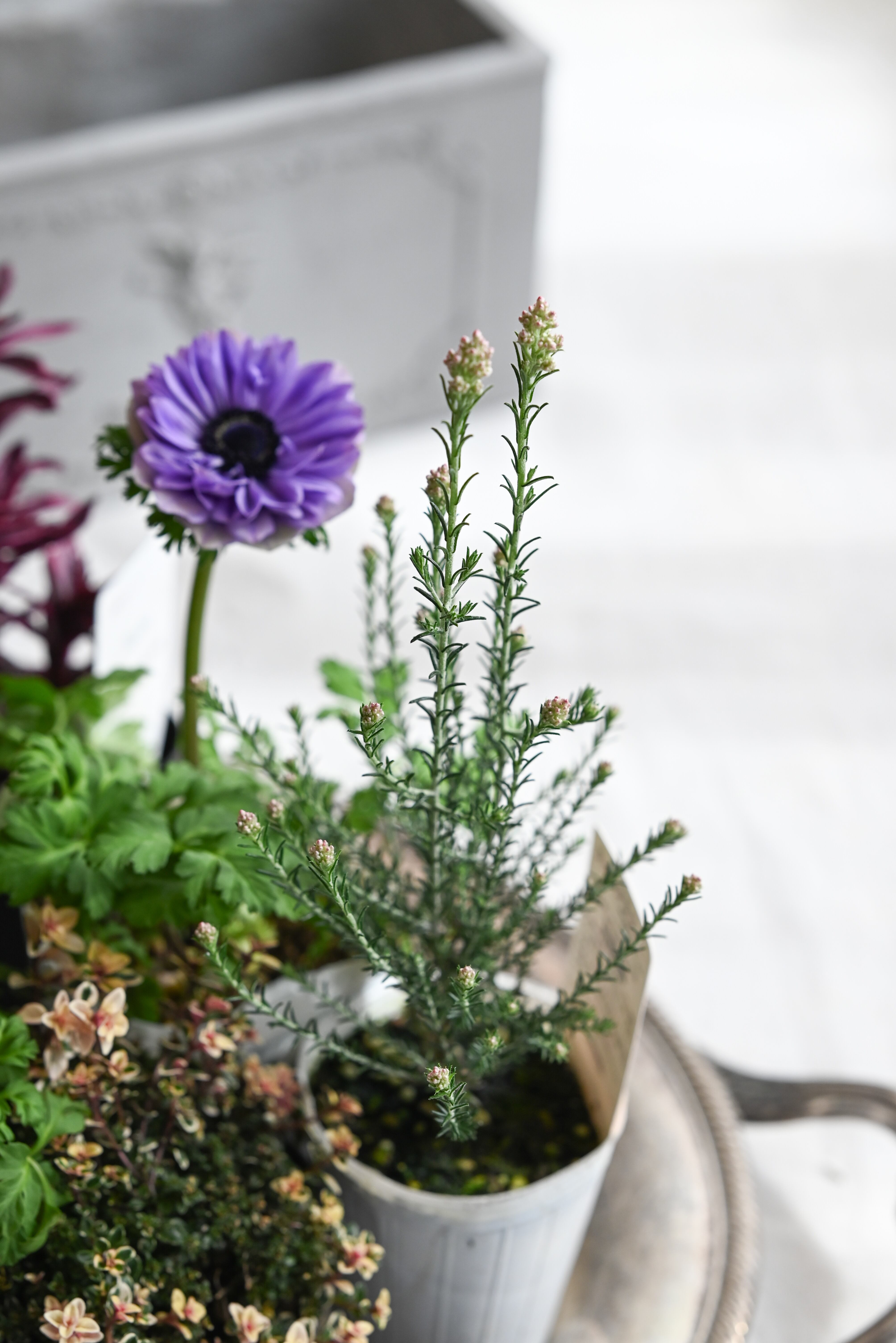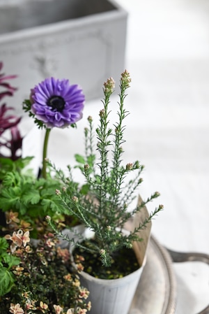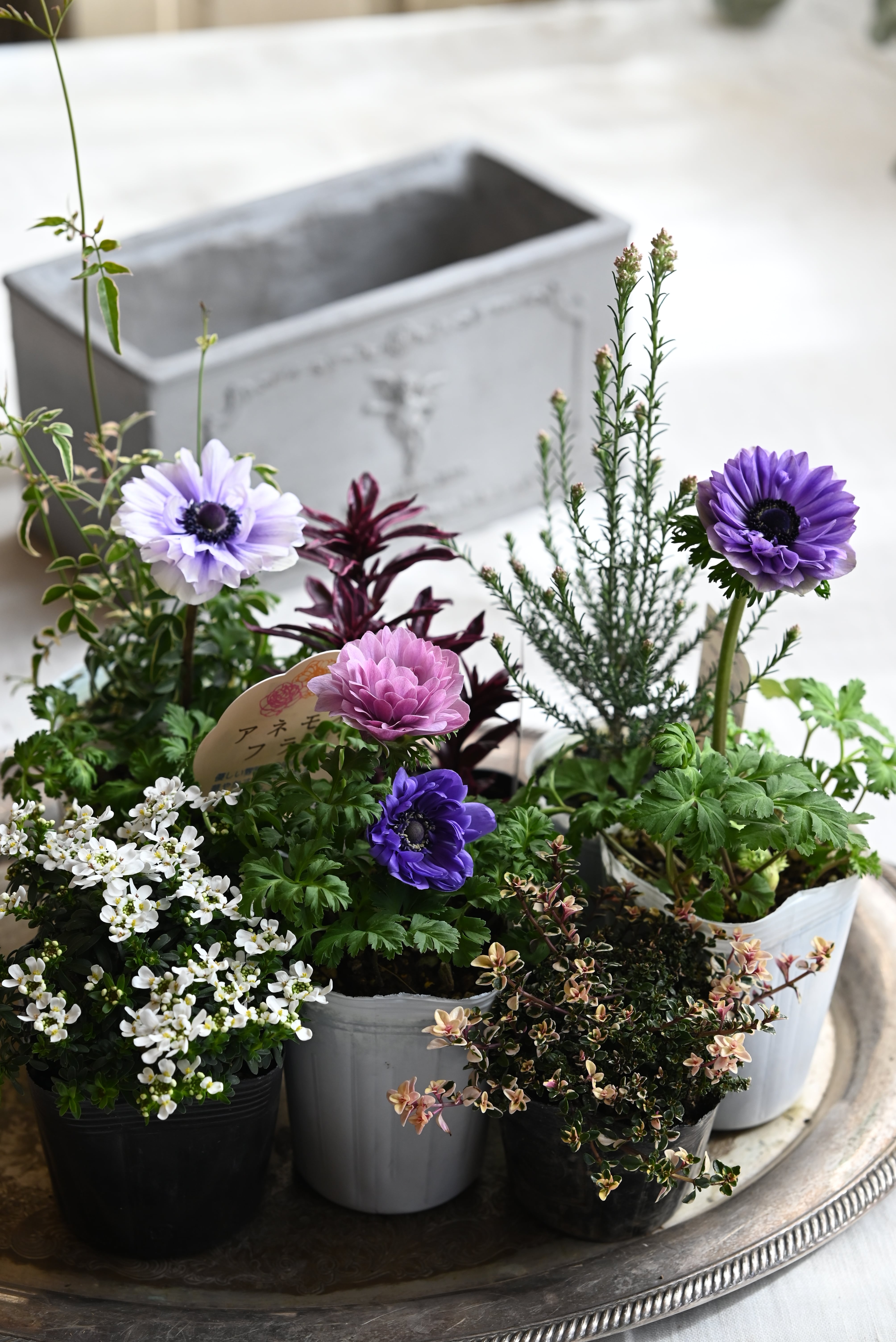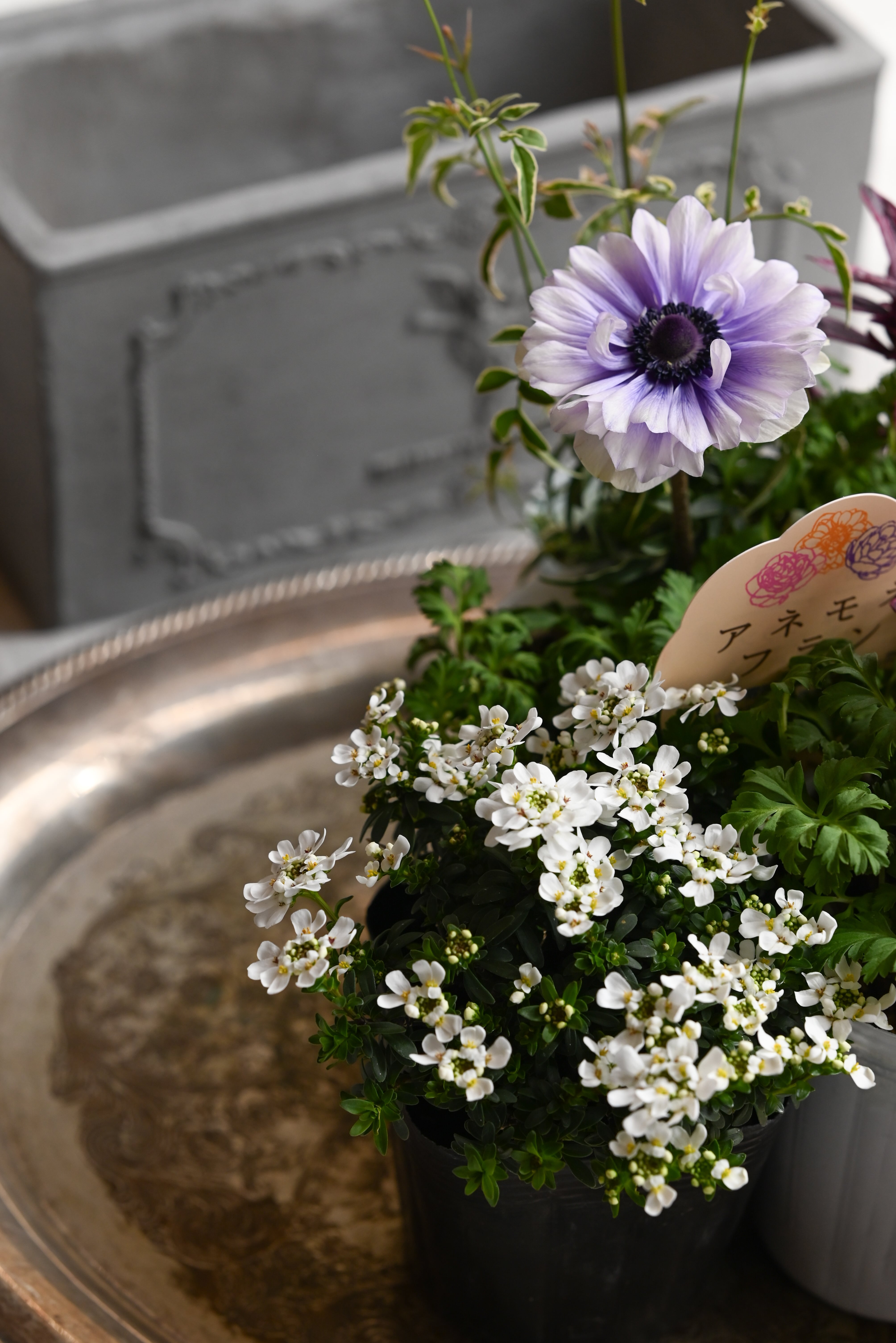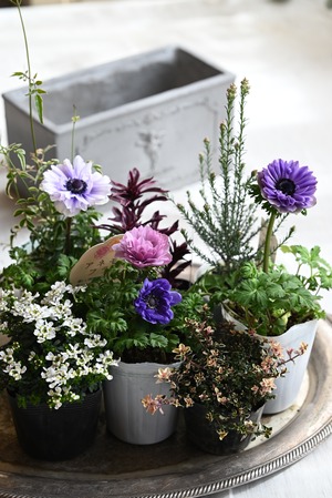 花材 アネモネフラン3ポット(1ポット2球入)、イベリス(株分け可能)、ヘーベアイスイザベラ(株分け可能)、ハゴロモジャスミンミルキーウェイ(株分け可能)、ピンクのライスフラワー、フォックスリータイム(+鉢)