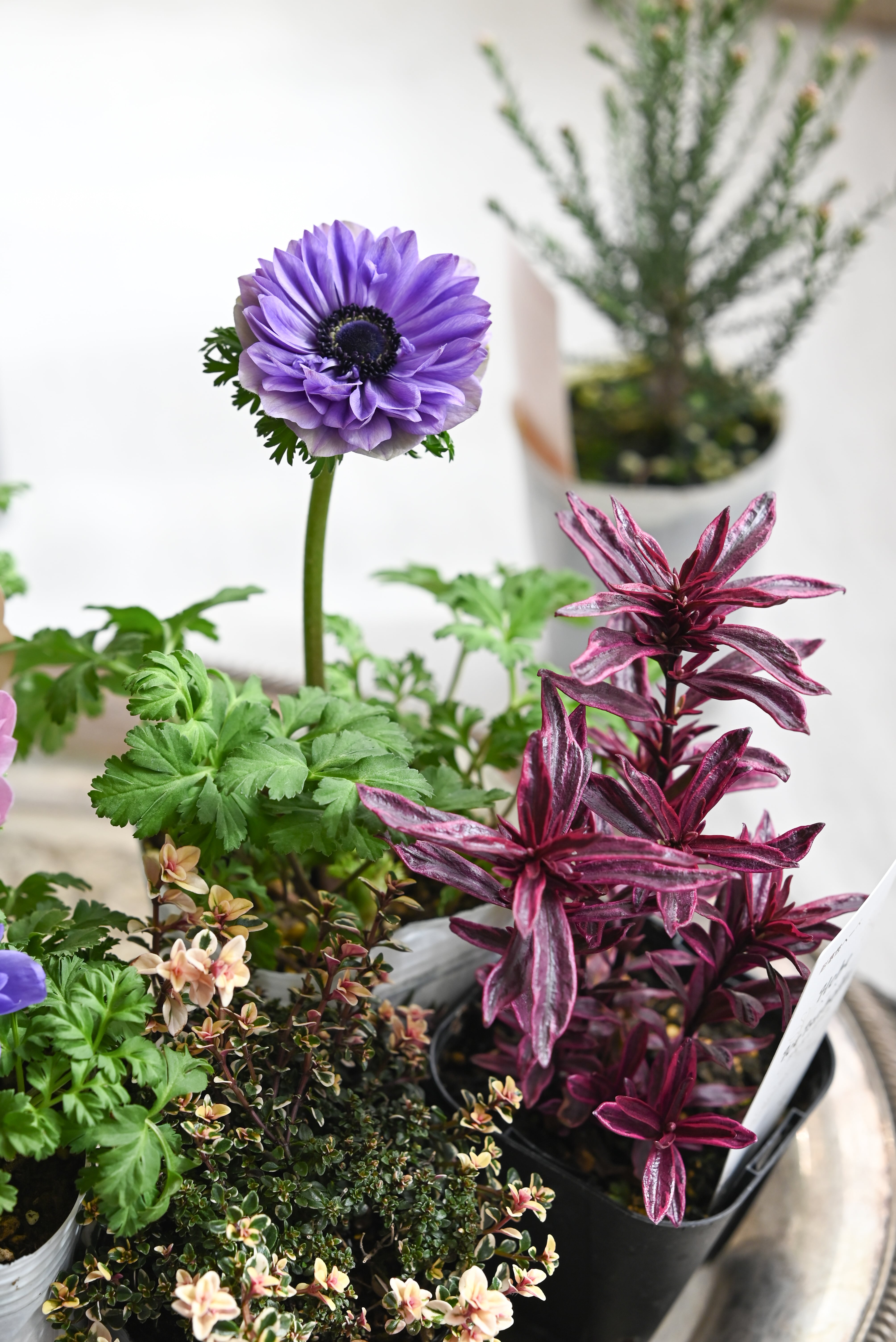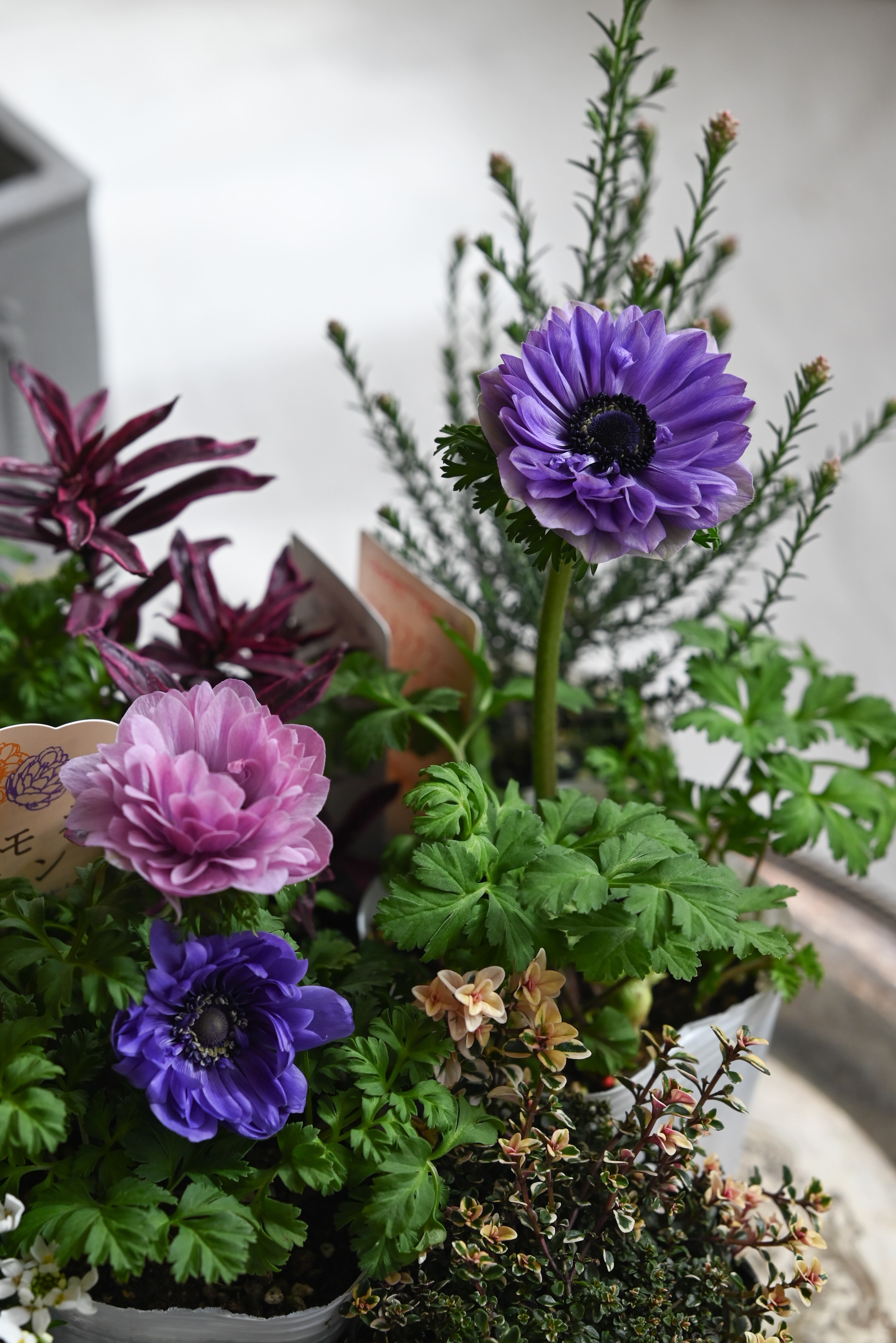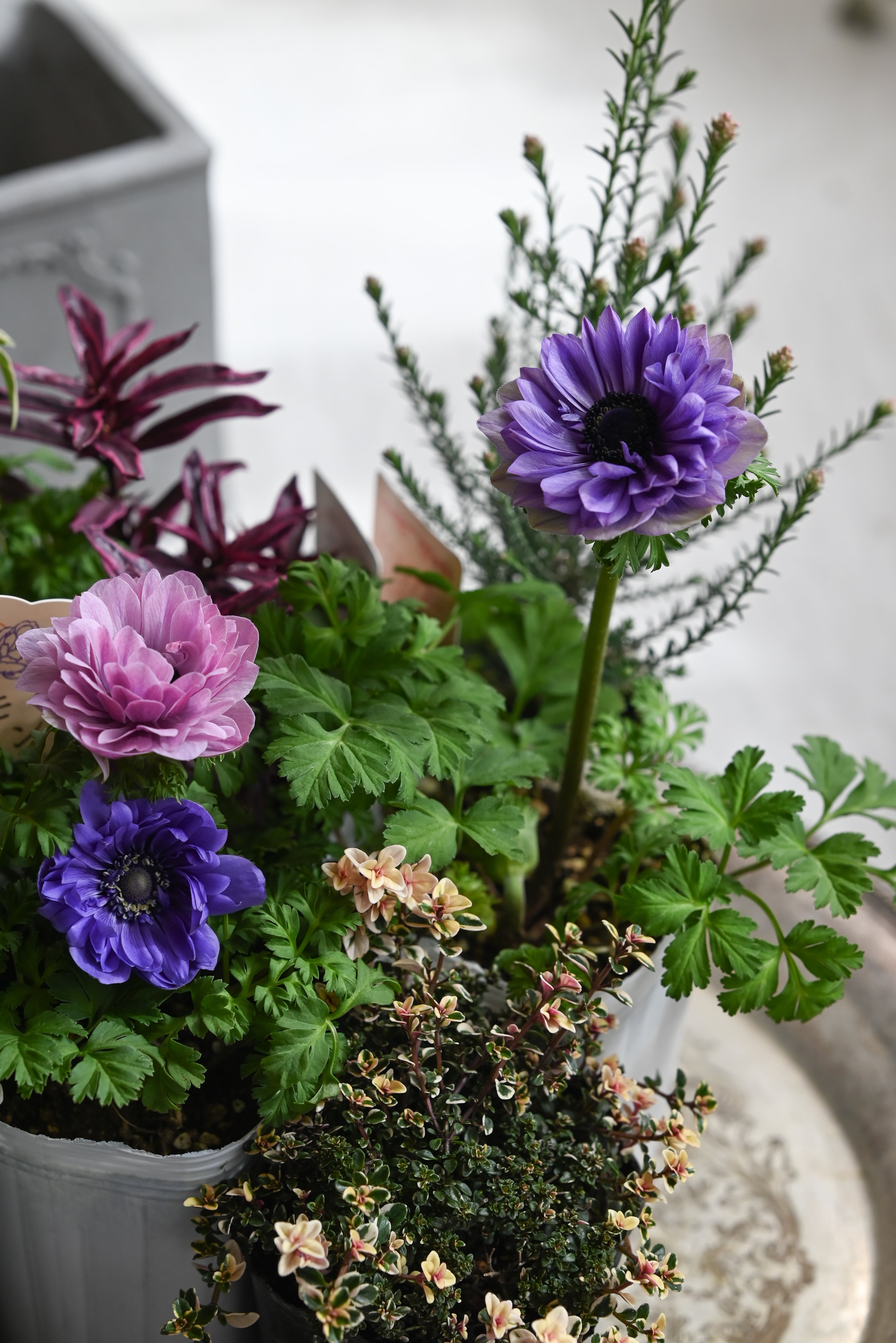 アネモネフランは今シーズンの新作。広原園さん×ハピネスさんコラボの八重咲きアネモネ。1ポット2球植えでパステルからビビッドまでコロコロふりふりのアンティークかわいいお花が次々咲きます。特に人気のアンティークパープル系を選び3ポットセットしました。その他、株分け可能なイベリス、レッドパープルに色づいたヘーベアイスイザベラ(株分け可能)、ハゴロモジャスミンミルキーウェイ(株分け可能)、ピンクのライスフラワー、フォックスリータイムをセットしました。器は人気のグレーのエンジェルポットをオプションでつけることができます。アンティークなギャザリング寄せ植えが作成できる花苗セットです。春遅くまで次々と花が咲くアネモネは植えっぱなしでも来年また花を咲かせます。その他の植物も宿根草です。長く楽しんでいただけます。