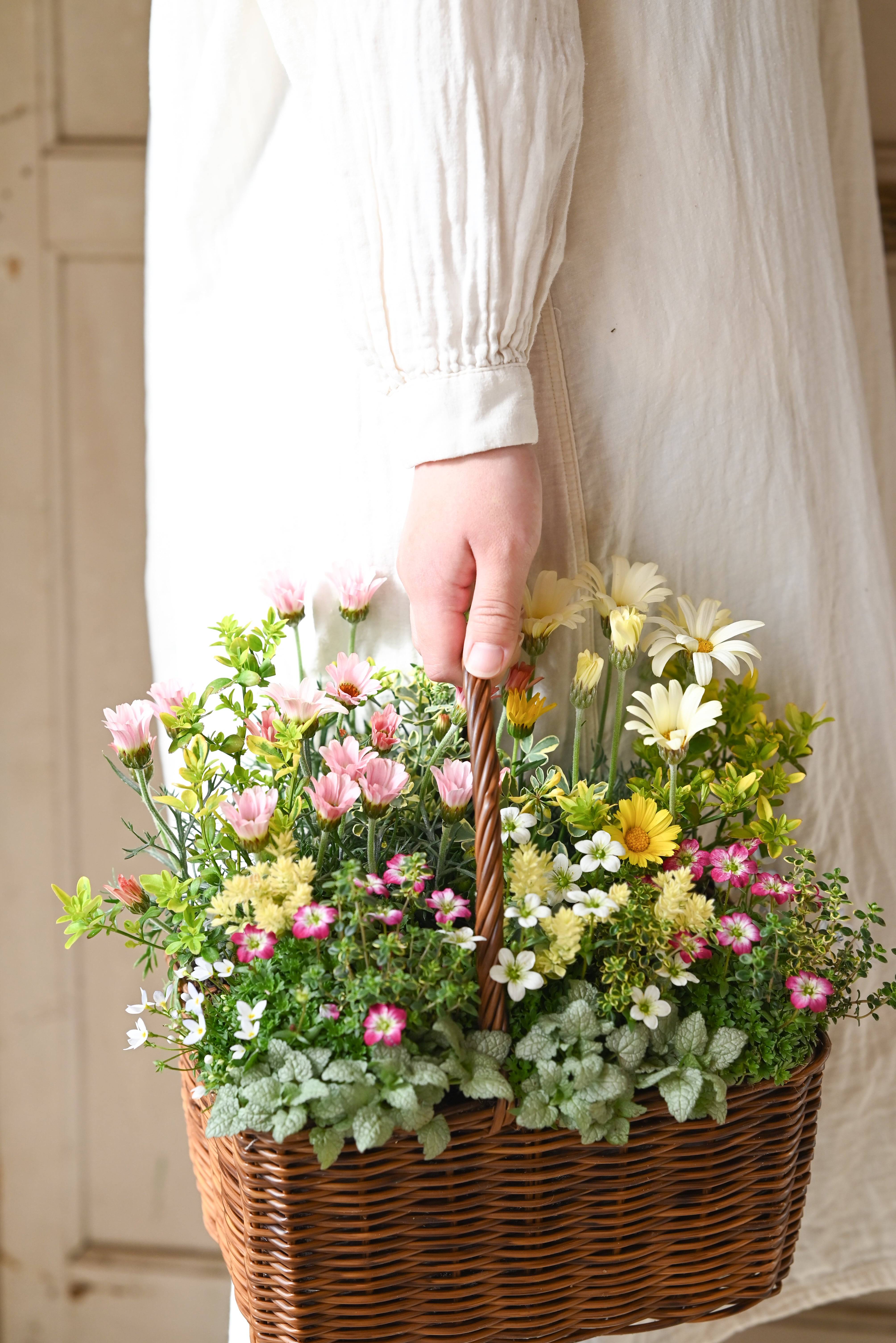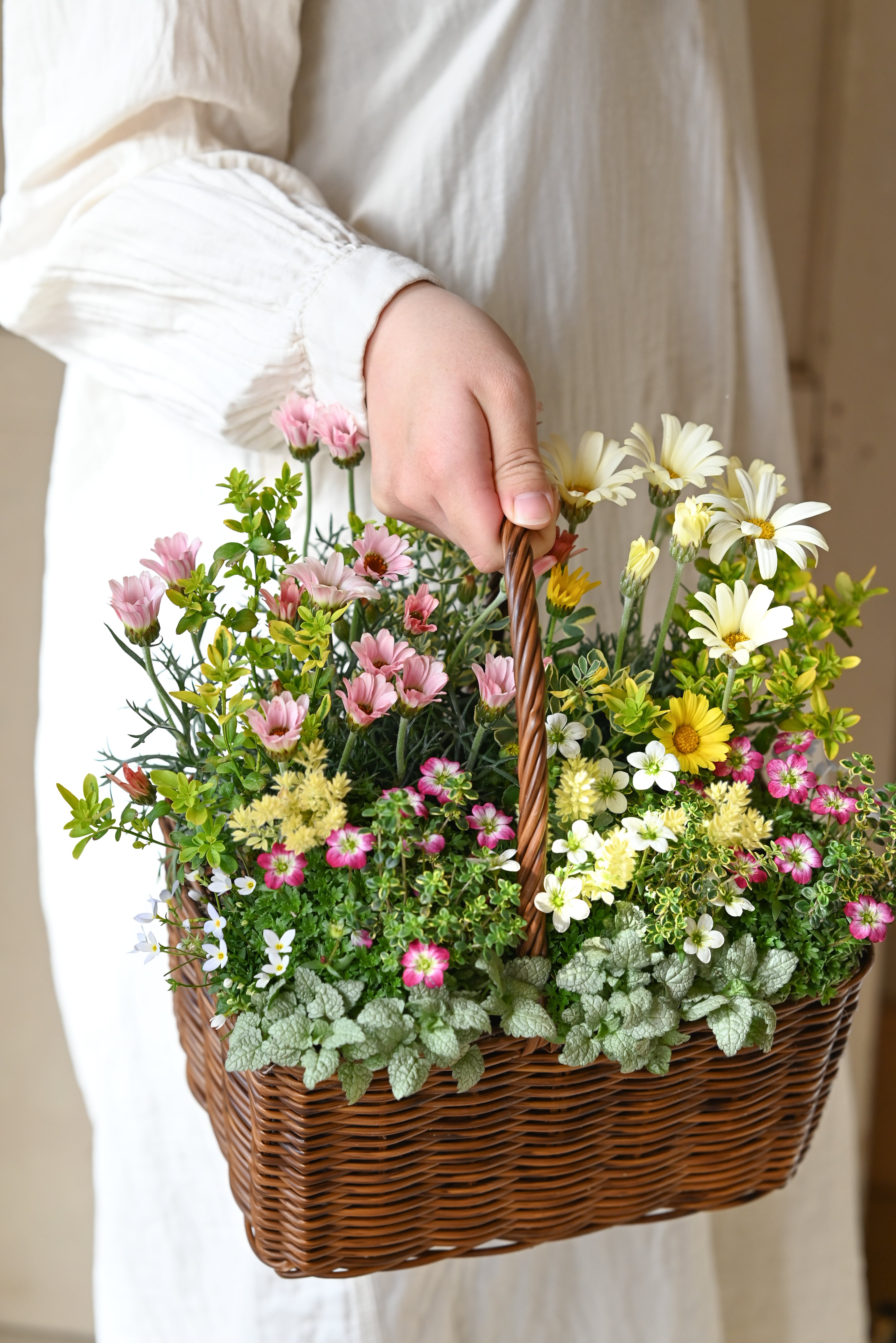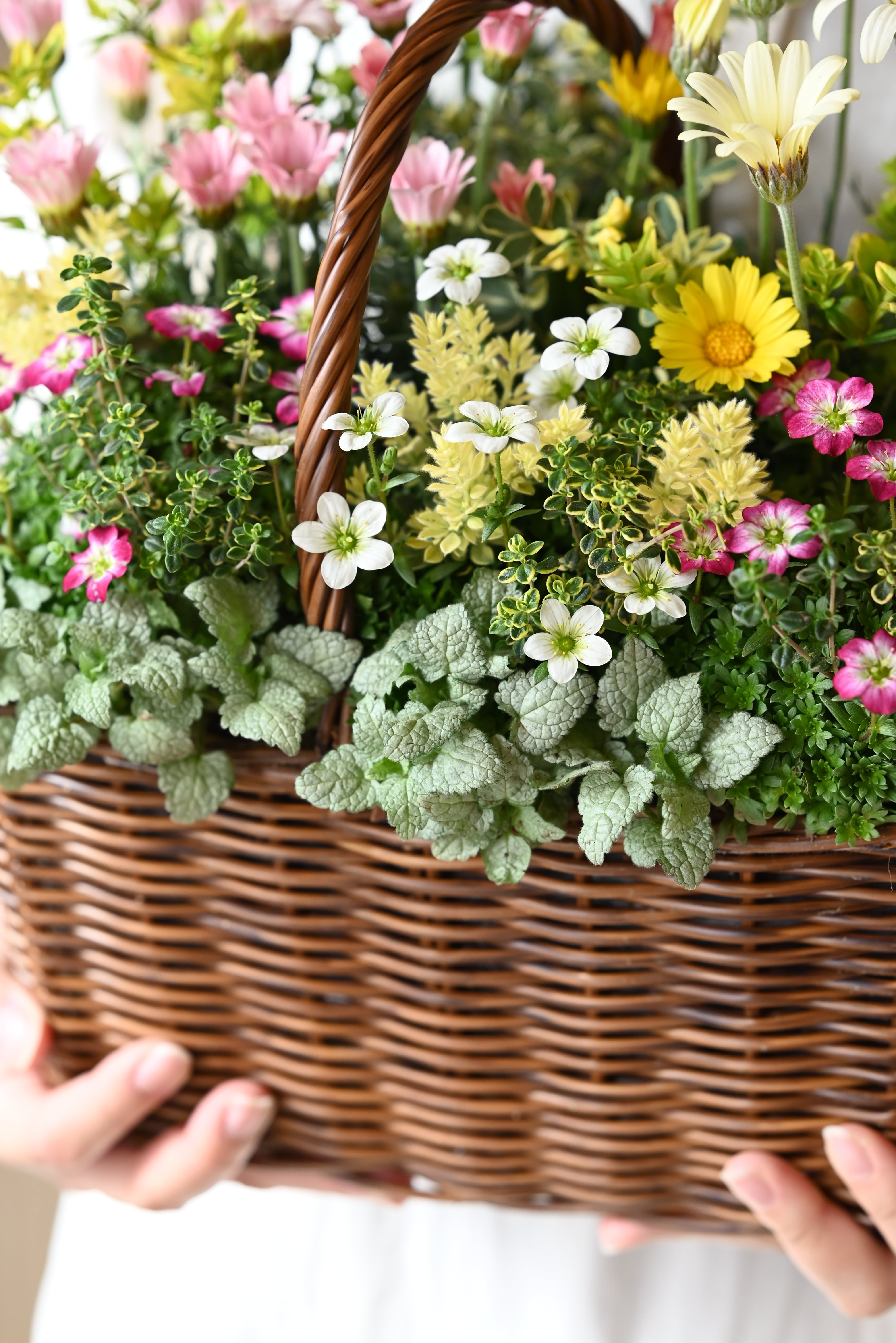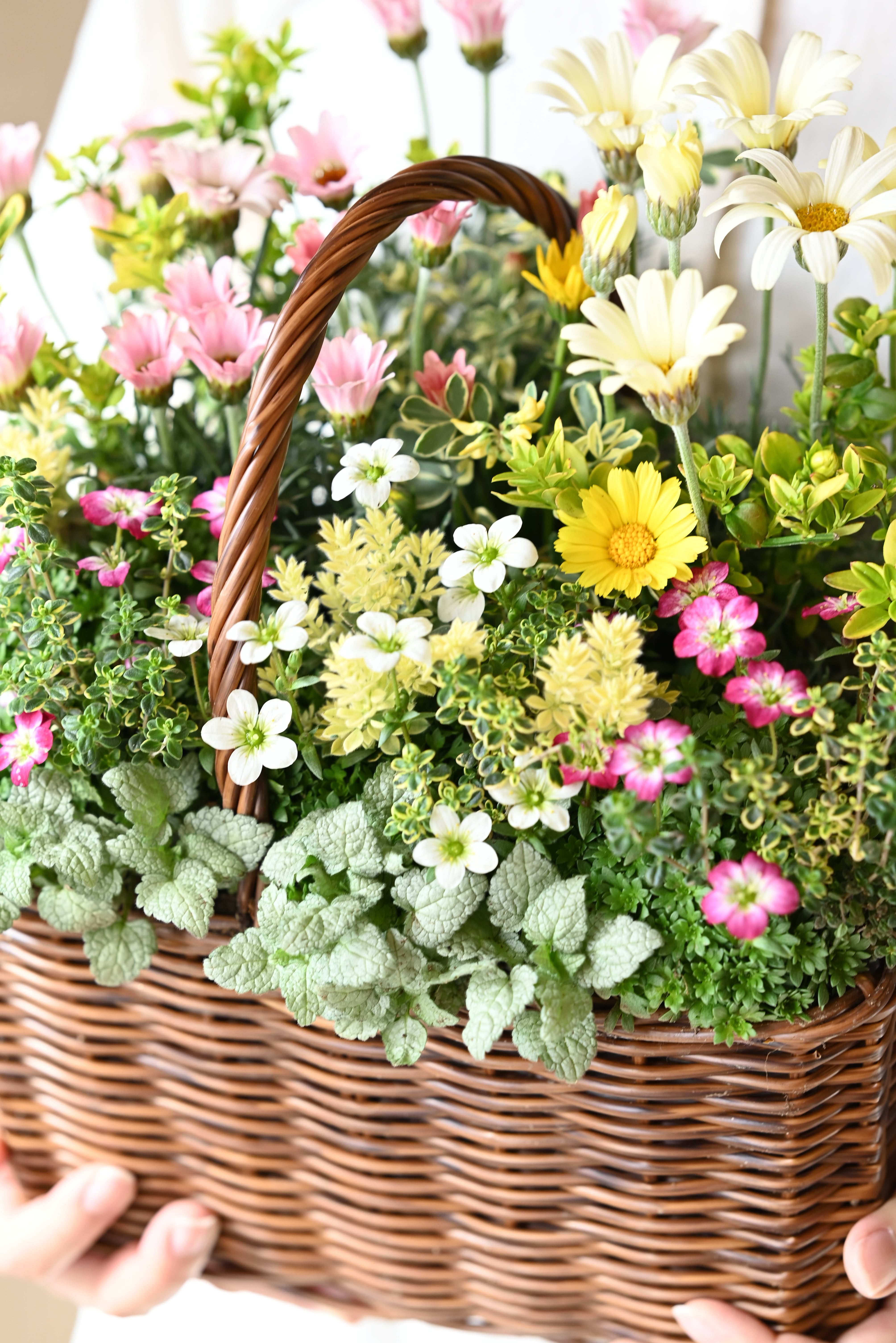 ローダンセマムと雲間草の春の野原花籠