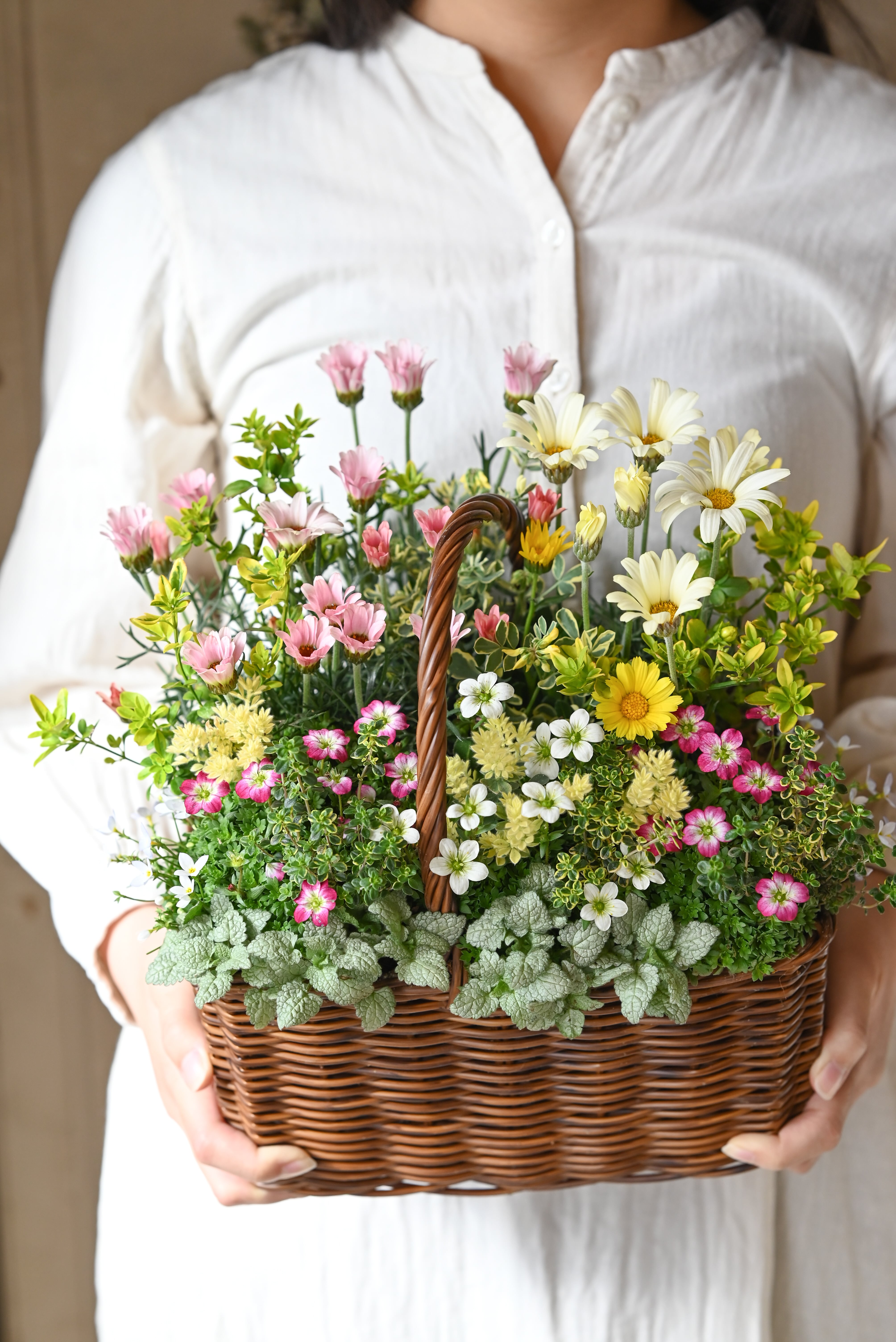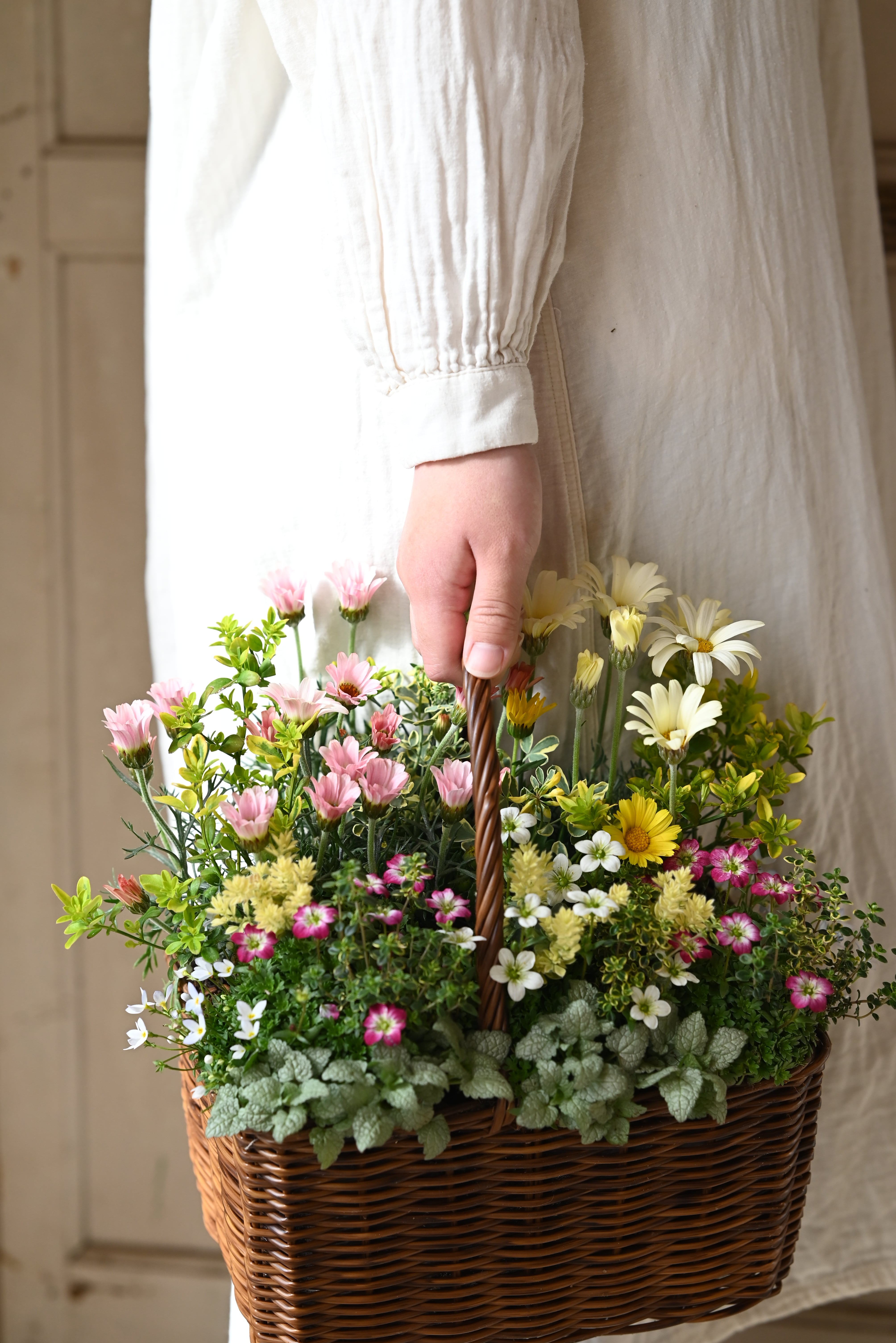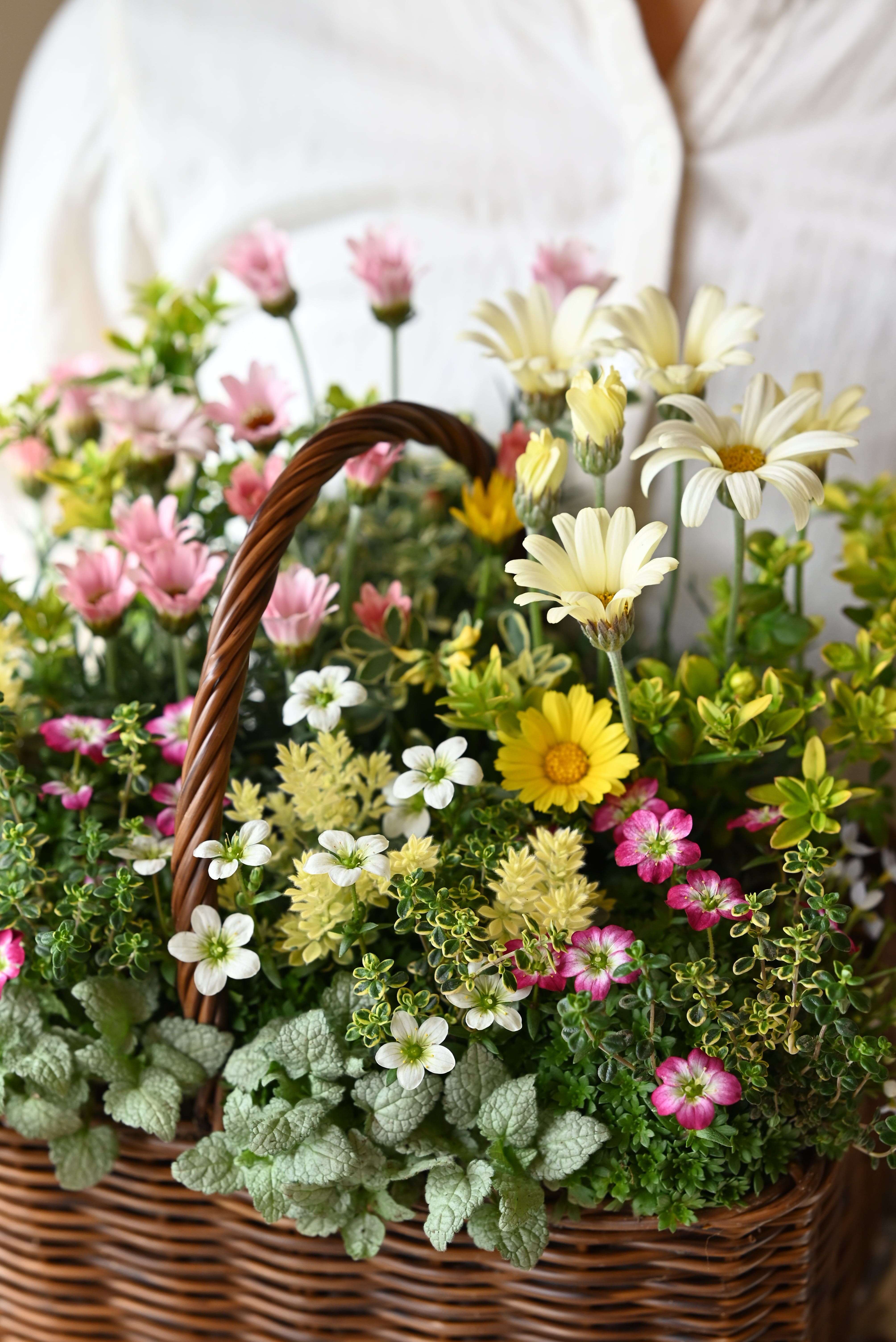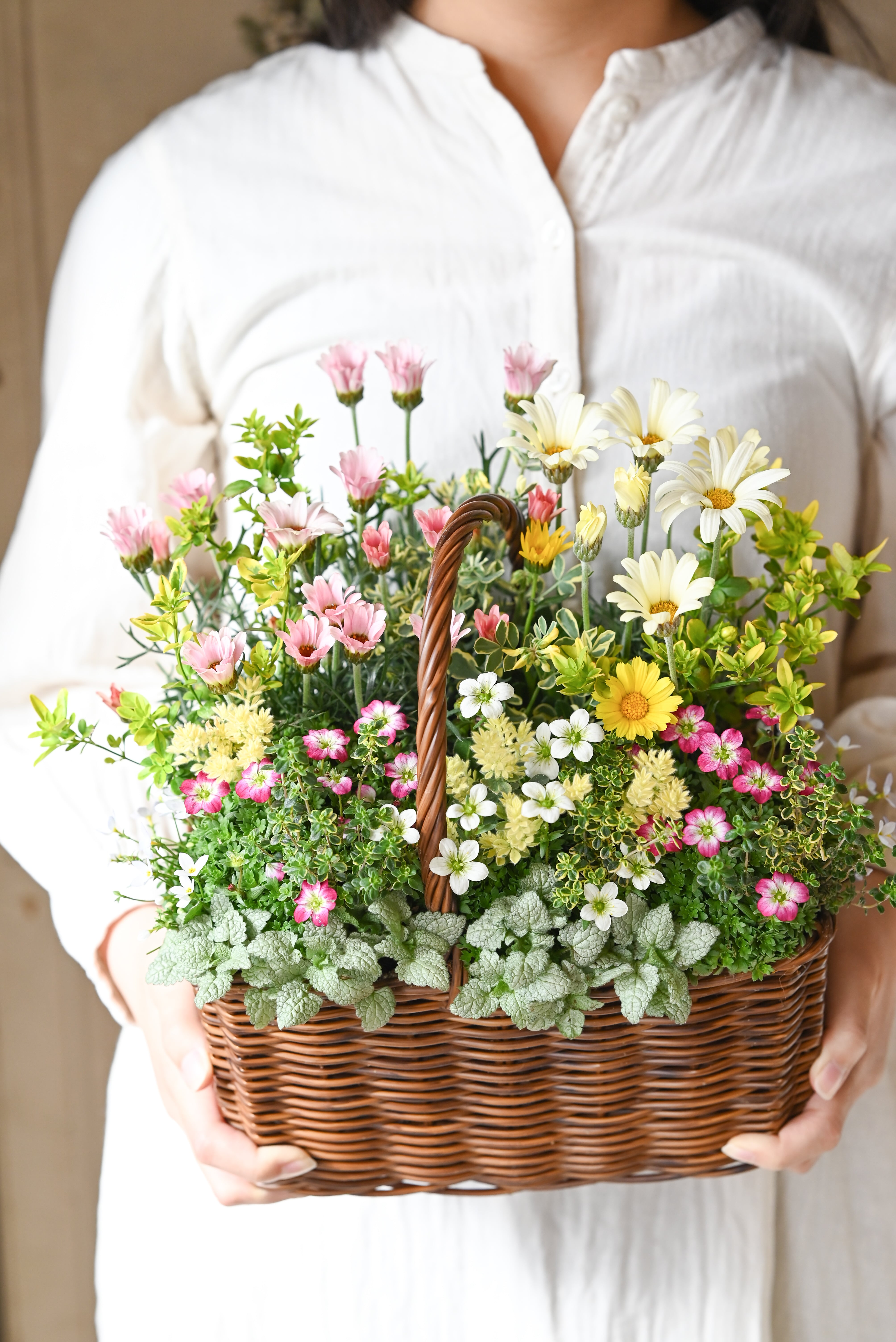 ローダンセマムと雲間草の春の野原花籠