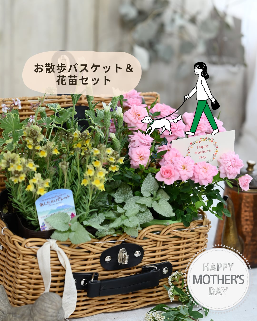 当店セレクトのかわいい花苗と汚れに強いバスケットのセットです。花苗を出してお庭や鉢に植えていただけます。バスケットはビニールの内張りがあり、再生プラスチック製で水洗い可能です。ワンちゃんの散歩グッズを入れたりガーデニンググッズを入れたり様々な用途に使っていただけます。ナチュラルでかわいい仕様でお散歩もピクニック気分です。お花好き、ガーデニング好きワンちゃんママへギフトにぴったりです。