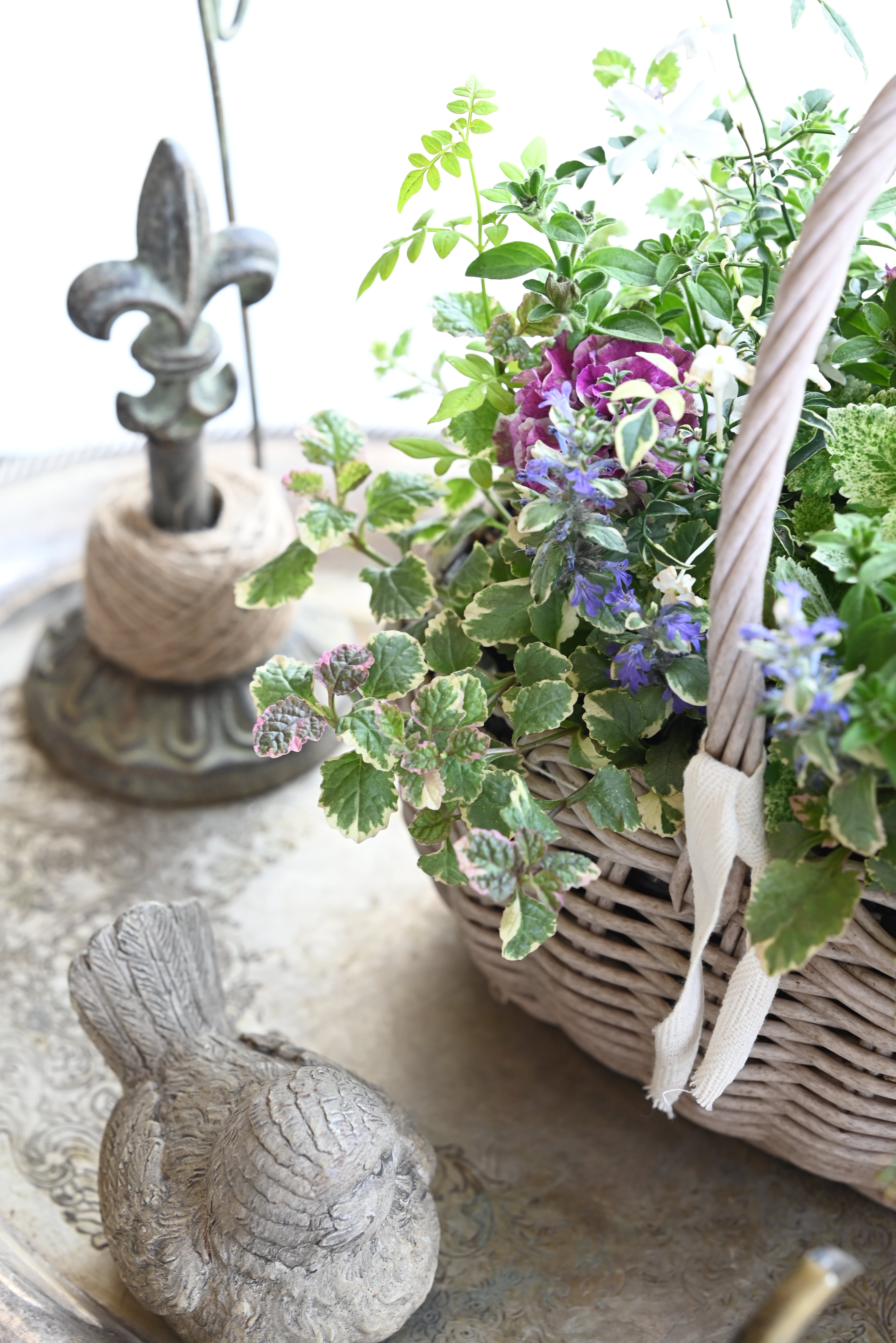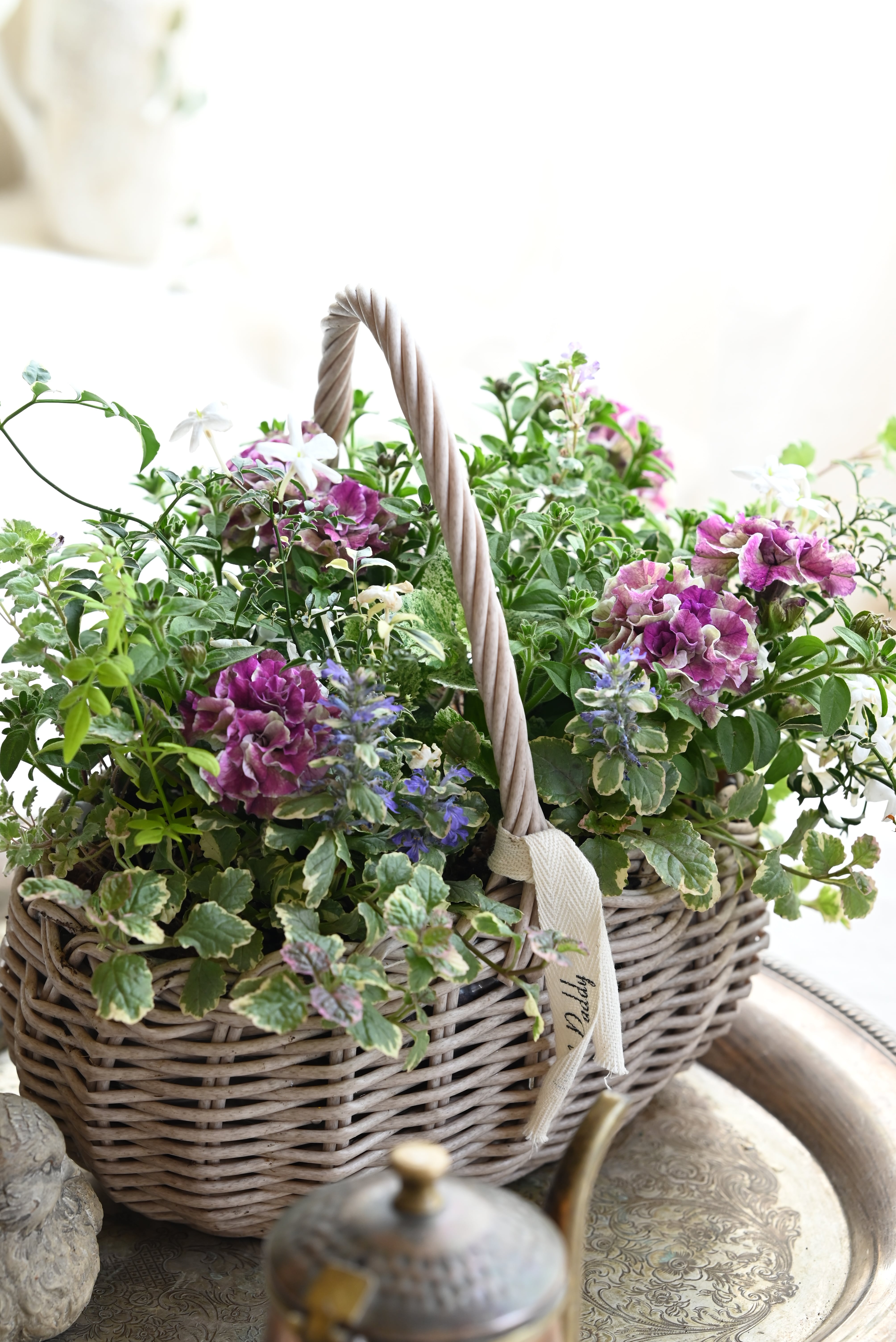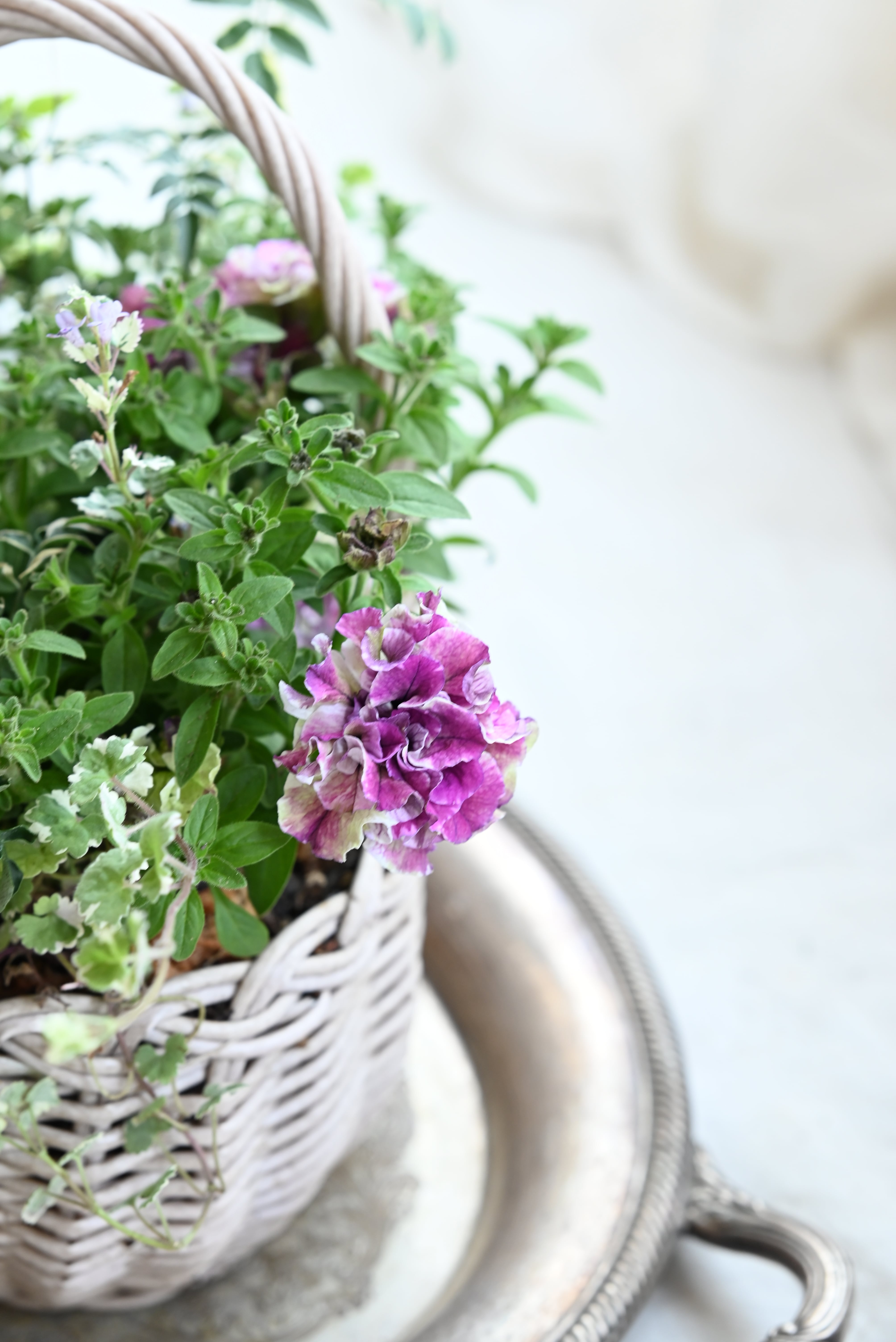 八重咲きで薔薇のようなかわいいペチュニアと白い花が良く香るハゴロモジャスミン、斑入りグレコマ、斑入りカラミンサ、アジュカなどを合わせた大人かわいい花籠です。アジュカにはブルーのお花が咲いています。ペチュニアホワイトタイガーは白地にモーブピンクが入るとても花もちのよいペチュニアです。定期的に肥料をしっかり与えることでたくさんの花をつけます。ふんわりとグリーンを合わせた大人かわいい寄せ植えを楽しんでください。