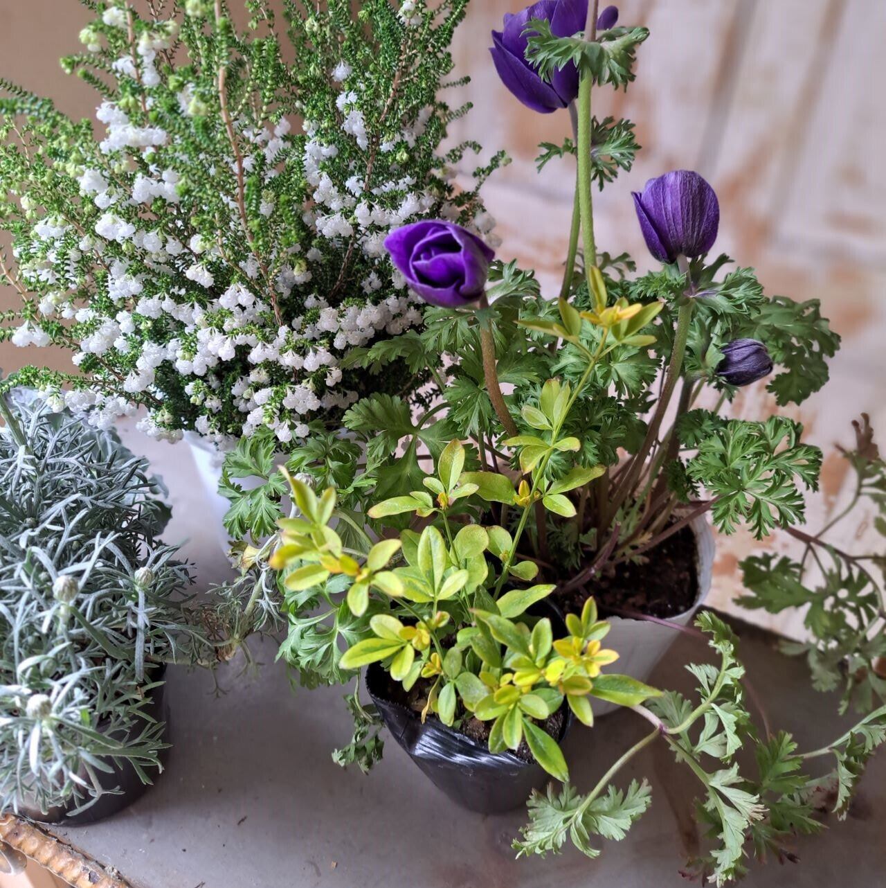 ブルーのアネモネとホワイトグリーンのお花をあわせたノーブルな印象の寄せ植えが作れる花苗セット。