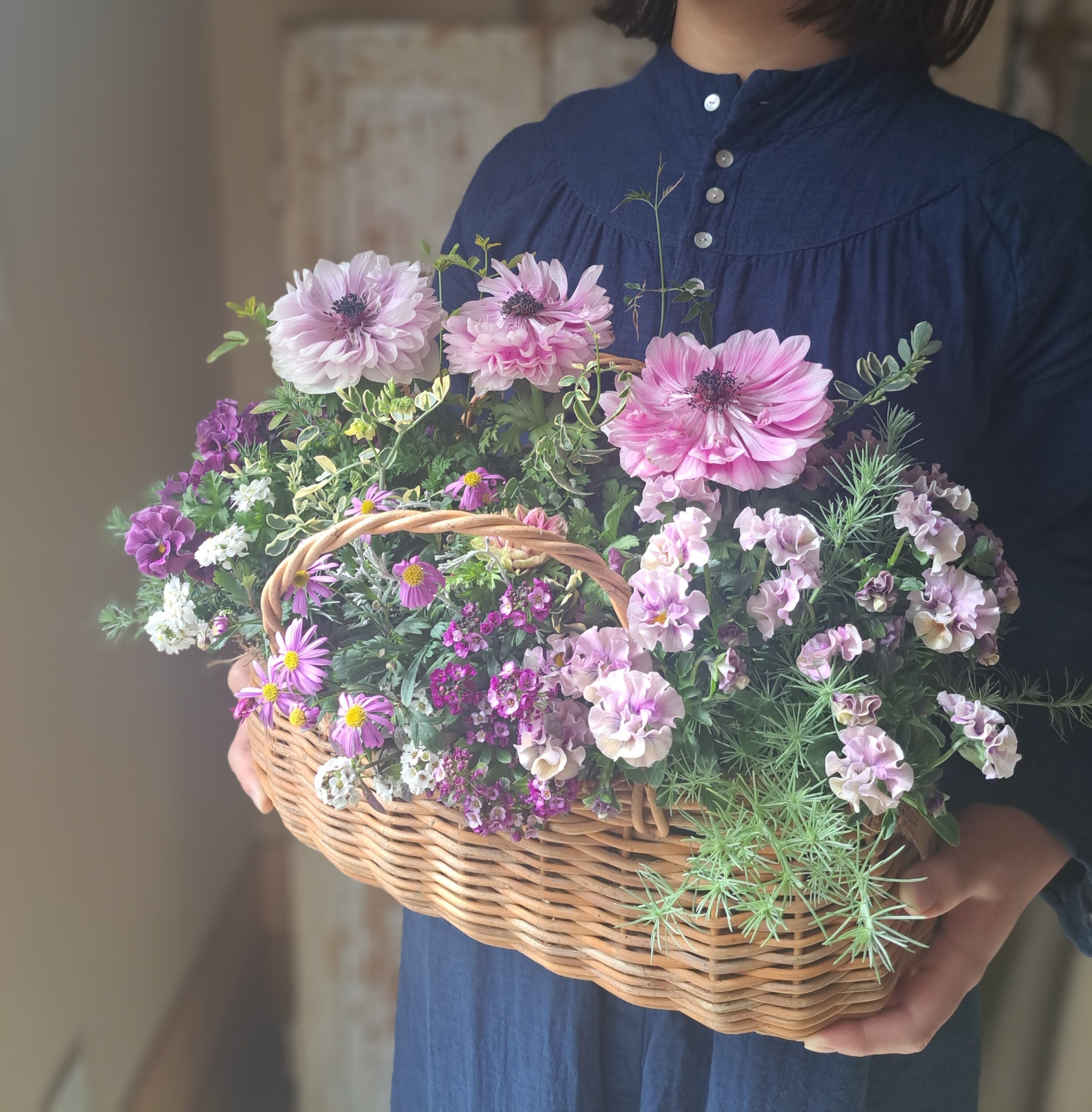 アネモネ「シフォンダブル」とうえたさんビオラ「キャンティウェーブ」のアンティークピンクの花籠