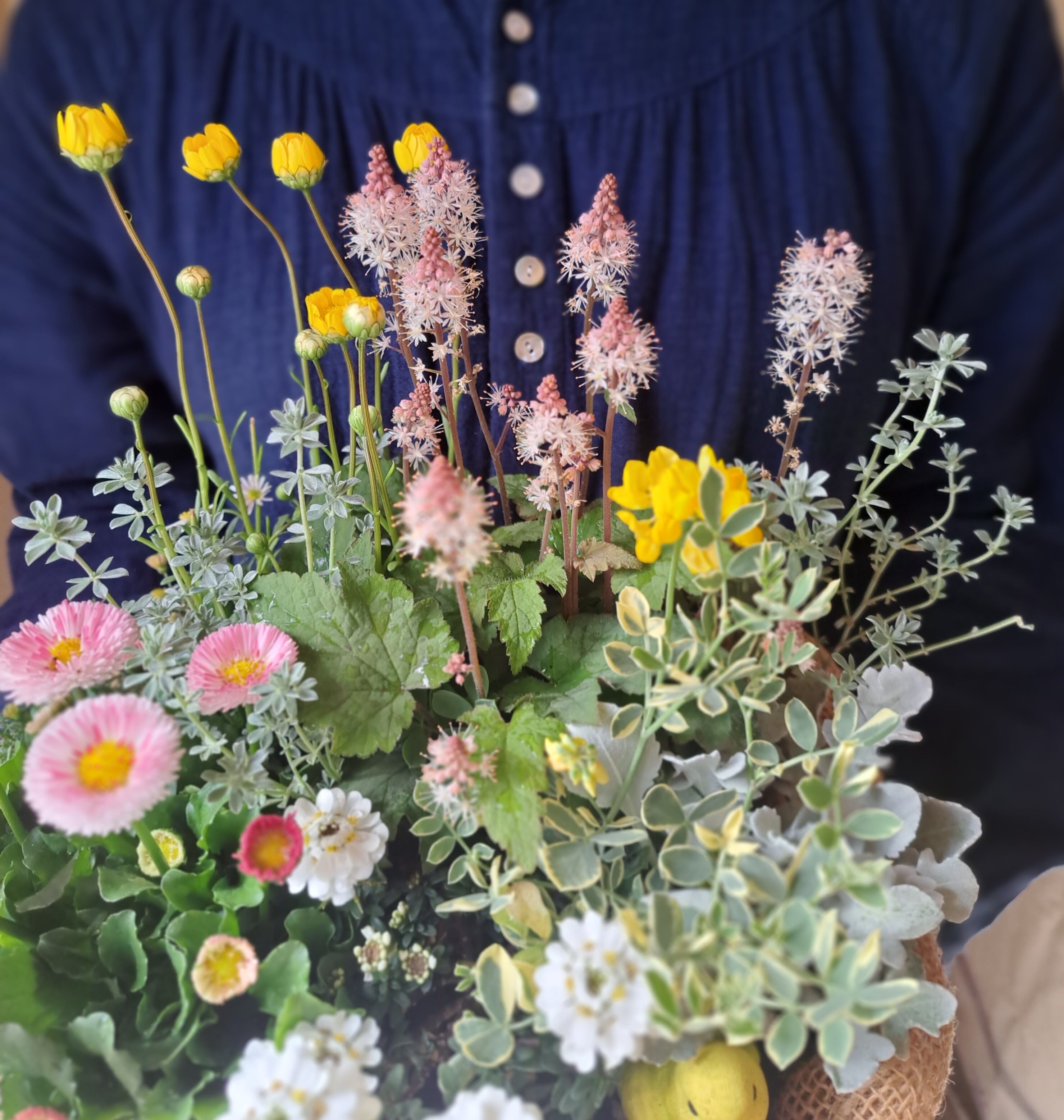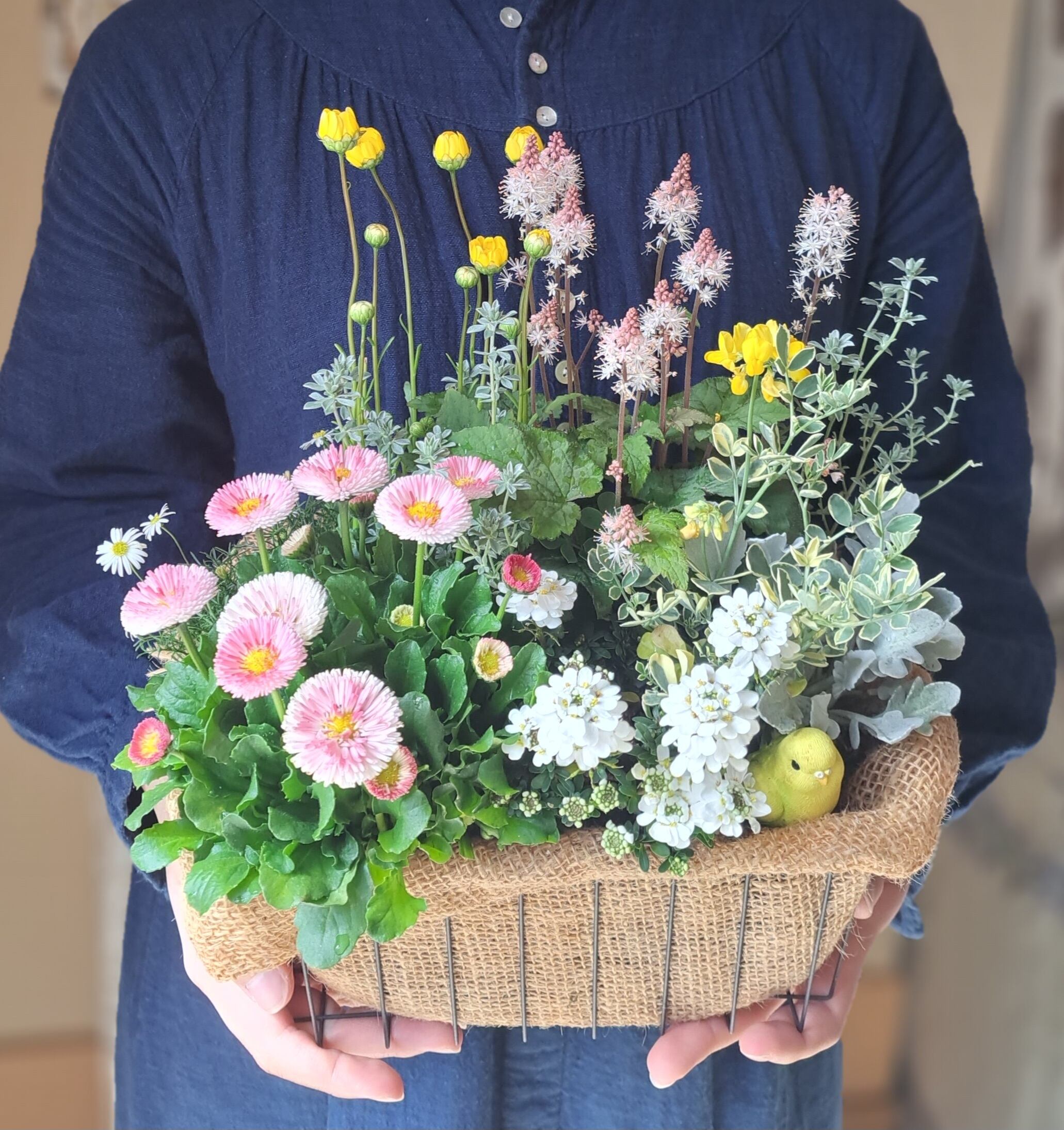 明るいピンクのデージータッソー&ストロベリークリームと淡いピンクのティアレラ、黄色のムルチコーレ、イベリス、ブラキカムホワイトなどをアイアンバスケットに植え込みました。ティアレラはほのかにスズランのような香りがします。ティアレラは丈夫で来年も楽しめ、半日陰でも花が楽しめます。真夏を直射を避けていただくと地植えも可能です