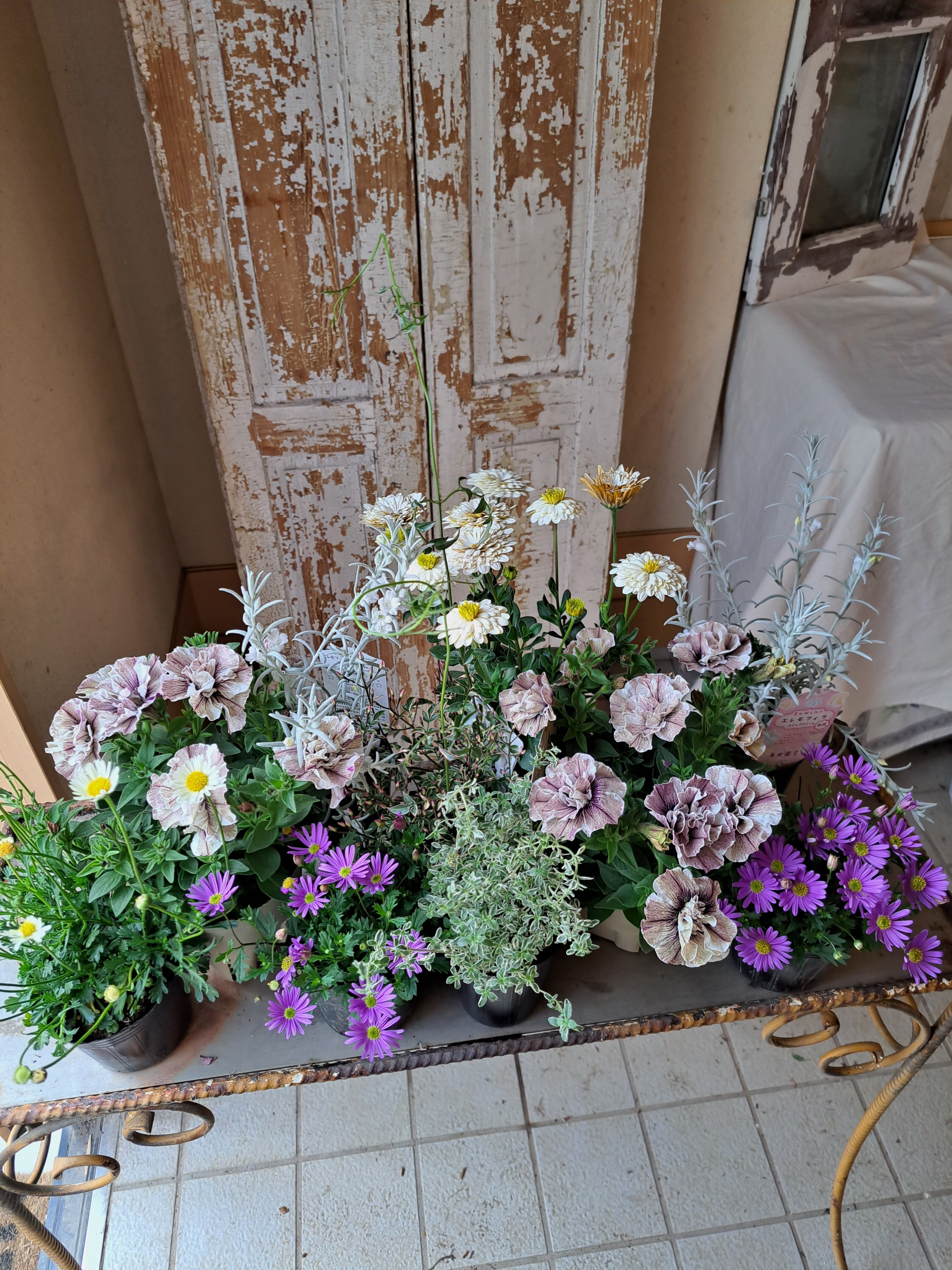 自分で作る花材セットです。花付き良く大株のペチュニアジュリエットモダンホワイト2とアンティークなオステオスペルマムリコッタ、白花エレモフィラ(2本植え)×2、ハゴロモジャスミンミルキーウェイ(3~4本植え)、シルバータイム(2本植え)、ブラキカムイエロー(2本植え)、ブラキカムリラ×2