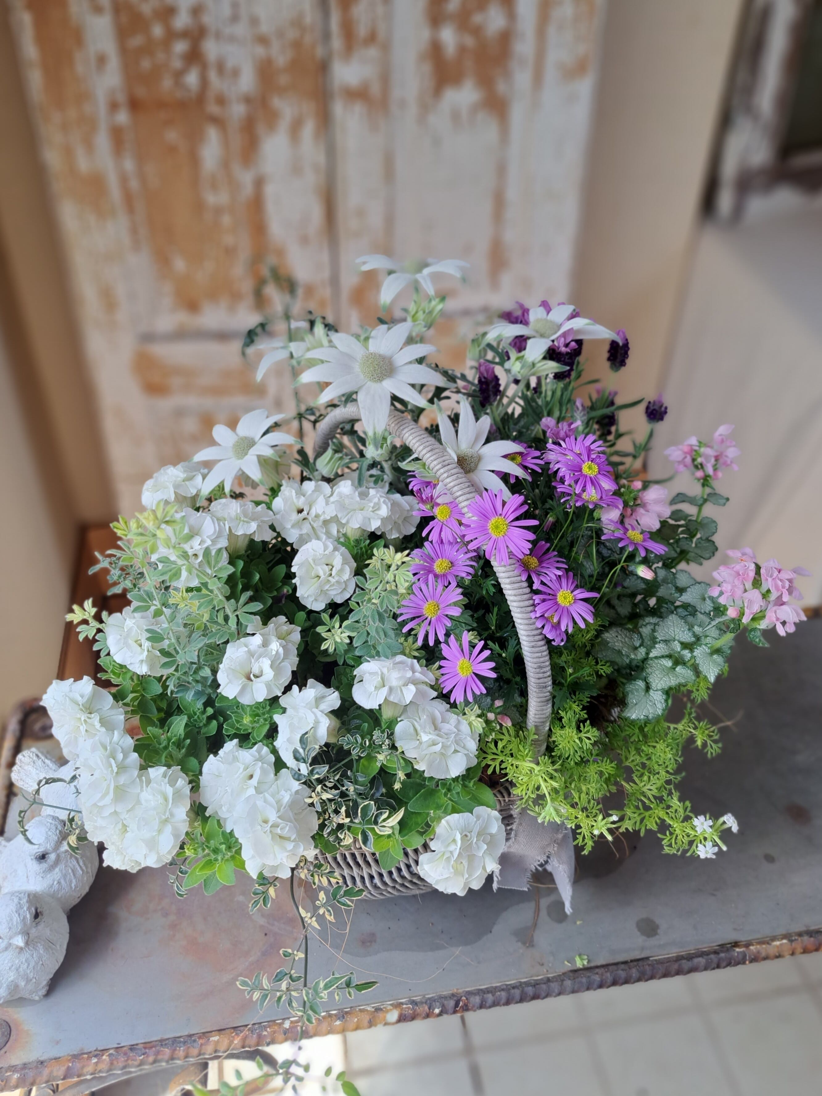 ピュアホワイトのフランネルフラワーと八重咲きペチュニアホイップマカロン、パープルのフレンチラベンダー、ブラキカムリラ、淡いピンクのラミウムラミブラッシュなど優しい色のお花をグリーンとあわせグレーの籠にギャザリングしました。ピュアホワイトのフランネルフラワーは秋にも咲く品種です。ホワイトのホイップマカロンは暴れにくくこんもりとまとまり良く咲きます。ラミウムラミブラッシュはシルバーリーフとピンクの花が楽しめます。グリーンにはロータスプリムストン、ハゴロモジャスミンミルキーウェイ、バーベナテネラをあわせました。グレーの籠はポリプロピレン製で水や汚れに強く、丈夫なので長く使っていただけます。ふんわりとナチュラルな花籠の寄せ植えです。少し早い母の日のプレゼントにいかがでしょうか?
