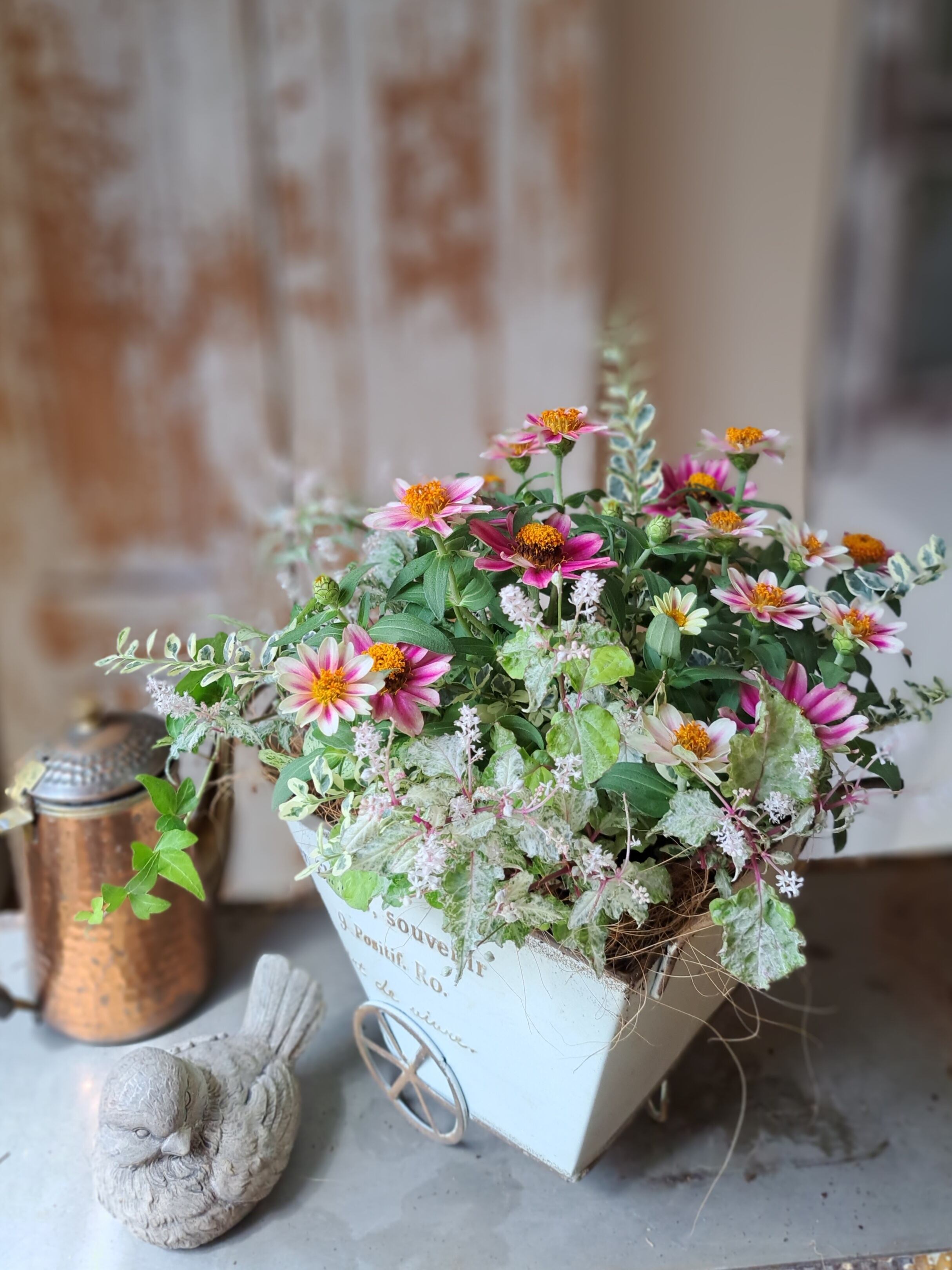 秋、これから色鮮やかになるジニアをかわいいブリキのワゴン型プランターへ植え込みました。