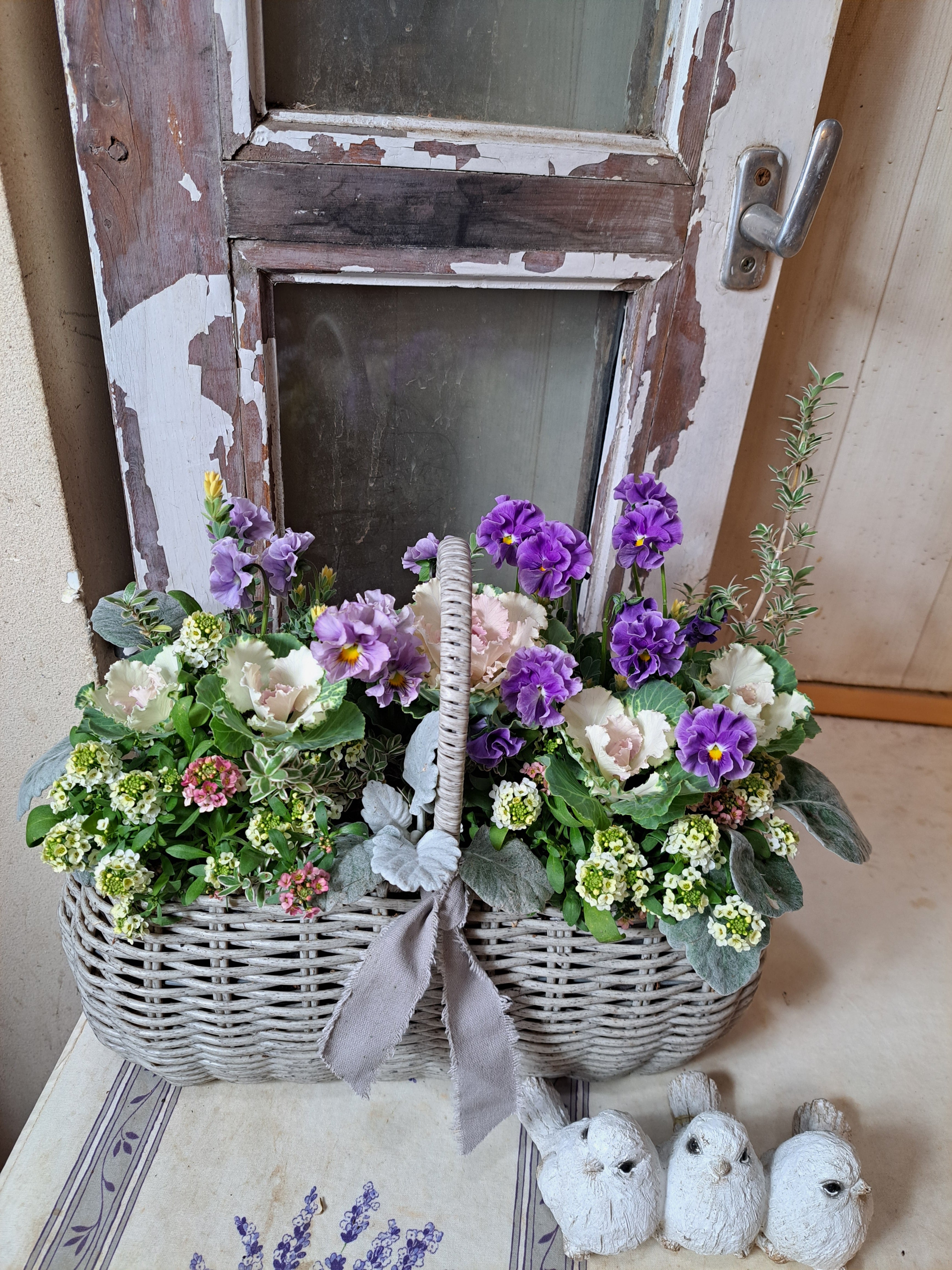 ブルーグレーのフリルビオラとハボタンの花籠ギャザリング