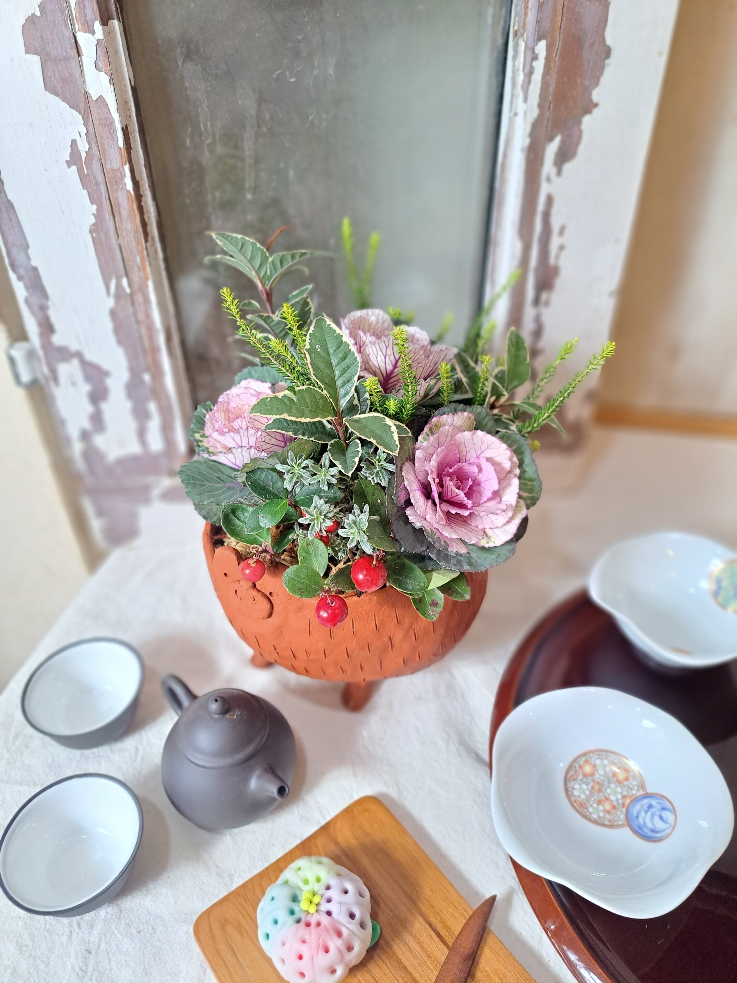 陶芸作家「そらいろ工房」さんとのコラボ企画。アニマルのモチーフがかわいい素焼き鉢にミニハボタン、カラーリーフ、赤い実のチェッカーベリーなどをワンユニットギャザリングで植え込みしました。アニマル素焼き鉢は通気性、排水性もよく、乾くと色が薄くなるのでお水やりのタイミングがわかりやすいく育てやすい設計です。グリーンが中心なので明るい室内などでも飾っていただけます。植え込んだ植物が終わると多肉などを育てていただいてもぴったりです。作家さんハンドメイドのかわいいアニマルお正月鉢でほっこり癒しのお正月をお迎えください。